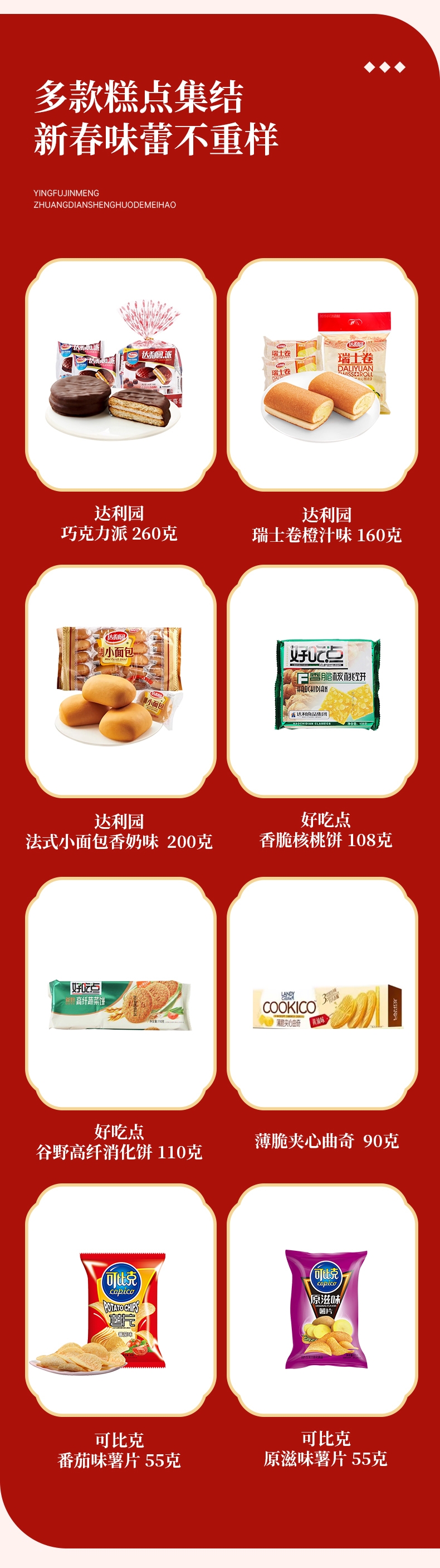 配置清单:达利园法式小面包 200克 达利园瑞士卷 160克 达利园巧克力派 260克 好吃点香脆核桃饼 108克 好吃点谷野高纤消化饼 110克 薄脆夹心曲奇 90克 可比克番茄味薯片 55克 可比克原滋味薯片 55克