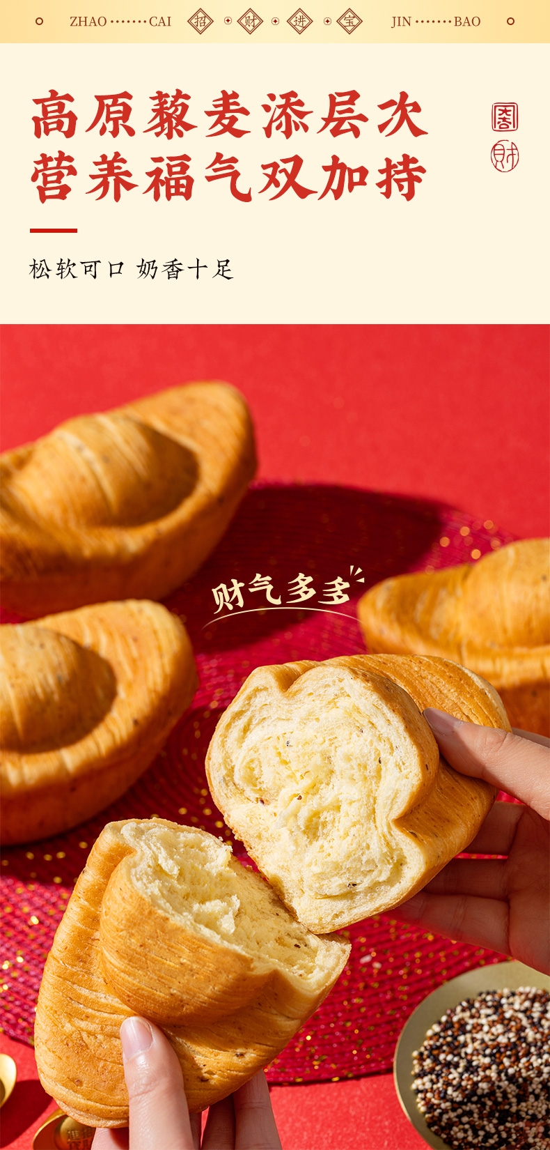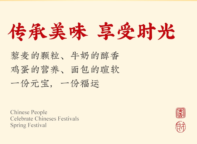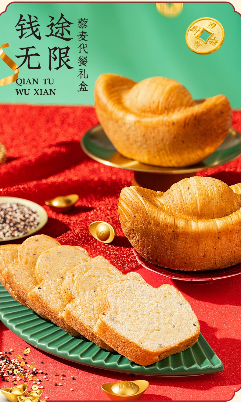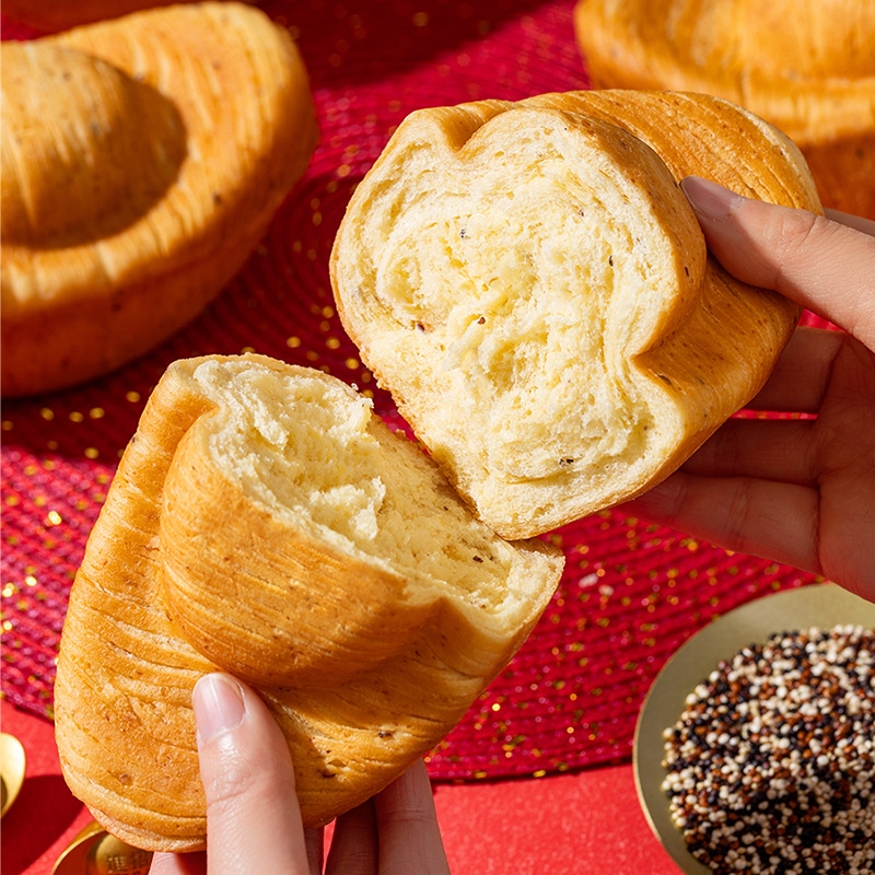 纯牛奶和面,使得面包体组织更加细腻,奶香浓郁;不添加香精色素防腐剂,老少皆宜,食用更放心;契合新春等节日礼品场景,创新加入东乡藜麦,提升营养
