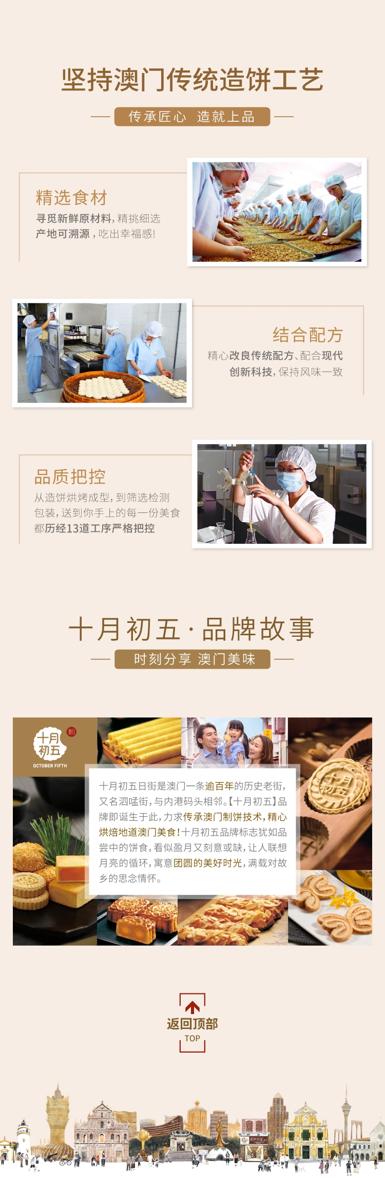 十月初五饼家以传统做饼手艺起家;保留炭烤香味,匠心烘焙澳门地道饼食;与世界共享,让每一口都是对澳门记忆的现代诠释。