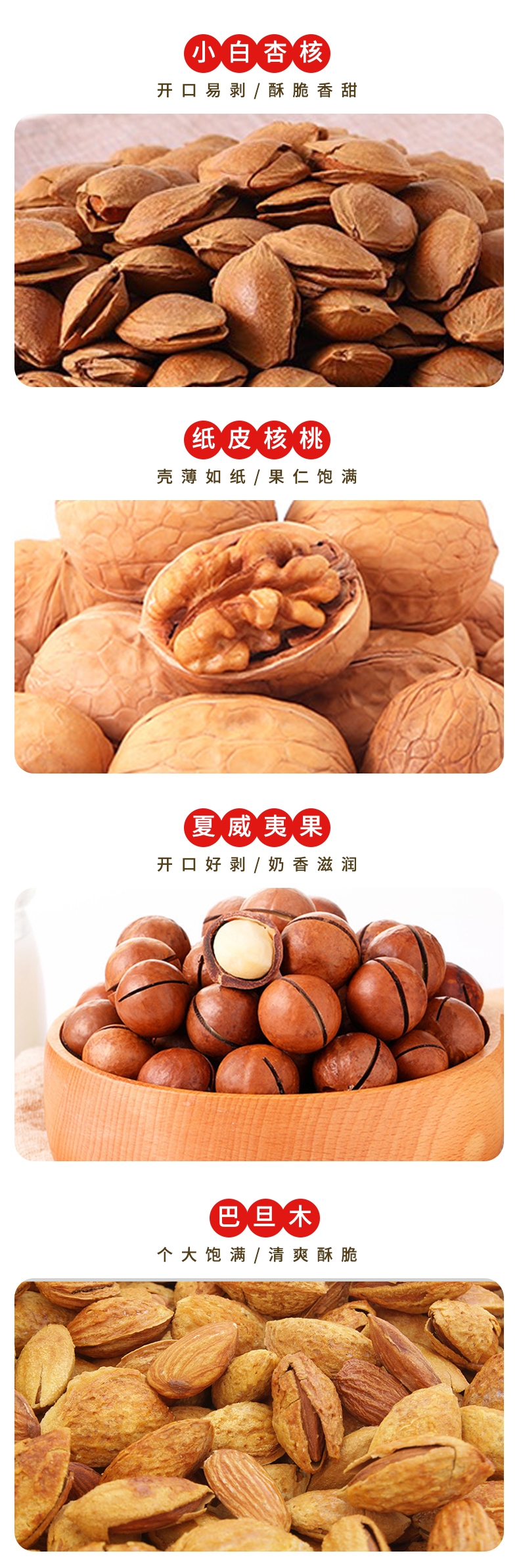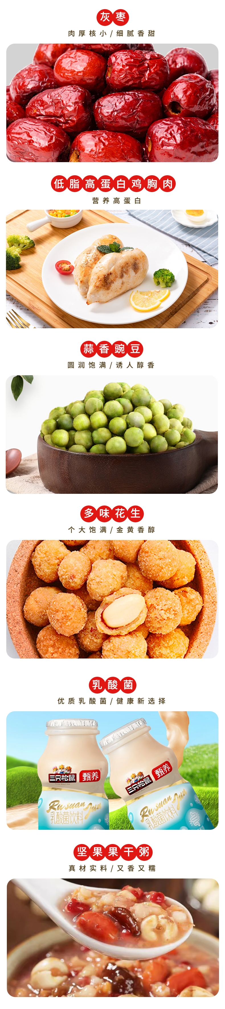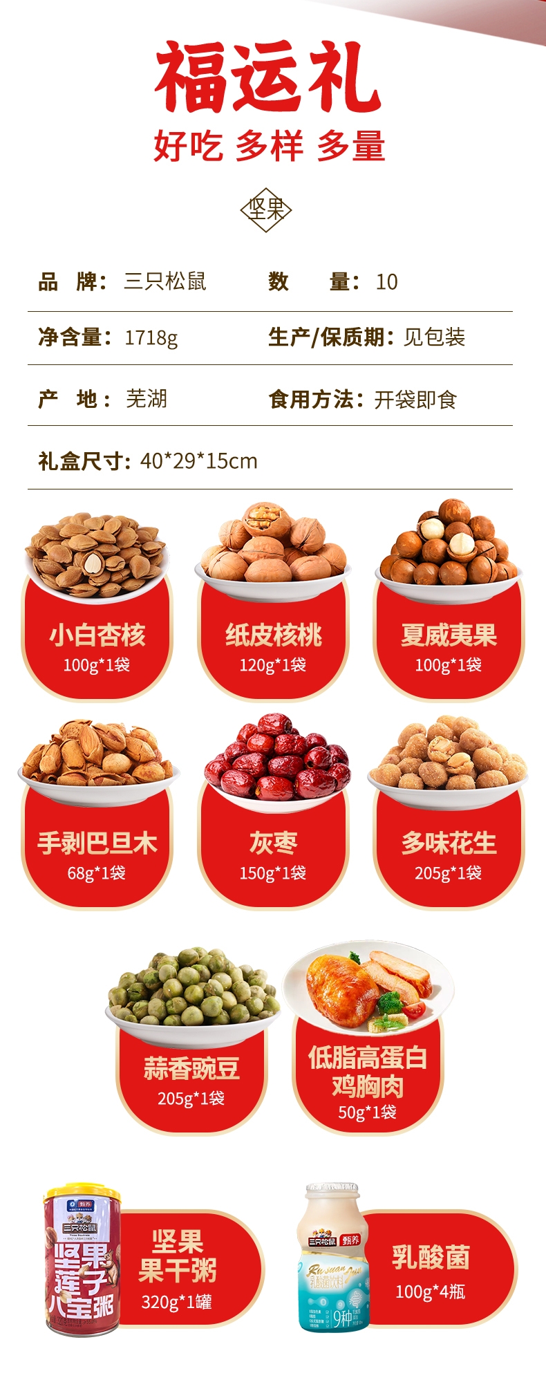 配置清单:【三只松鼠】夏威夷果100g 【三只松鼠】小白杏核100g 【三只松鼠】纸皮核桃120g 【三只松鼠】手剥巴旦木68g 【三只松鼠】灰枣150g 【三只松鼠】多味花生205g 【三只松鼠】蒜香豌豆205g 【三只松鼠】低脂高蛋白鸡胸肉50g 【三只松鼠】坚果八宝粥320g 【三只松鼠】乳酸菌100g*4瓶