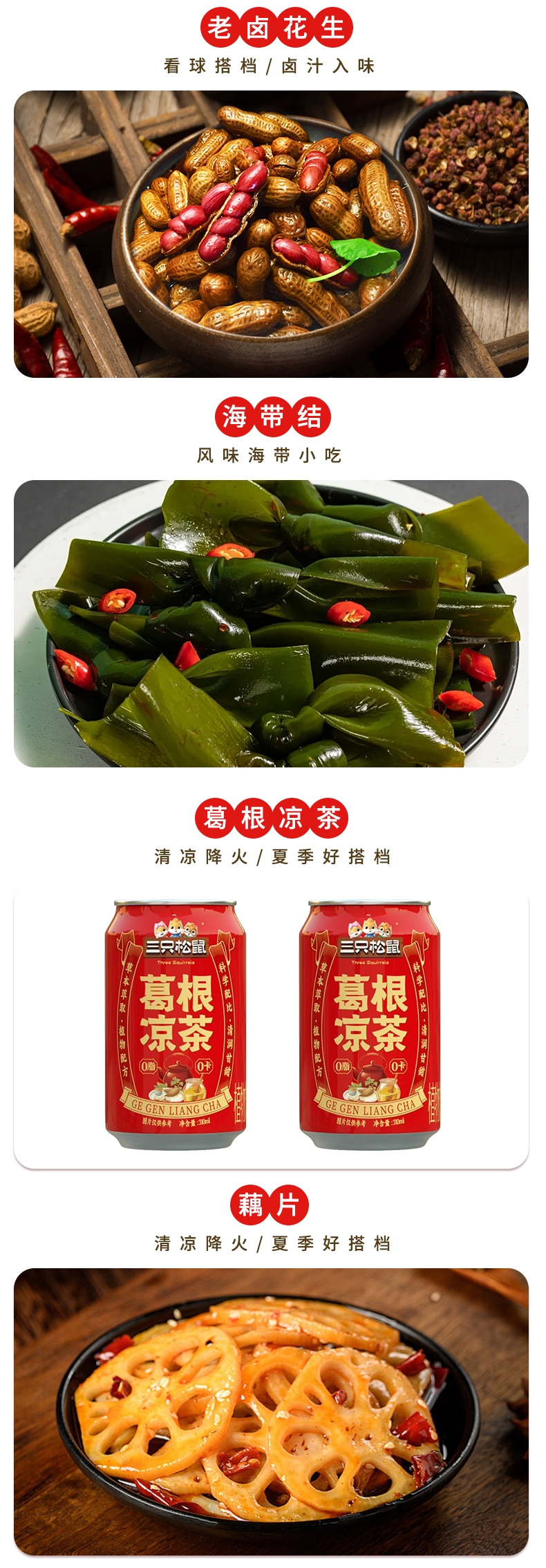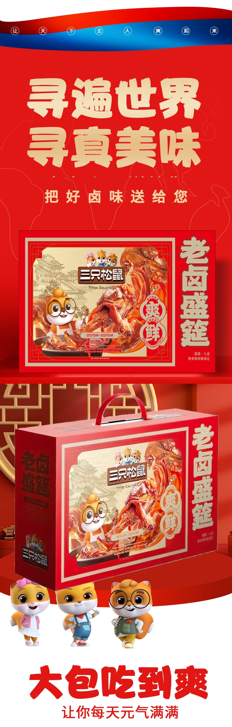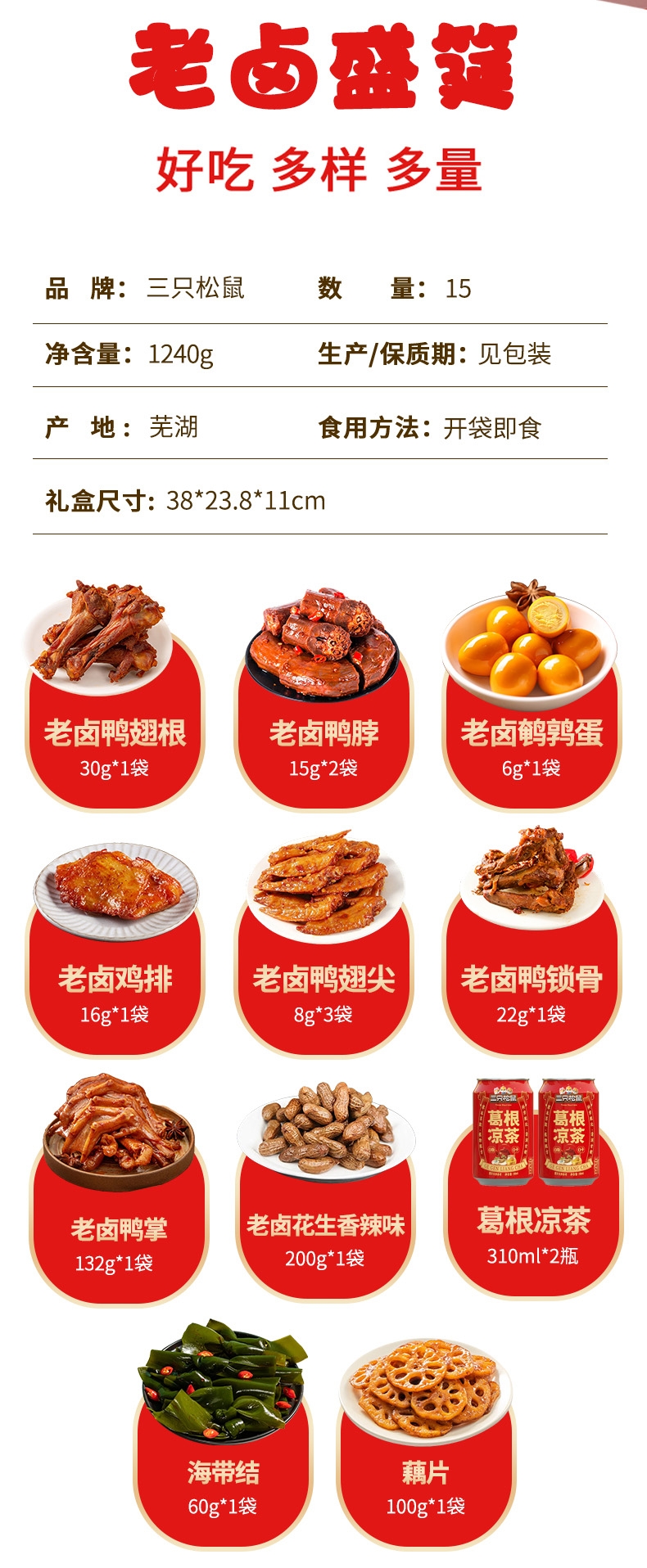 配置清单:【三只松鼠】老卤鸭翅根30g*1 【三只松鼠】老卤鸭脖15g*2 【三只松鼠】老卤鹌鹑蛋6g*1 【三只松鼠】老卤鸡排16g*1 【三只松鼠】老卤鸭翅尖(单根装)8g*3 【三只松鼠】老卤鸭锁骨22g*1 【三只松鼠】老卤花生香辣味200g*1 【三只松鼠】海带结60g 【三只松鼠】藕片100g 【三只松鼠】老卤鸭掌132g*1 【三只松鼠】葛根凉茶310ml*2