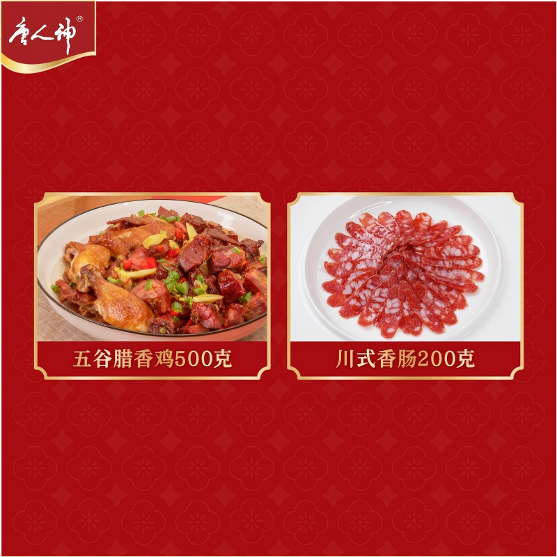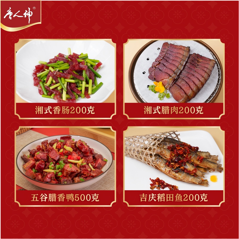 配置清单:湘式香肠200克 湖南腊肉200克 五谷腊香鸭500克 吉庆稻田鱼200克 腊鸡500克 川式香肠200克