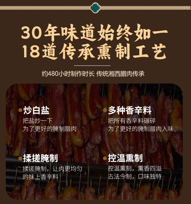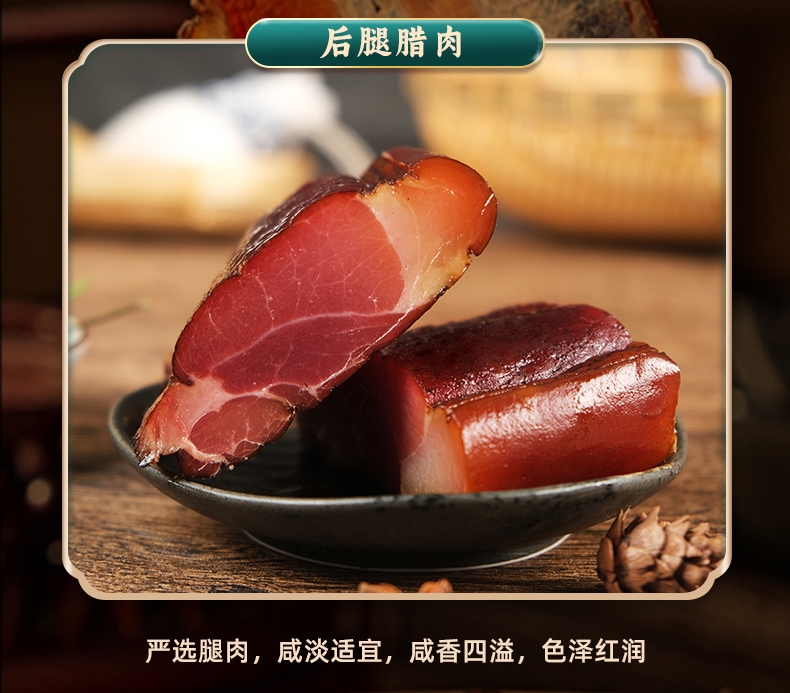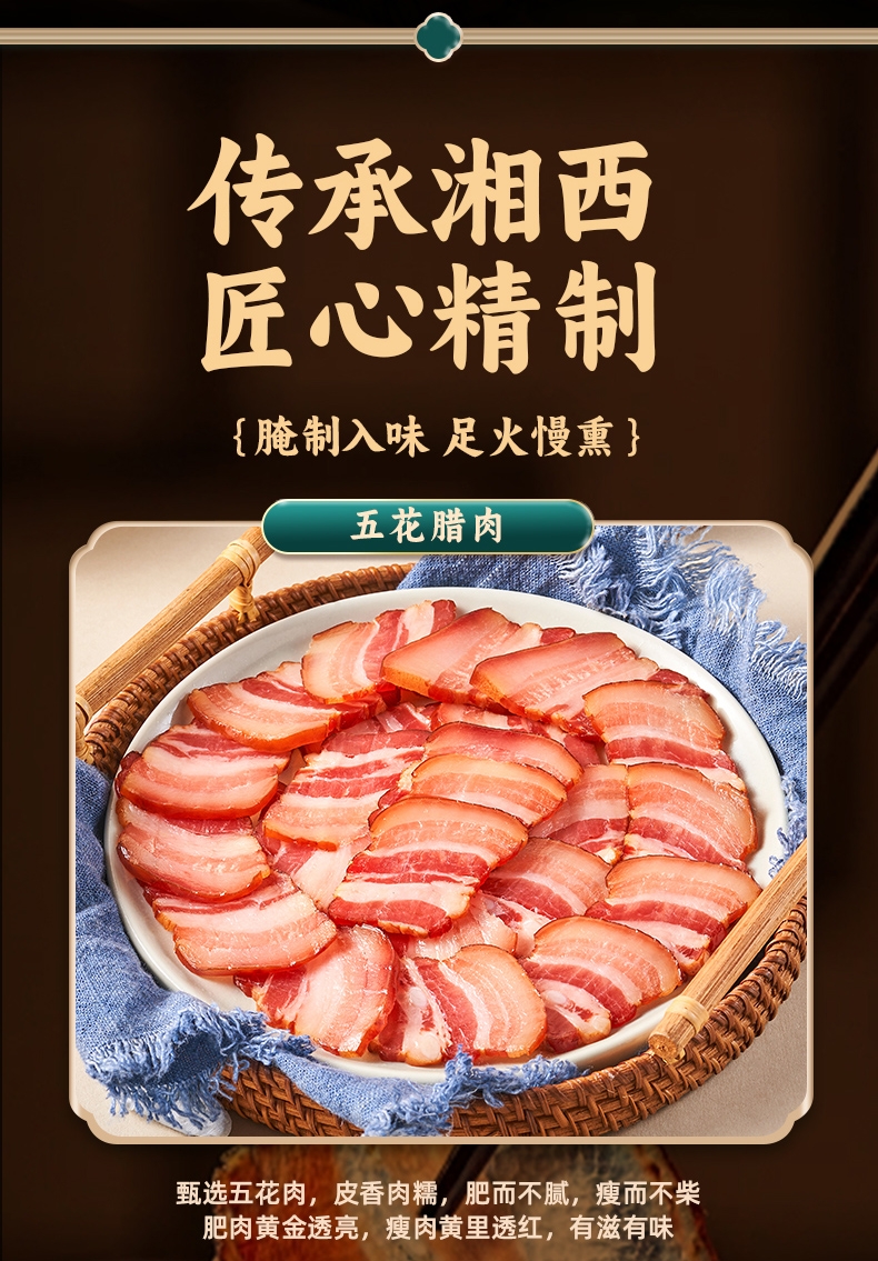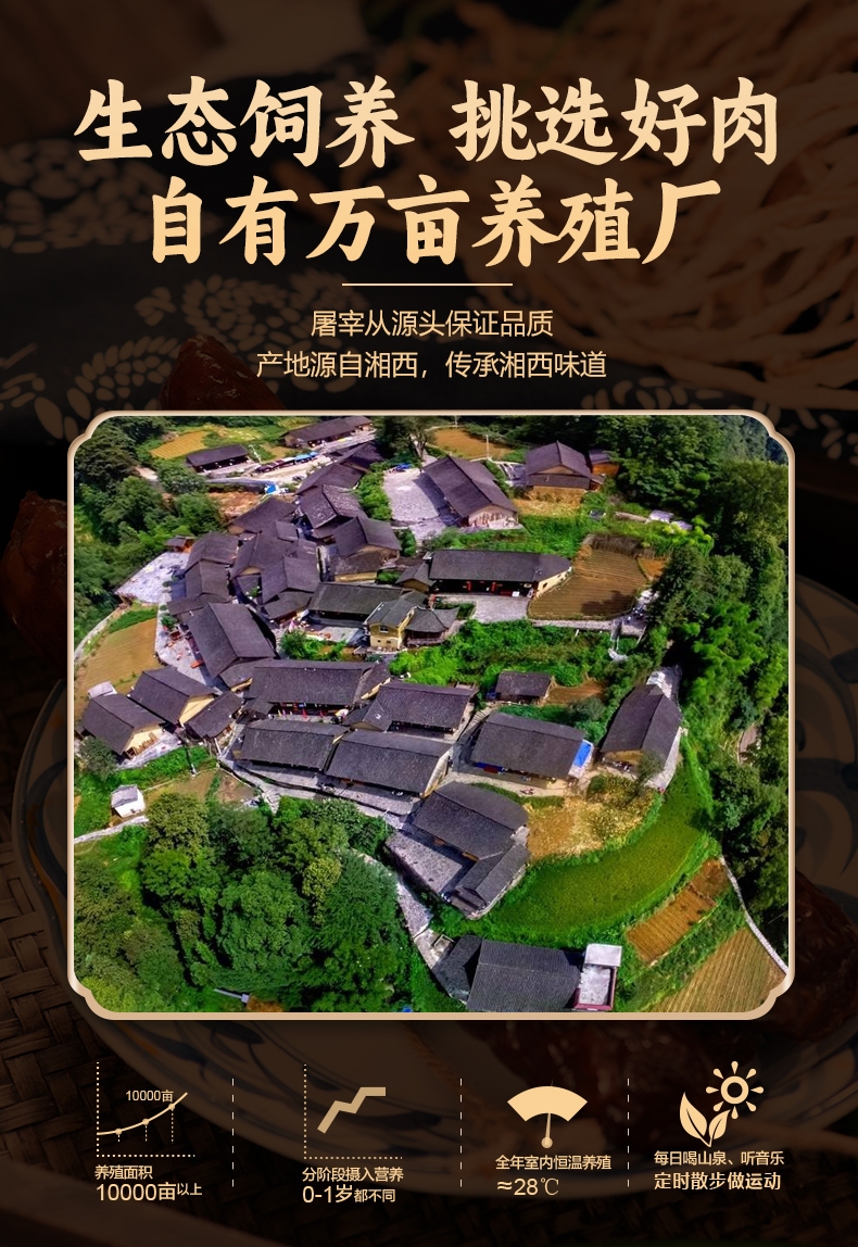 礼遇湖南 地道湘西腊 传承湖南香;生态饲养 挑选好肉 自有万亩养殖厂;屠宰从源头保证品质产地源自湘西,传承湘西味道