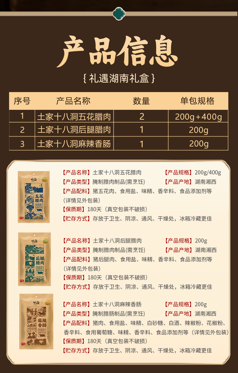 配置清单:土家十八洞五花腊肉400克 土家十八洞五花腊肉200克 土家十八洞后腿腊肉200克 土家十八洞麻辣香肠200克