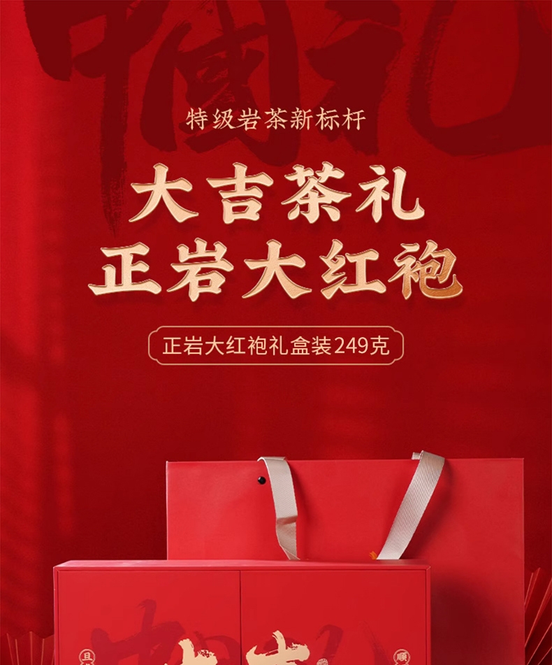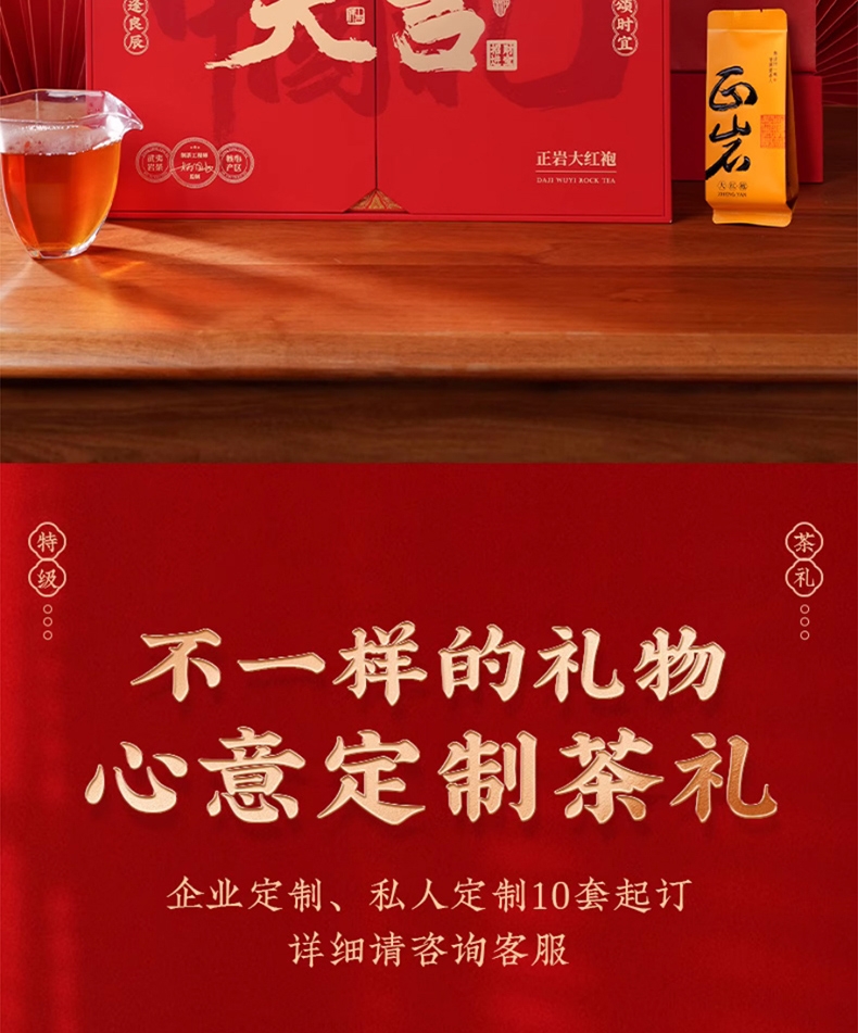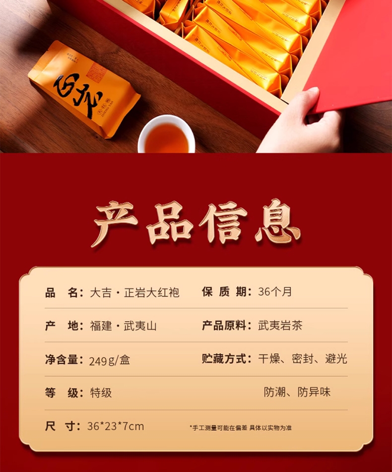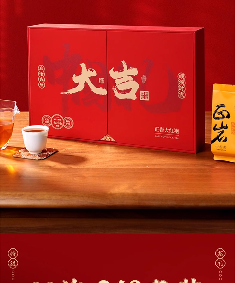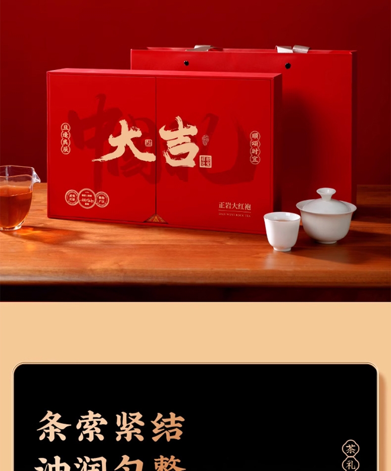 产自武夷山高山产区,原料优中选优;岩骨花香伴有栀子花香,醇厚顺滑,手工制作,古法烘焙;喜庆的大吉中国礼茶礼,走亲访友必备款伴手礼