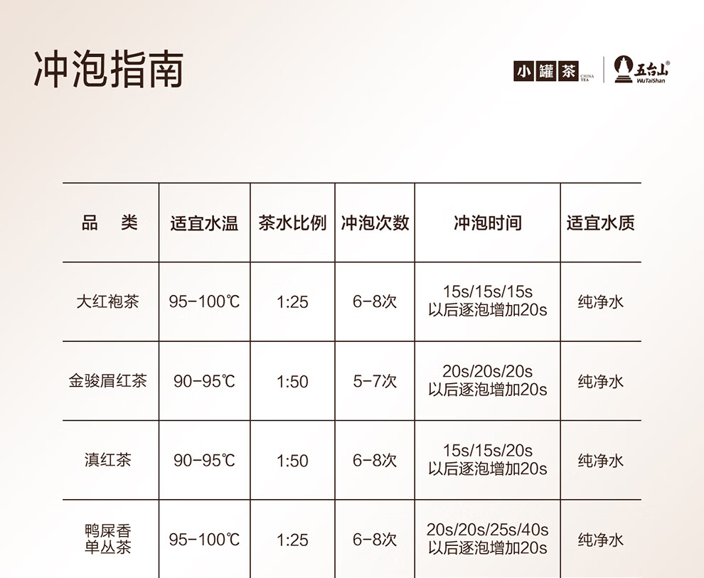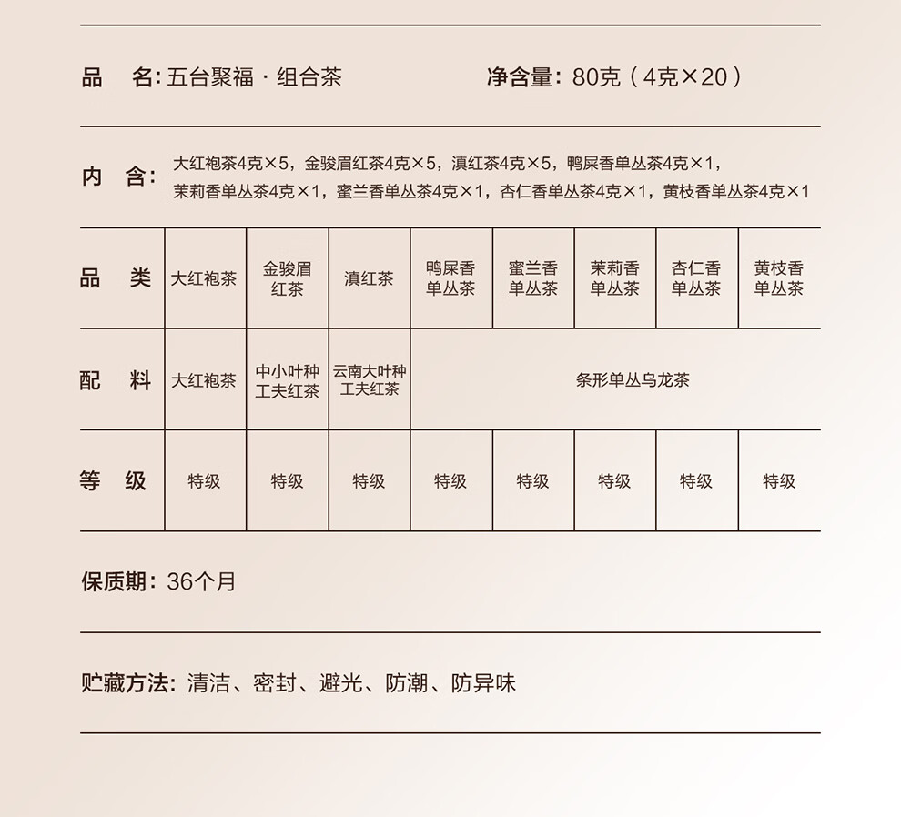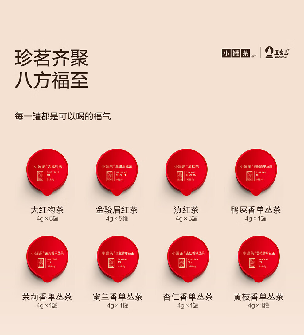 配置清单:大红袍茶4g *5罐 、 金骏眉红茶4g *5罐 、 滇红茶4g *5罐 、 鸭屎香单丛茶4g *1罐 茉莉香单丛茶4g *1罐 蜜兰香单丛茶4g *1罐 杏仁香单丛茶4g *1罐 黄枝香单丛茶4g *1罐