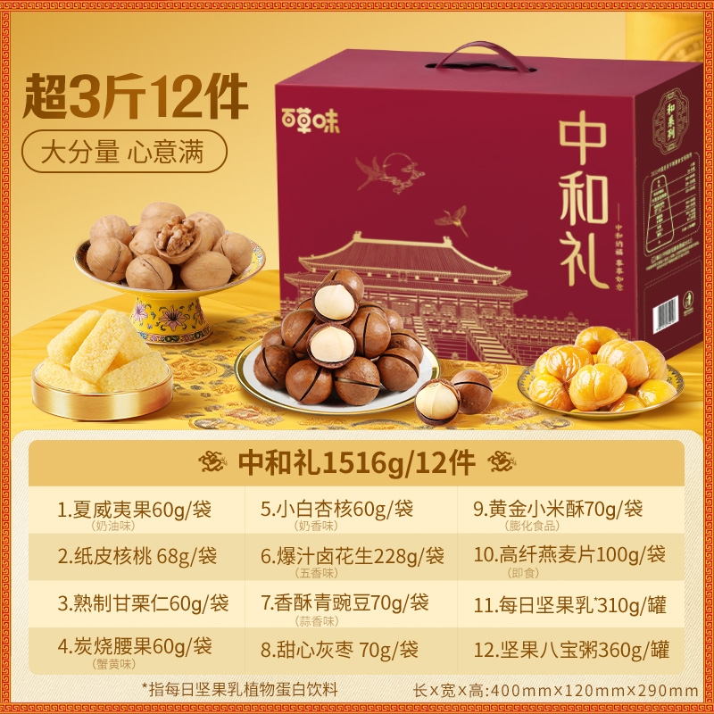 配置清单:【百草味】夏威夷果(奶油味) 60g 【百草味】纸皮核桃 68g 【百草味】熟制板栗仁 60g 【百草味】炭烧腰果(蟹黄味)60g 【百草味】小白杏核(奶香味)60g 【百草味】爆汁卤花生(五香味)228g 【百草味】香酥小豌豆(蒜香味) 70g 【百草味】甜心灰枣 70g 【百草味】黄金小米酥(膨化食品)70g 【百草味】燕麦片(原味)100g 【百草味】每日坚果乳 310g 【百草味】坚果八宝粥360g