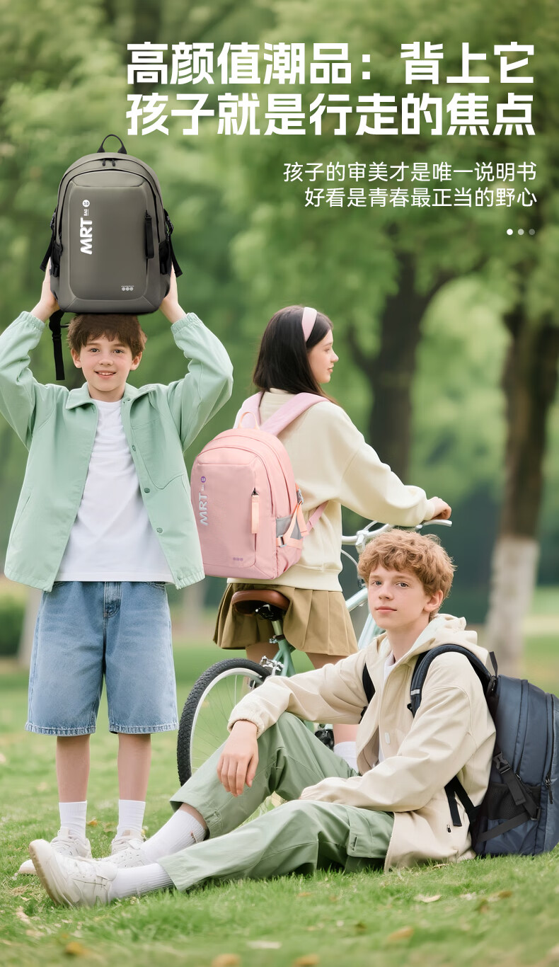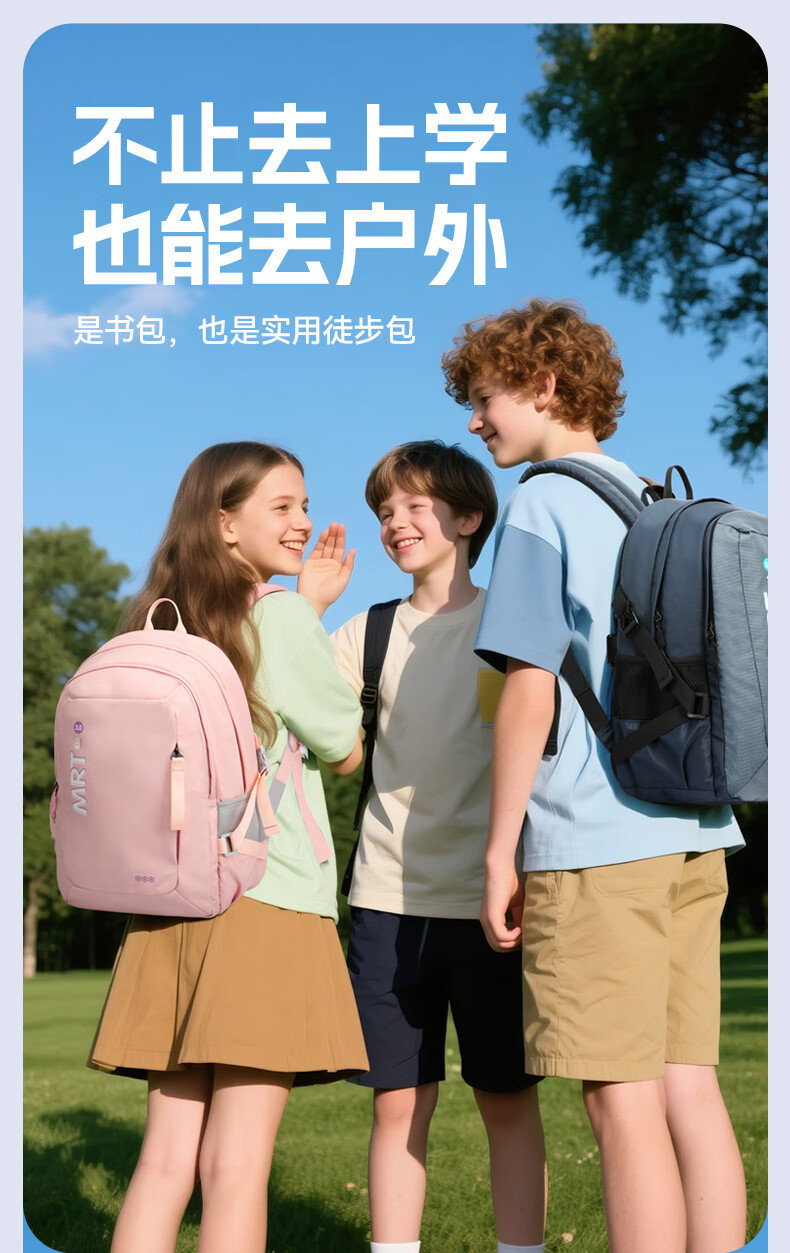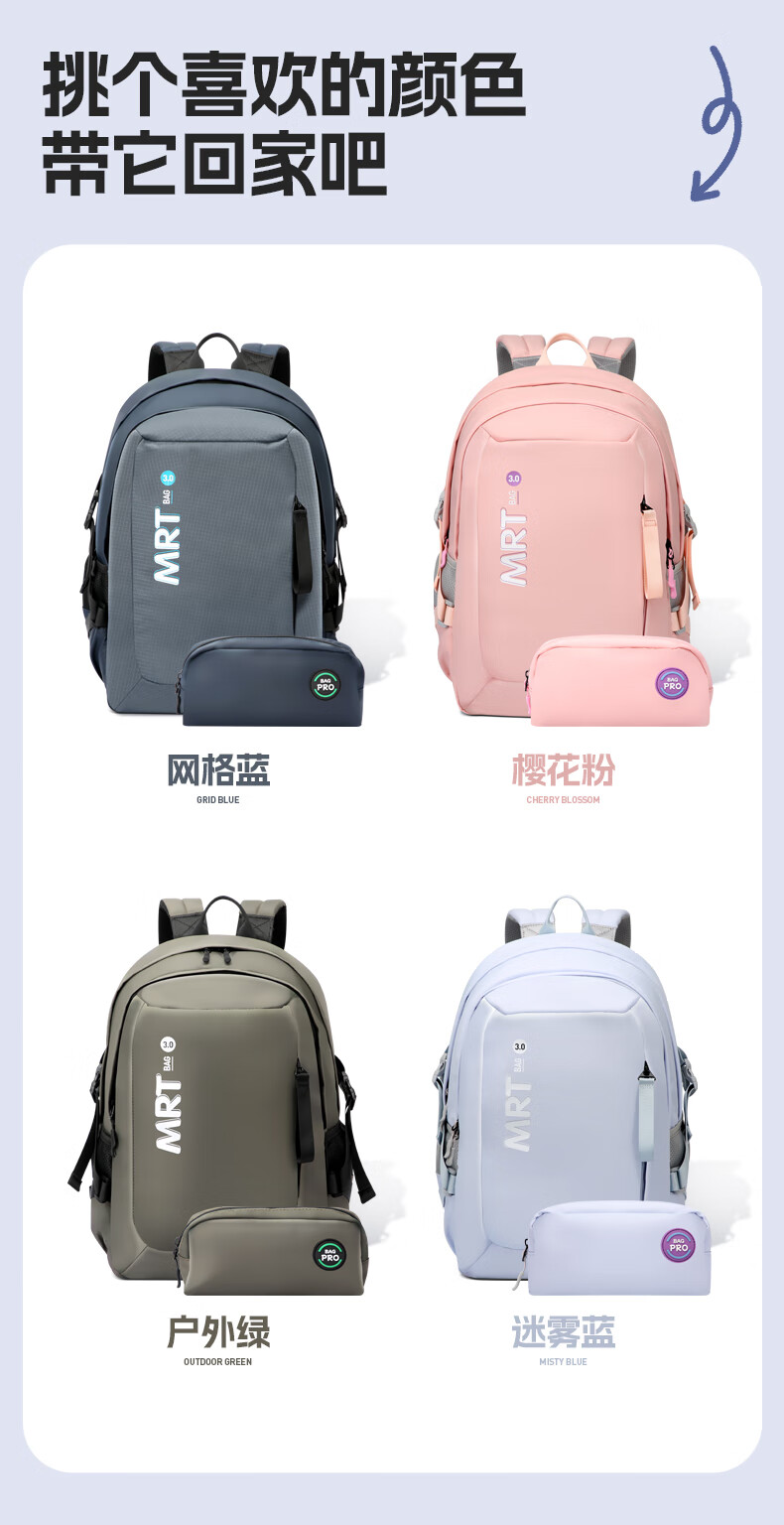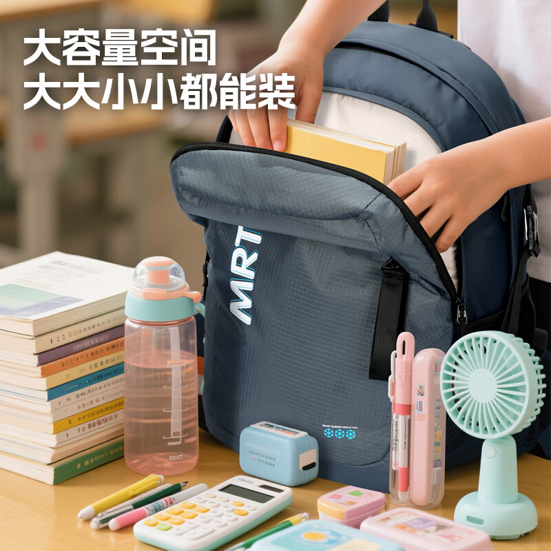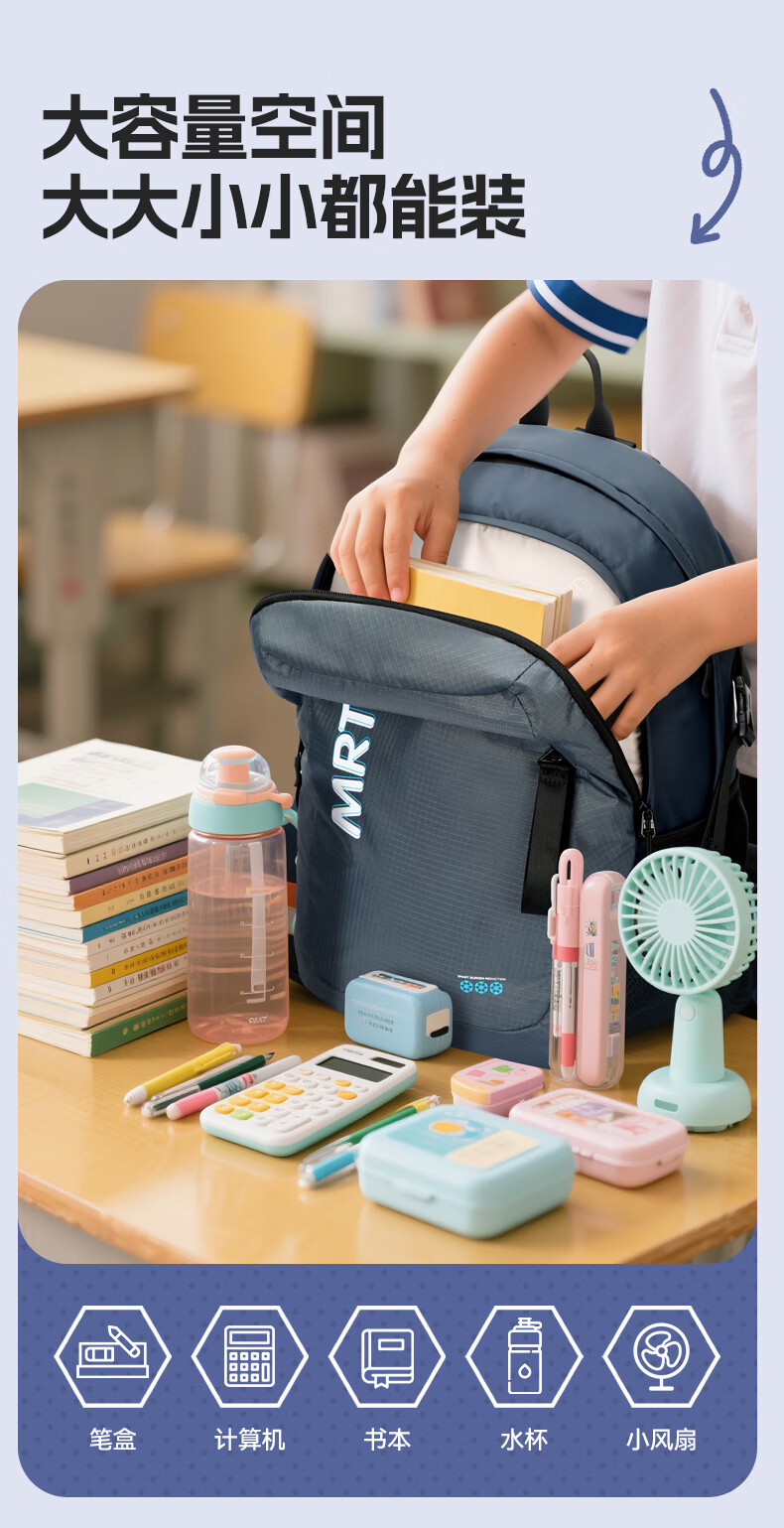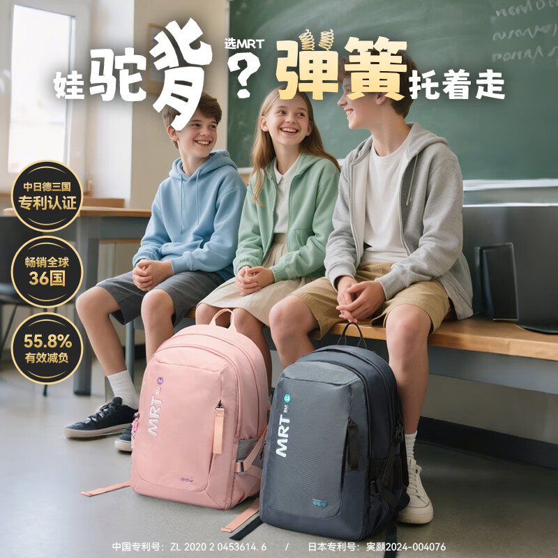 MRT科学减负系统,让成长举重若轻;护脊+弹簧卸力,撑住追梦者的腰杆;大容量大空间,大大小小都能装