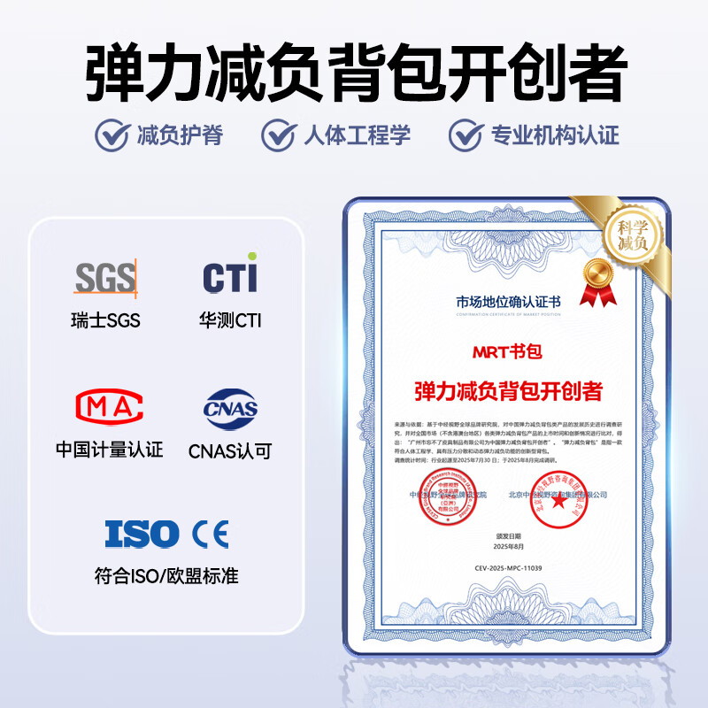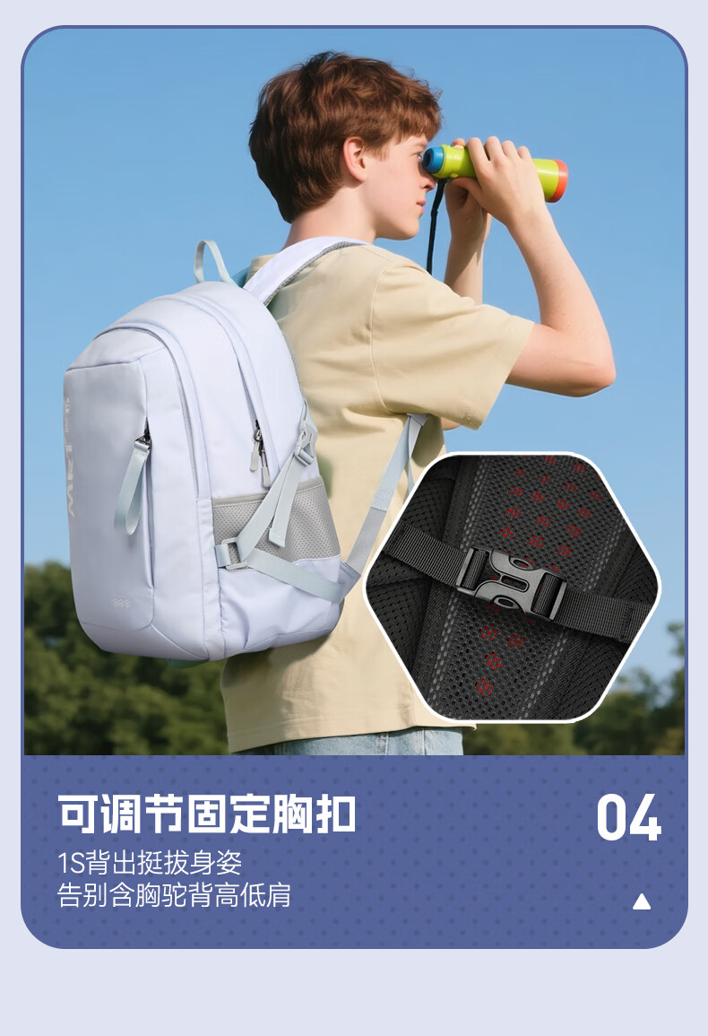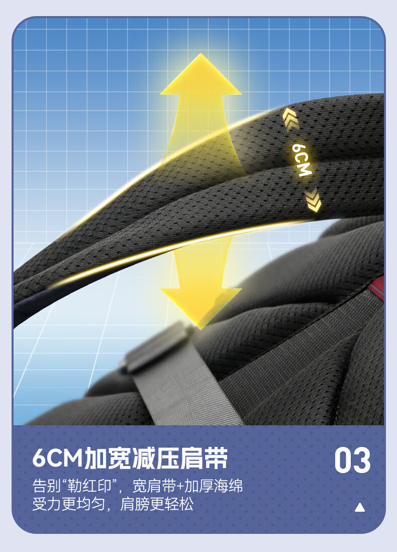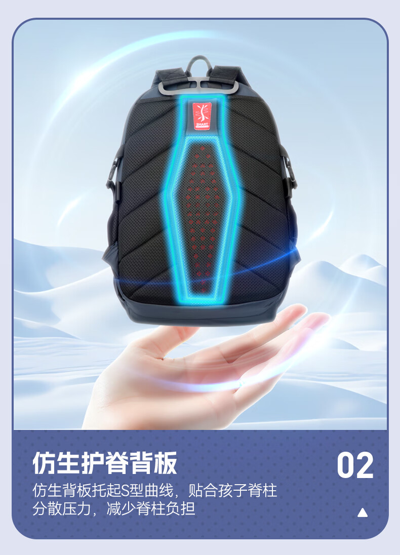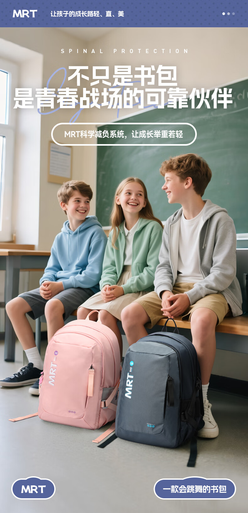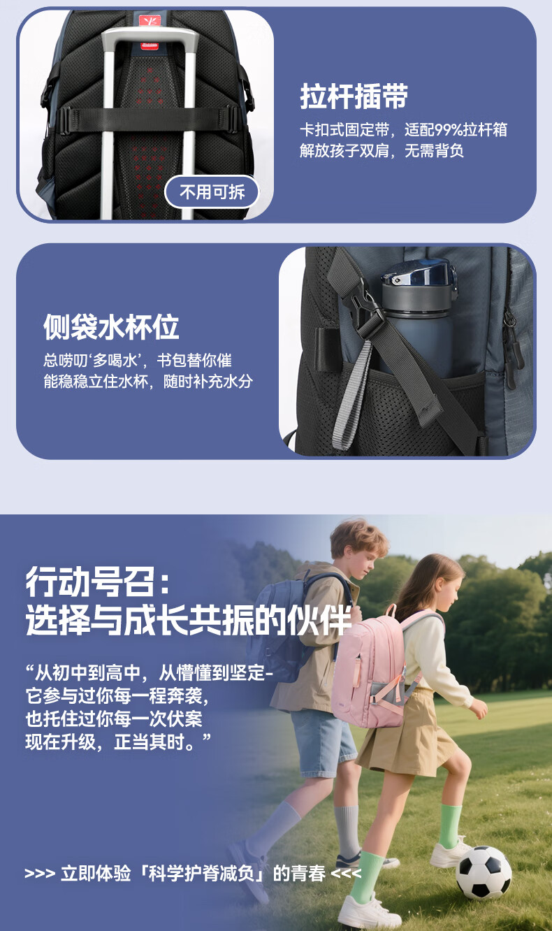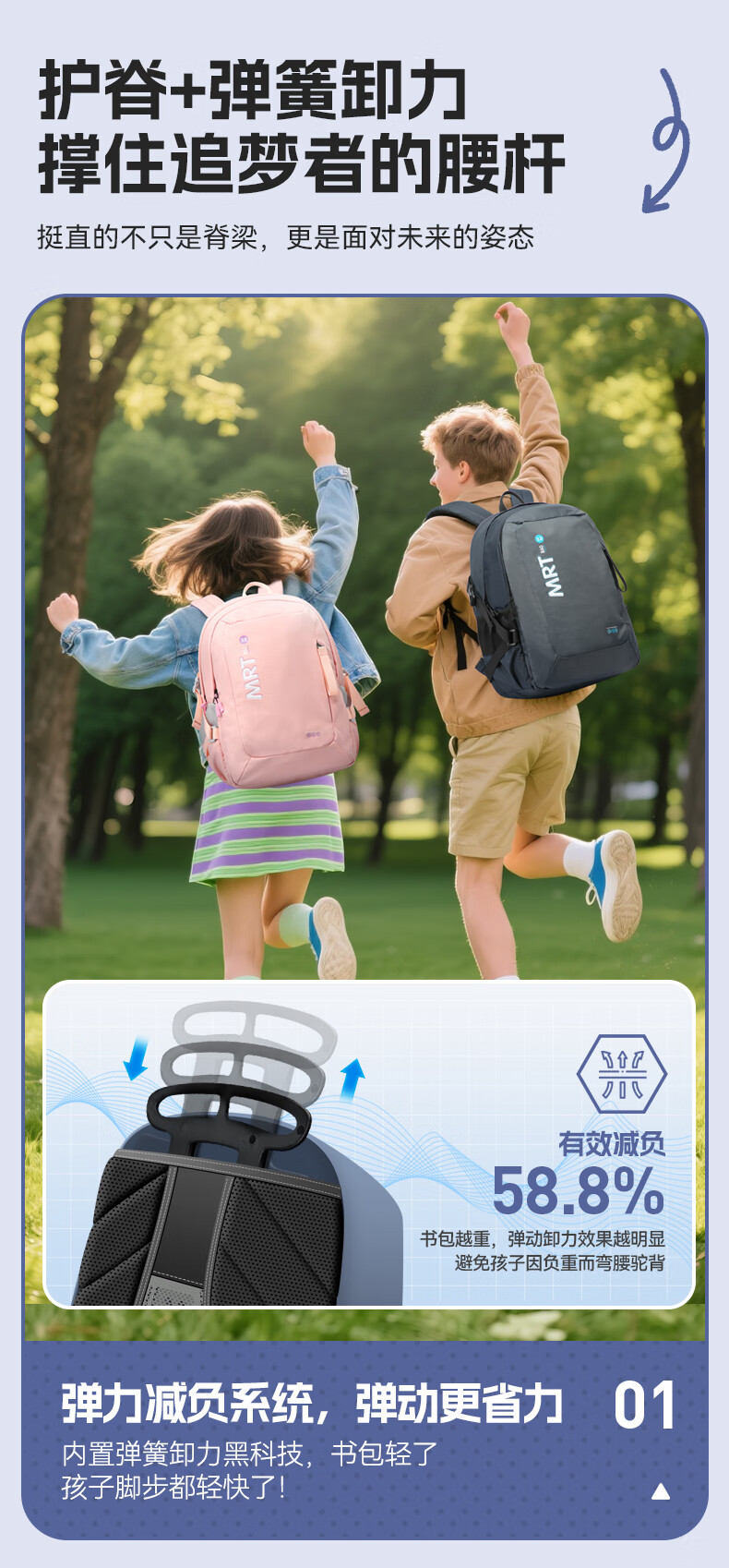 MRT科学减负系统,让成长举重若轻;护脊+弹簧卸力,撑住追梦者的腰杆;大容量大空间,大大小小都能装