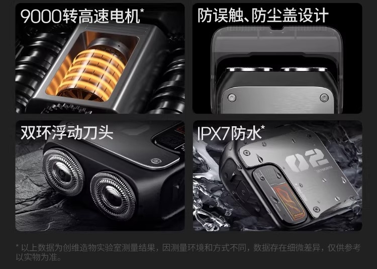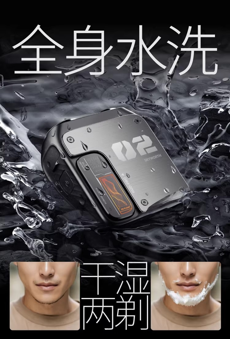 全身水洗,IPX7级防水;TYPE-C极速快充;充电1.5小时,使用60天;干湿两剃