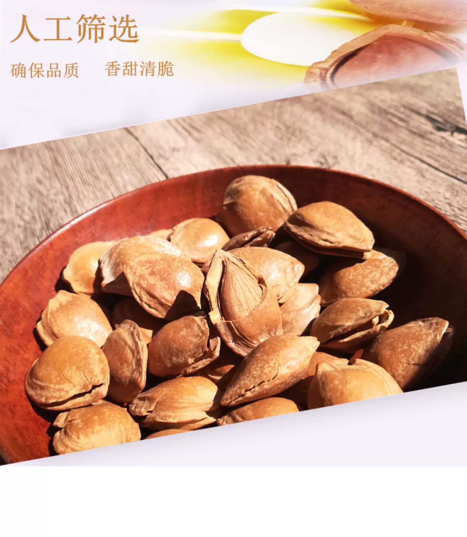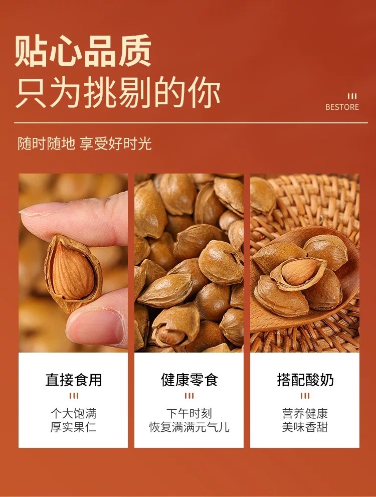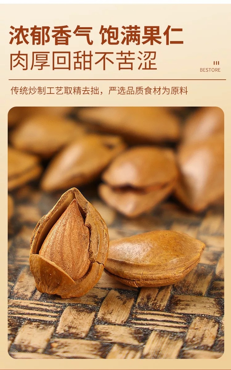 饱满颗粒杏核、个大饱满圆润;经典原味自然健康、浓郁香气饱满果仁;肉厚回甜不苦涩