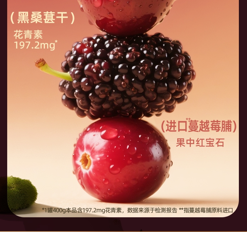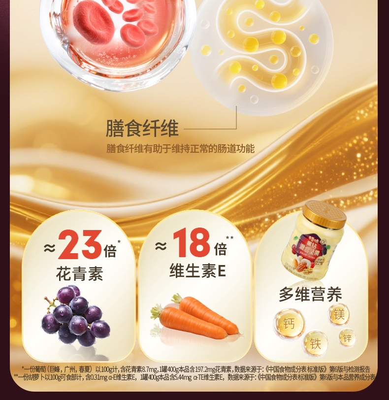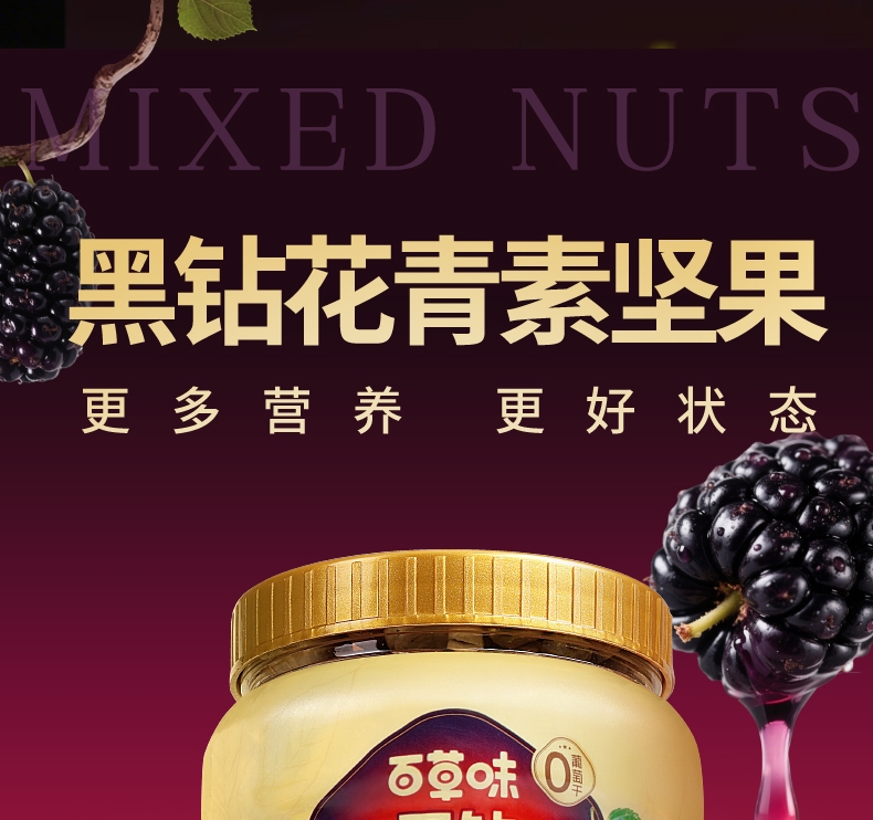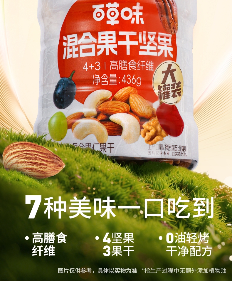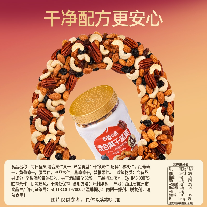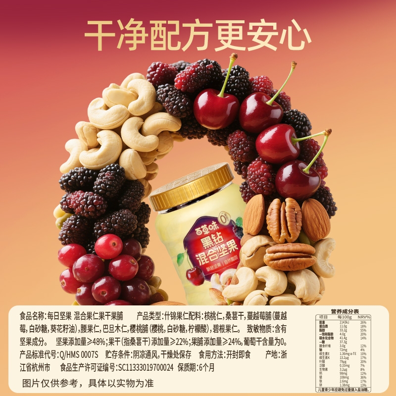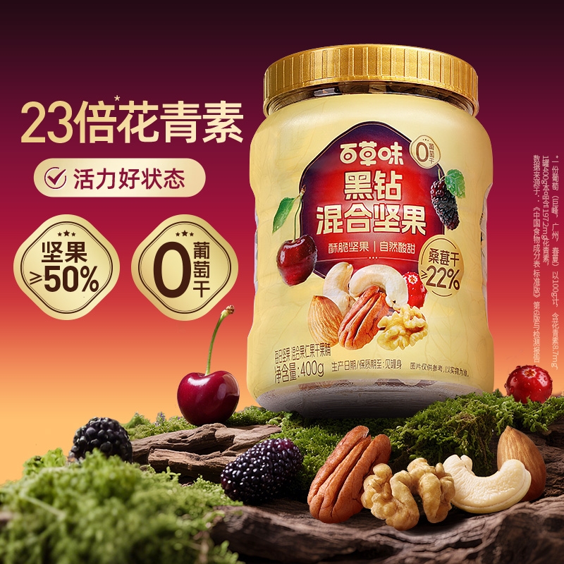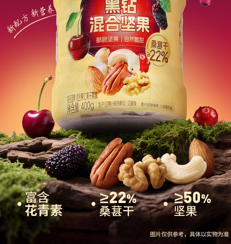 配置清单:黑钻混合坚果400g,0葡萄干配方,添加22%桑葚 干及红宝石蔓越莓、红樱桃,满满花青素;混合果干坚果(4+3)436g,4坚果+3果干,高膳食纤维,0油烘烤,干净配方