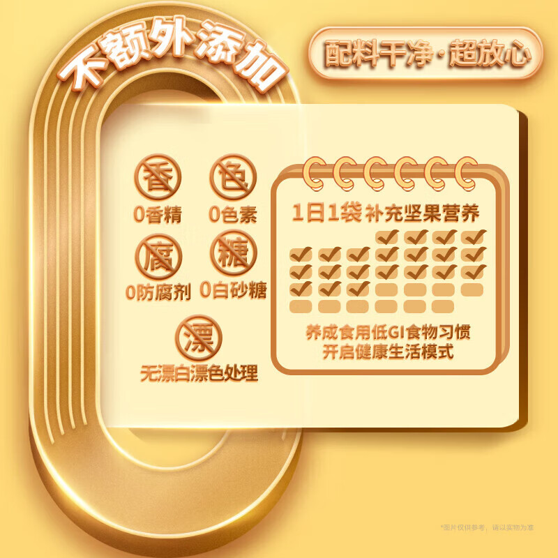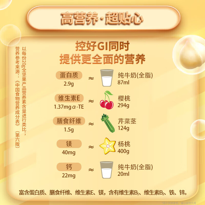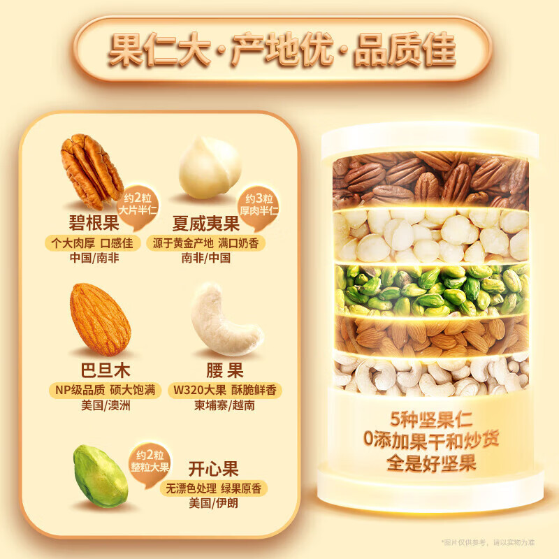100%当季采摘坚果;瑞士工艺,精准烘烤,酥脆口感;奶粉般保鲜包装,含氧量<1%