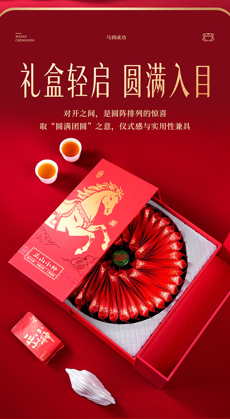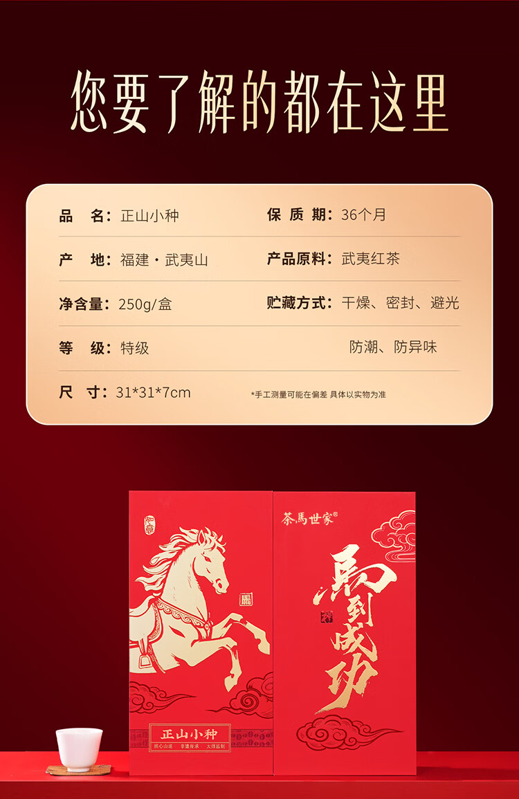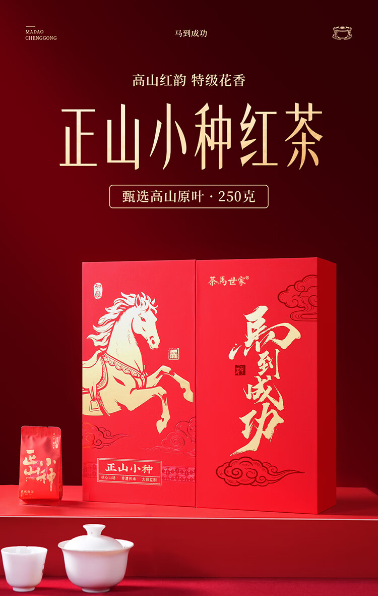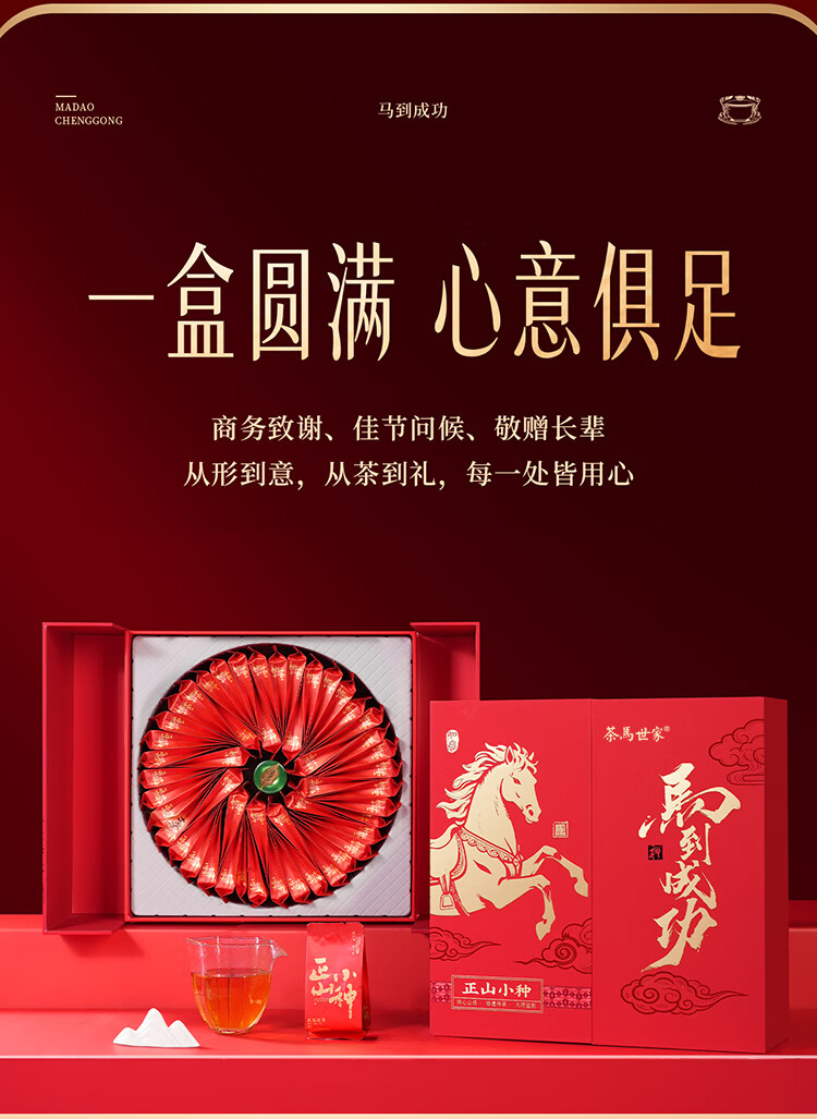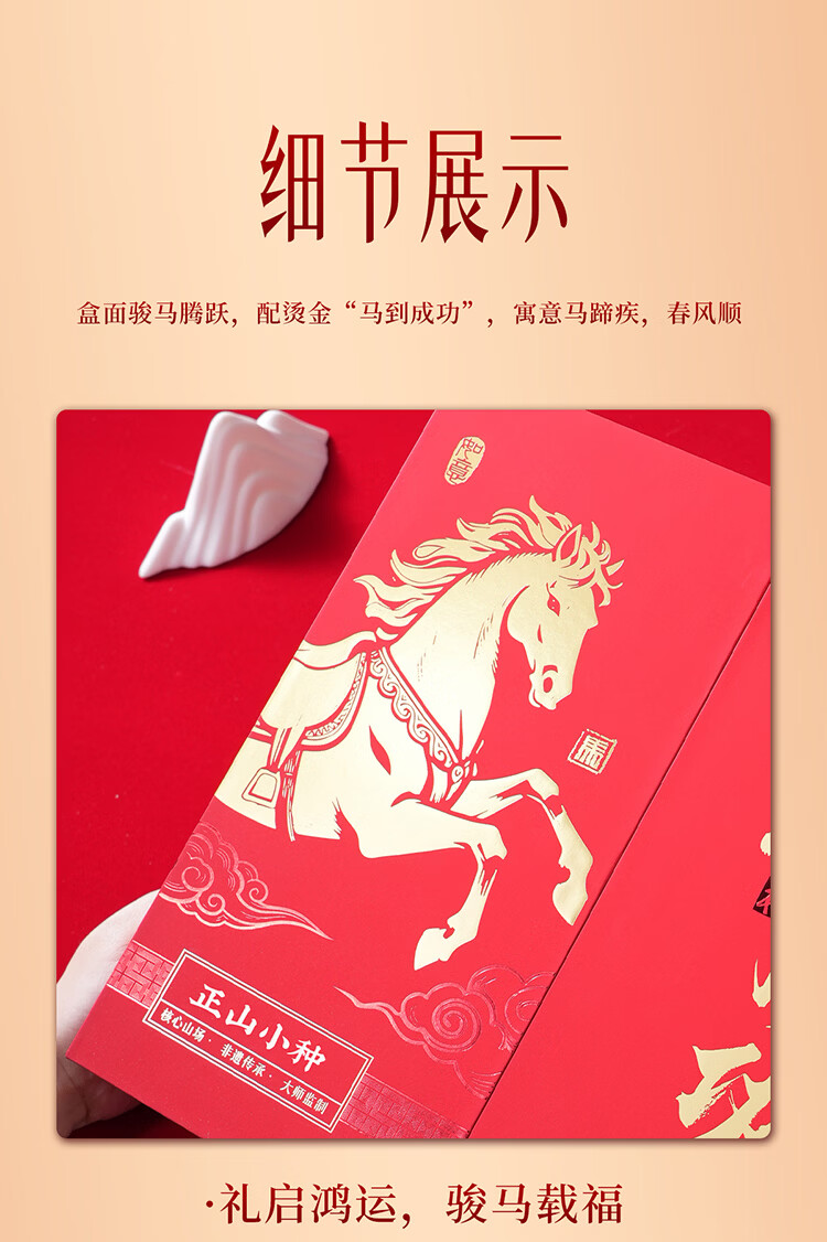 马到成功吉祥茶礼,佳节走亲访友必备款伴手礼;武夷山高山茶园,不打农药,不撒肥,真正自然生态好茶;坚持武夷红茶制作工艺,从采摘到制作,只为一杯好茶
