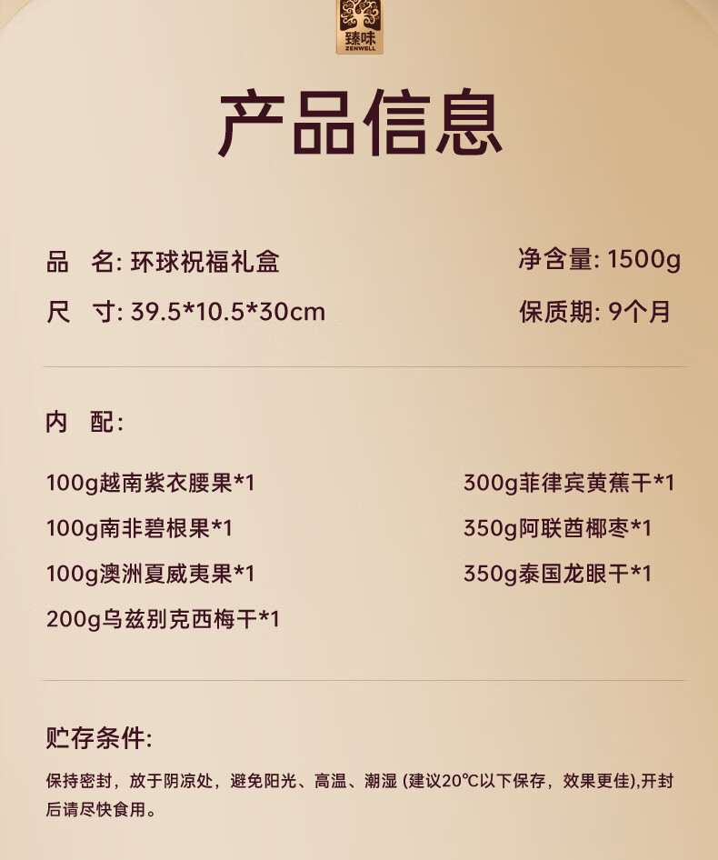 配置:100g越南紫衣腰果*1 100g南非碧根果*1 100g澳洲夏威夷果*1 200g乌兹别克西梅干*1 300g菲律宾黄蕉干*1 350g阿联酋椰枣*1 350g泰国龙眼干*1