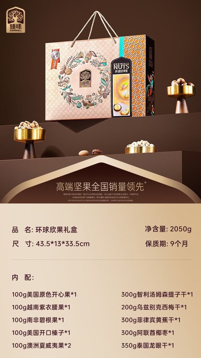 配置:100g美国原色开心果*1 100g越南紫衣腰果*1 100g南非碧根果*1 100g美国开口榛子*1 100g澳洲夏威夷果*2 300g智利汤姆森提子干*1 200g乌兹别克西梅干*1 300g菲律宾黄蕉干*1 300g阿联酋椰枣*1 350g泰国龙眼干*1