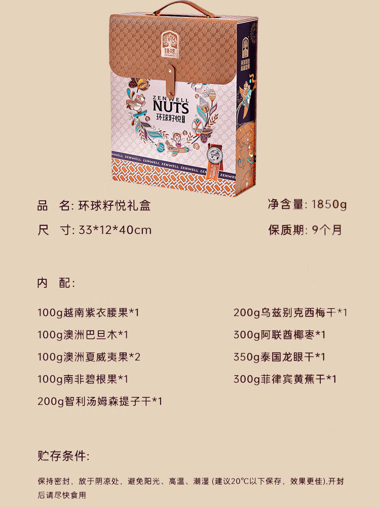 配置:100g越南紫衣腰果*1 100g澳洲巴旦木*1 100g澳洲夏威夷果*2 100g南非碧根果*1 200g智利汤姆森提子干*1 200g乌兹别克西梅干*1 300g阿联酋椰枣*1 350g泰国龙眼干*1 300g菲律宾黄蕉干*1