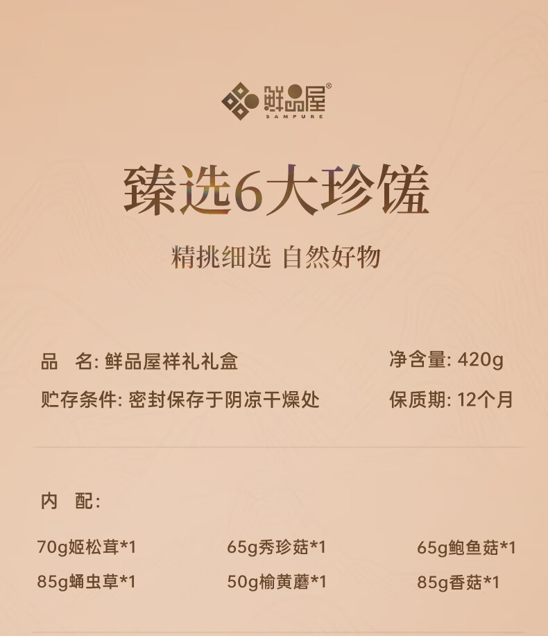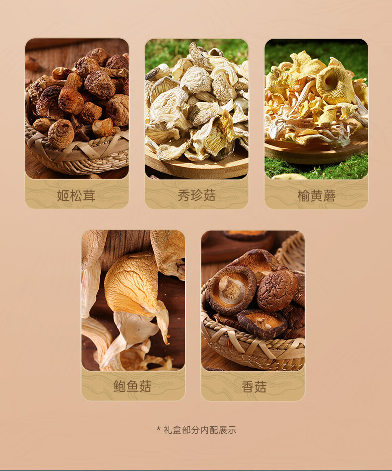 配置:70g姬松茸*1 85g蛹虫草*1 65g秀珍菇*1 50g榆黄蘑*1 65g鲍鱼菇*1 85g香菇*1