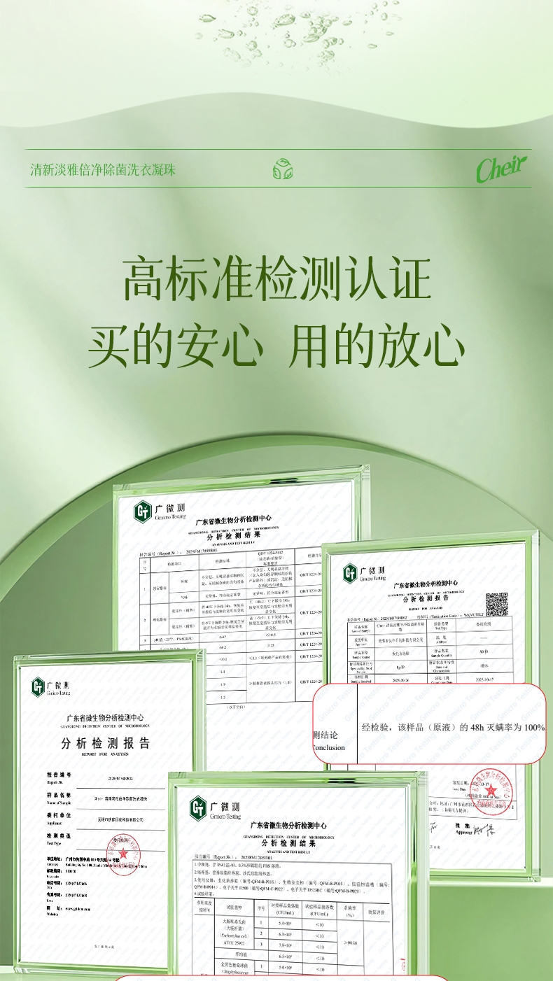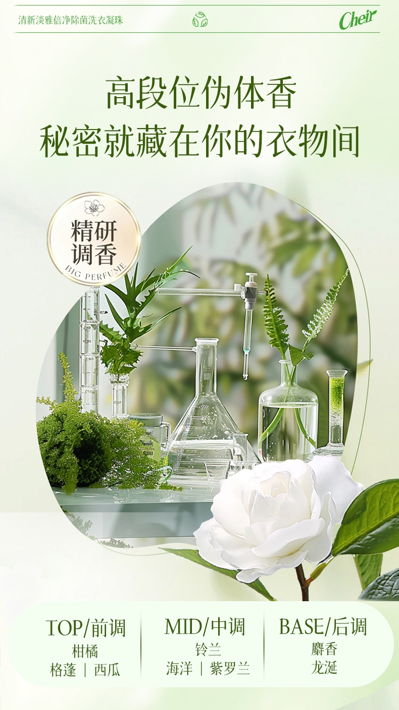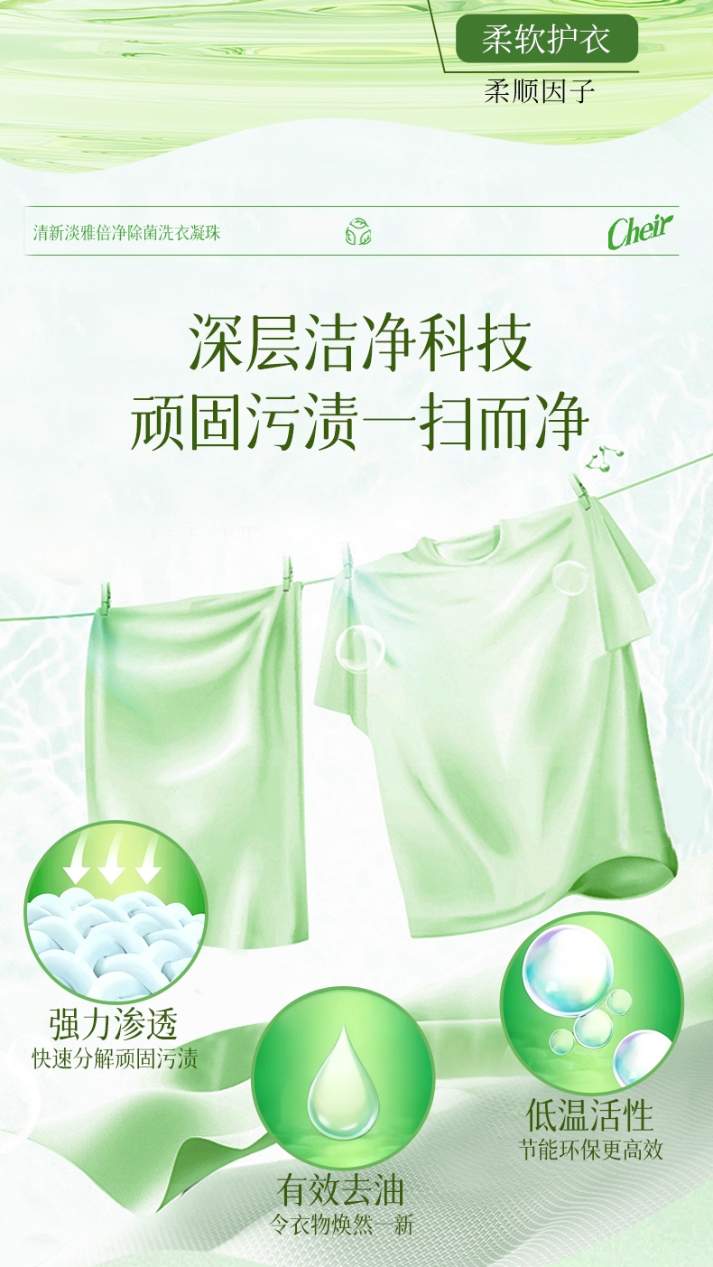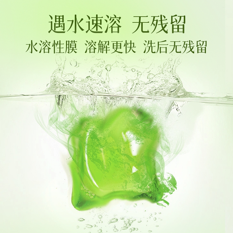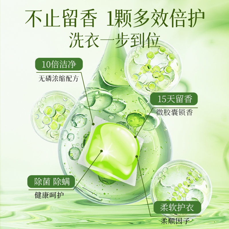 高定香芬99.9%抑菌除螨;0倍洁净、柔顺护衣、微胶囊锁香;水溶性膜遇水速融、无残留