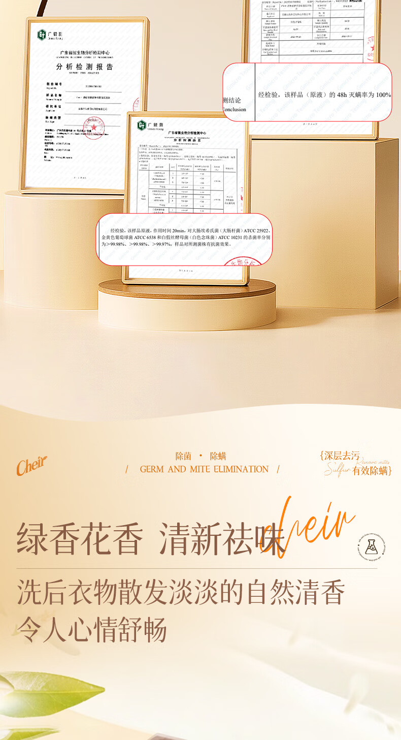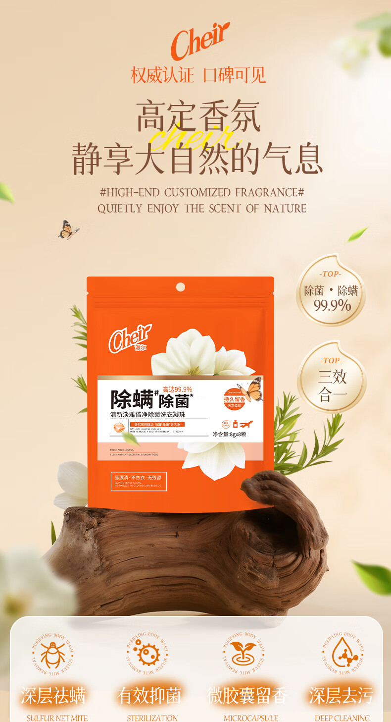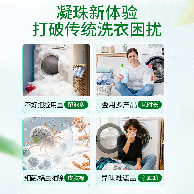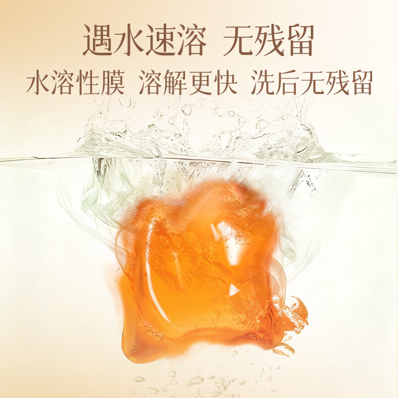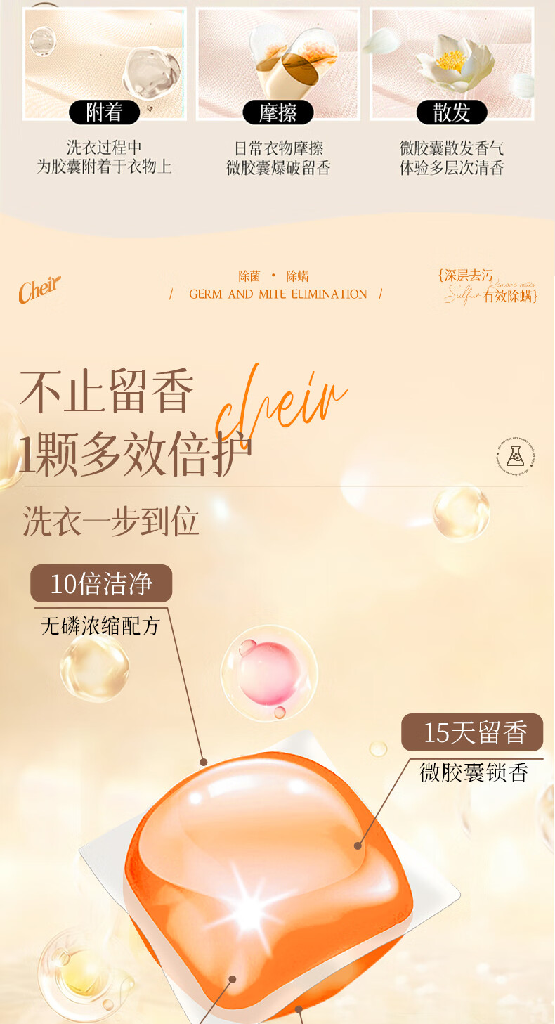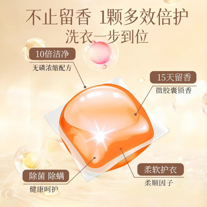 高定香芬99.9%抑菌除螨;10倍洁净、柔顺护衣、微胶囊锁香;水溶性膜遇水速融、无残留