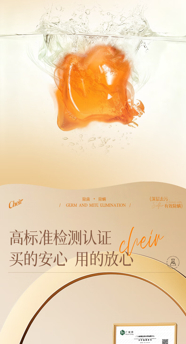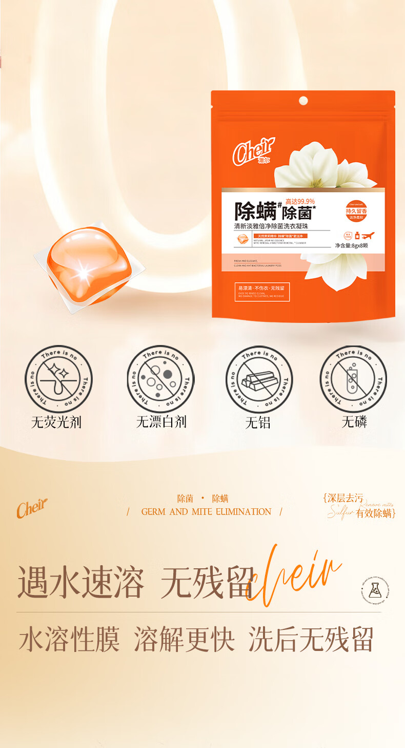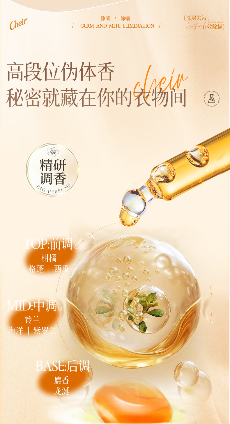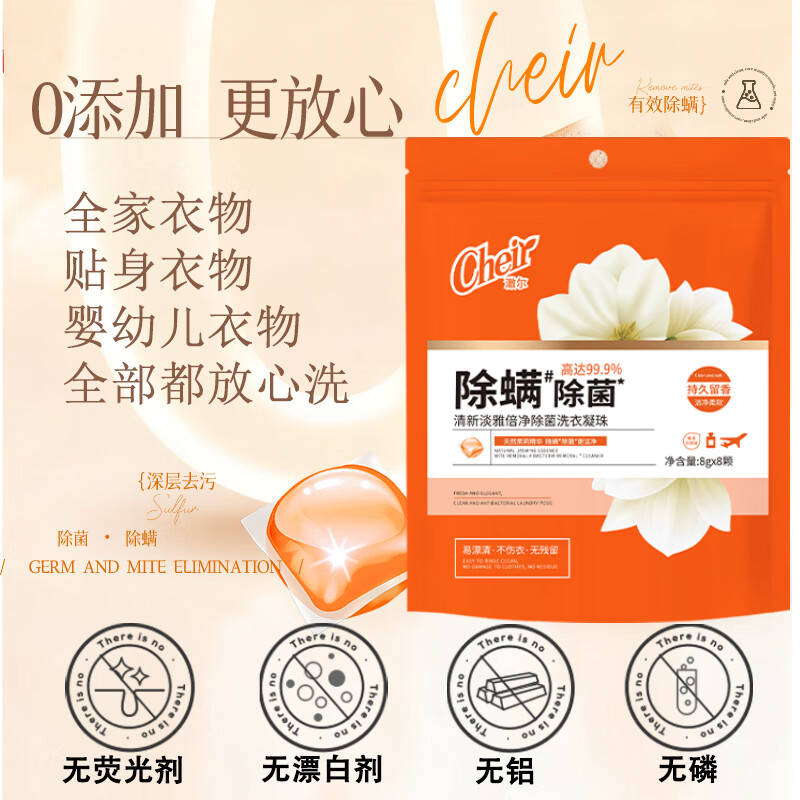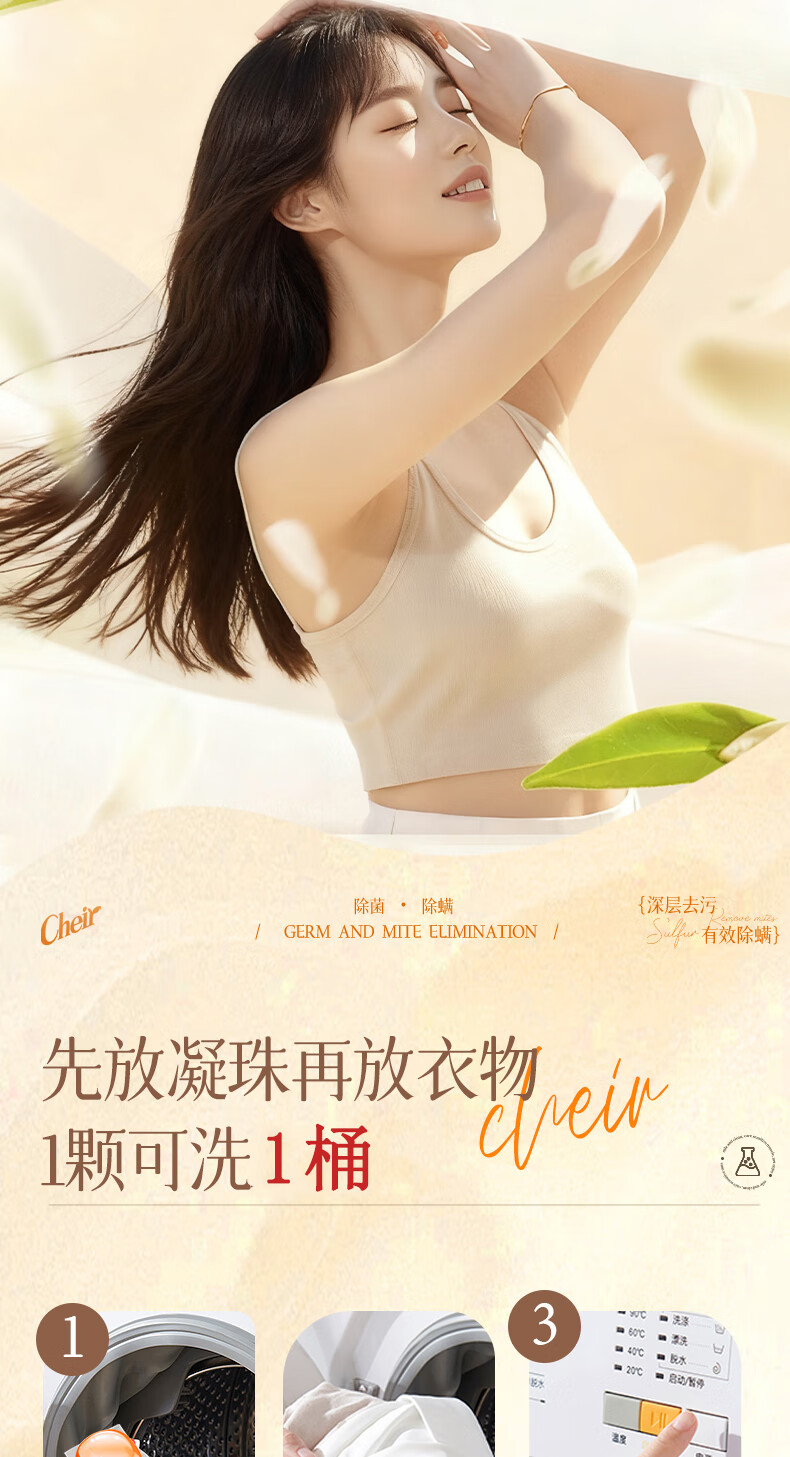 高定香芬99.9%抑菌除螨;10倍洁净、柔顺护衣、微胶囊锁香;水溶性膜遇水速融、无残留