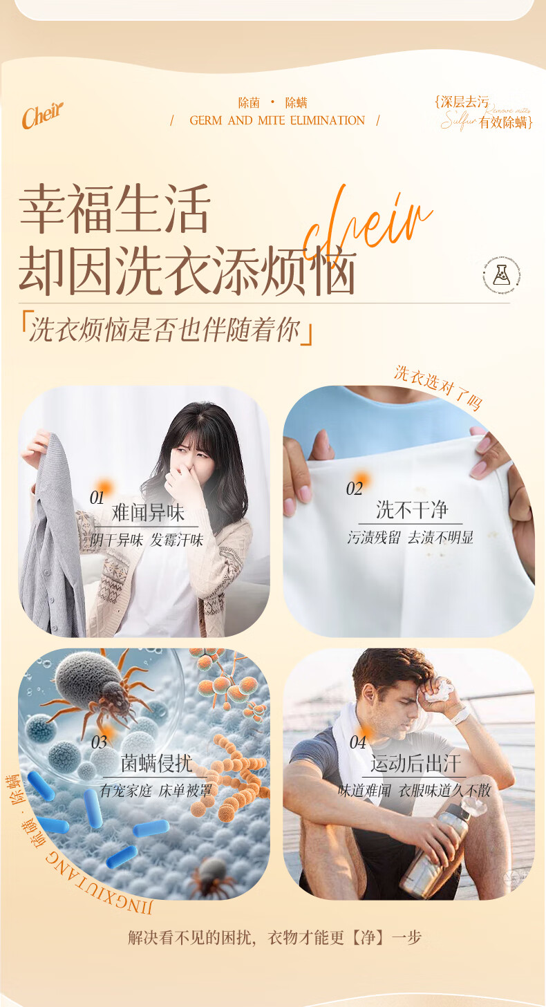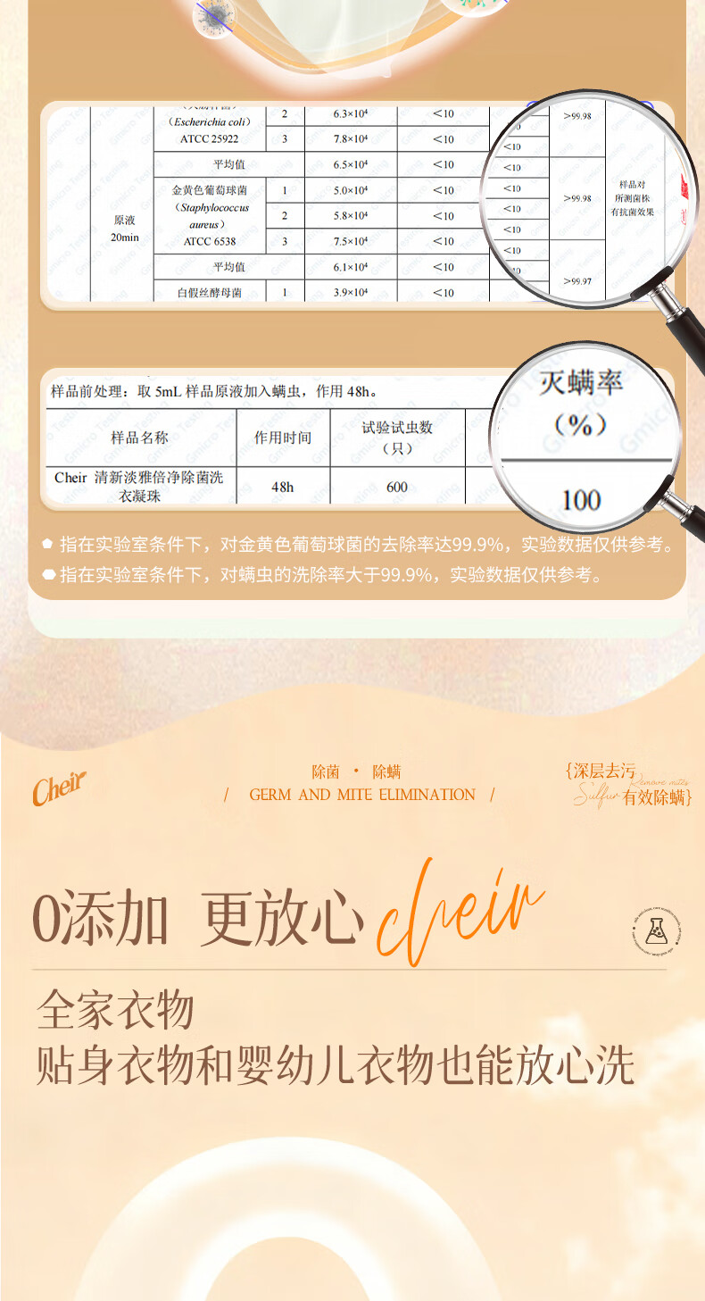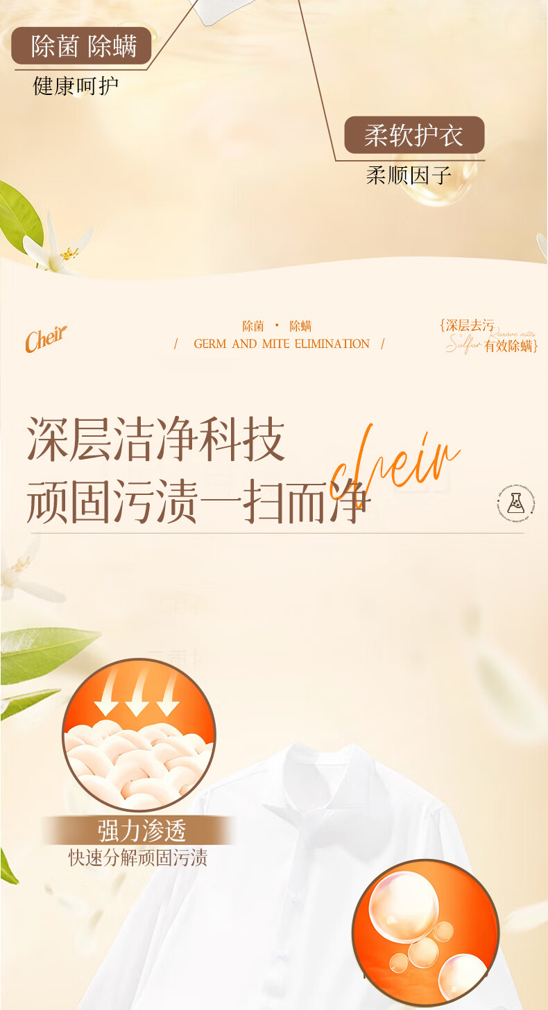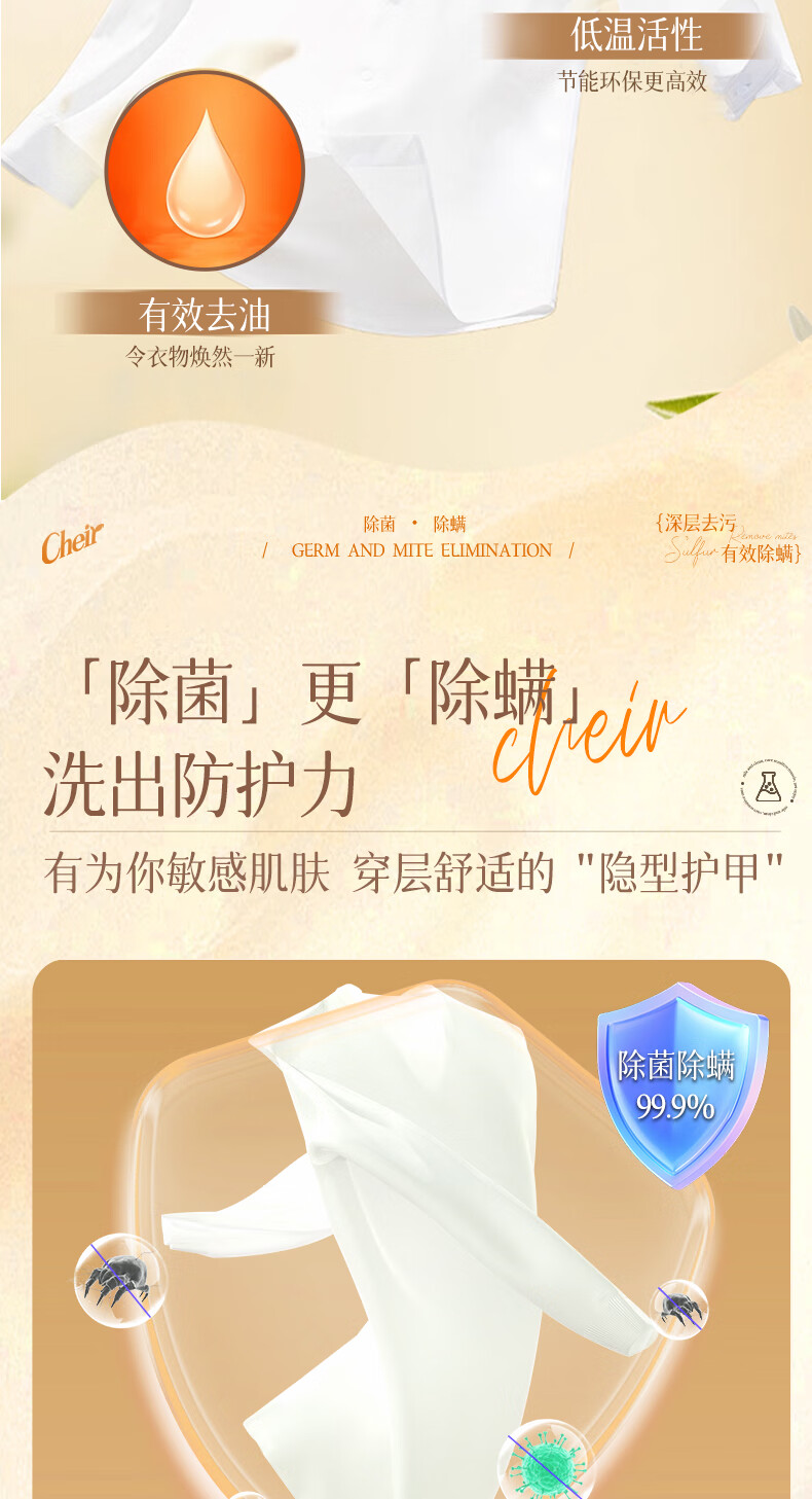 高定香芬99.9%抑菌除螨;10倍洁净、柔顺护衣、微胶囊锁香;水溶性膜遇水速融、无残留