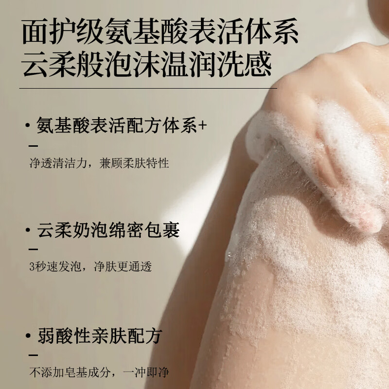 云柔奶泡绵密包裹,3秒速发泡,净肤更通透;弱酸性亲肤配方,不添加皂基成分,一冲即净;净透清洁力,兼顾柔肤特性 具备出色的清洁能力