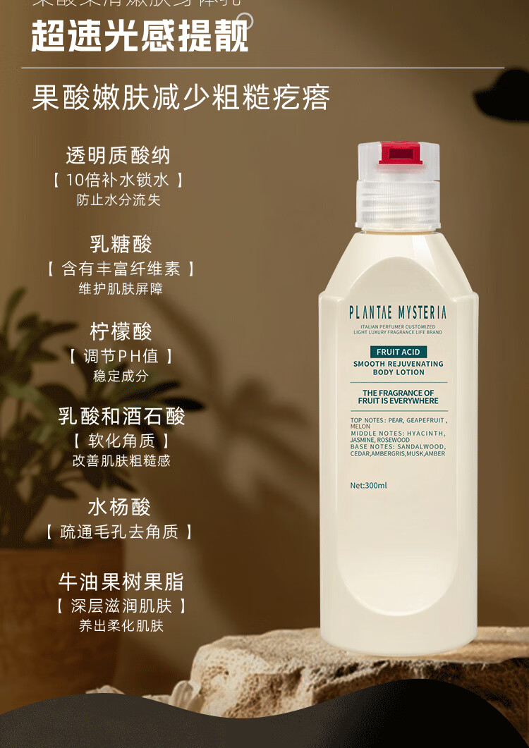 令肌肤细腻、水润、光滑;专为粗糙肌设计,蕴含果酸精华;保湿润肤,改善粗糙