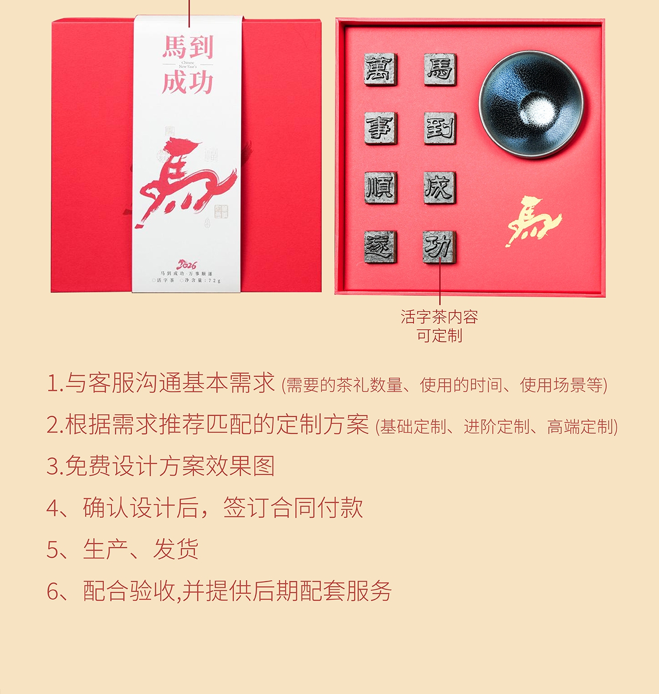 活字与茶叶的创意组合,一字一茶以字表意;高山料有趣茶,茶汤橙黄入口醇厚回甘;专属定制,让员工/客户感受到独一无二的心意