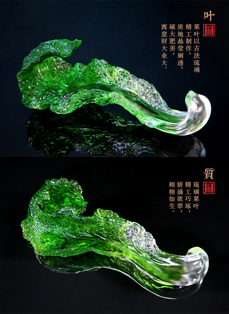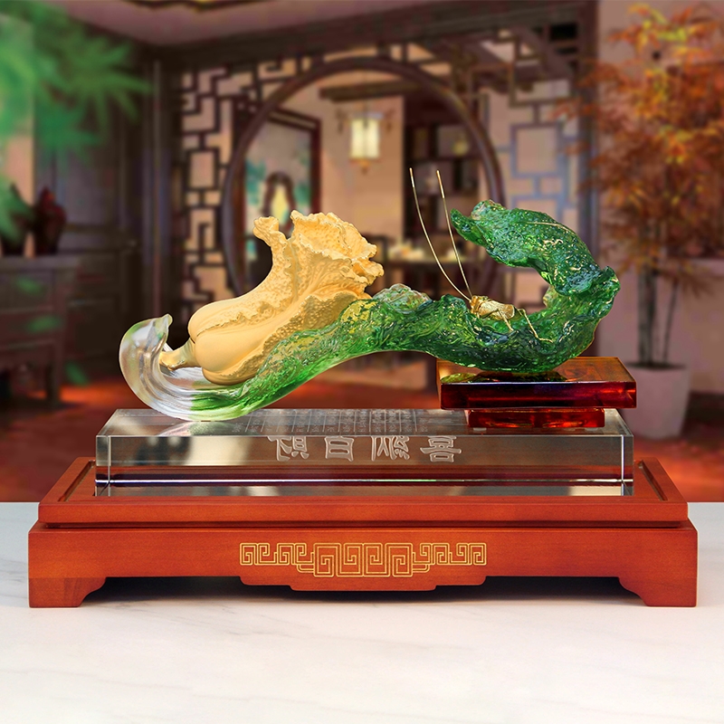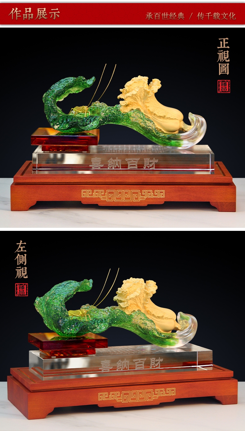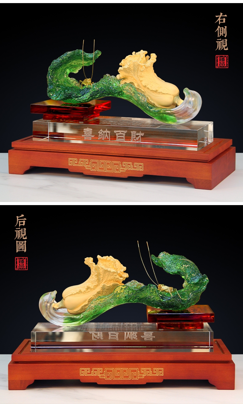 白菜谐音百财。寓意发财、横财就手、百财聚来之意;主体造型为一晶莹剔透、娇翠欲滴之琉璃白菜大叶;怀抱着金枝玉叶之小白菜,一蝗虫携祥音而至