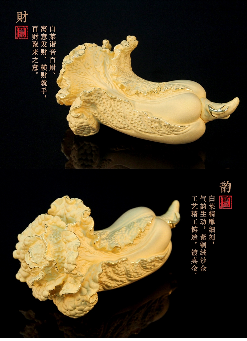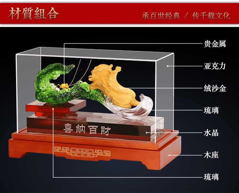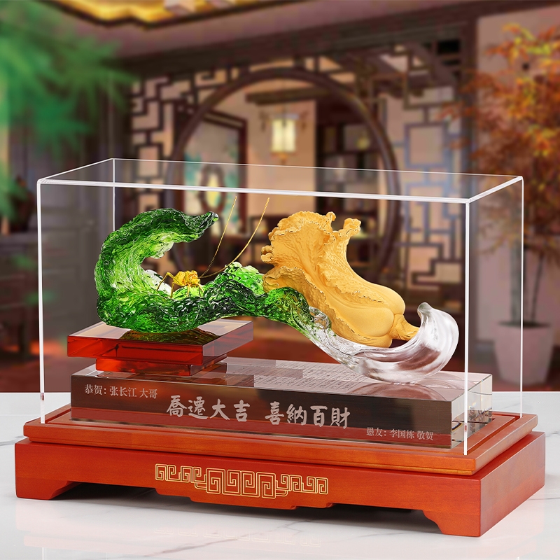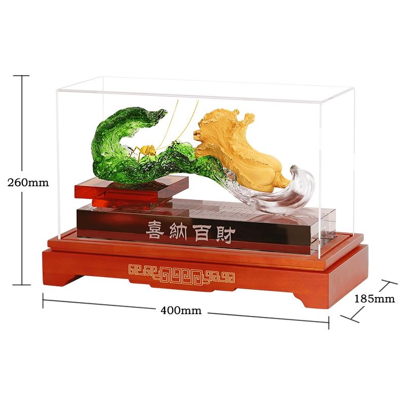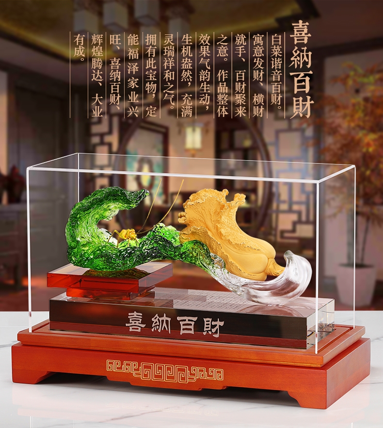 白菜谐音百财。寓意发财、横财就手、百财聚来之意;主体造型为一晶莹剔透、娇翠欲滴之琉璃白菜大叶;怀抱着金枝玉叶之小白菜,一蝗虫携祥音而至
