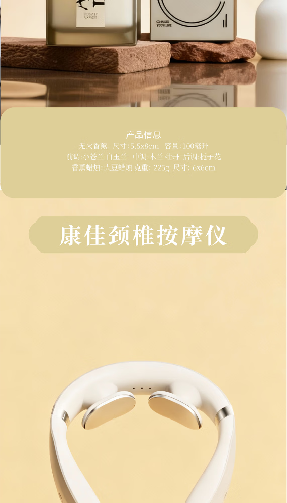 无火香薰:无火扩香 氛围感拉满;香薰蜡烛:烛光暖香 治愈慢时光;颈椎按摩仪:肩颈舒缓 办公通勤必备