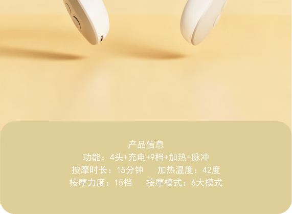 康佳颈椎按摩:功能:4头+充电+9档+加热+脉冲 按摩时长:15分钟 加热温度:42度 按摩力度:15档 按摩模式:6大模式