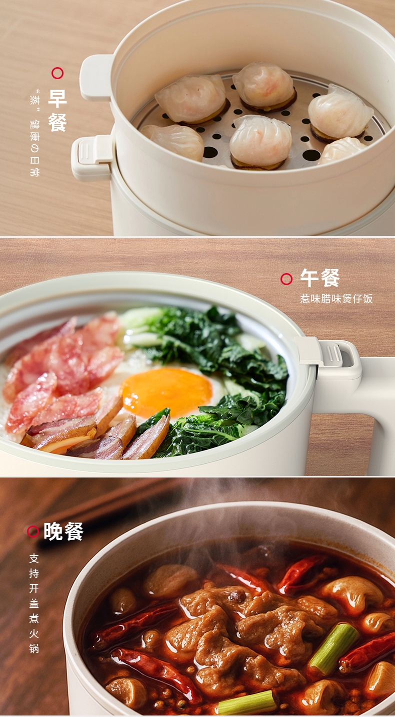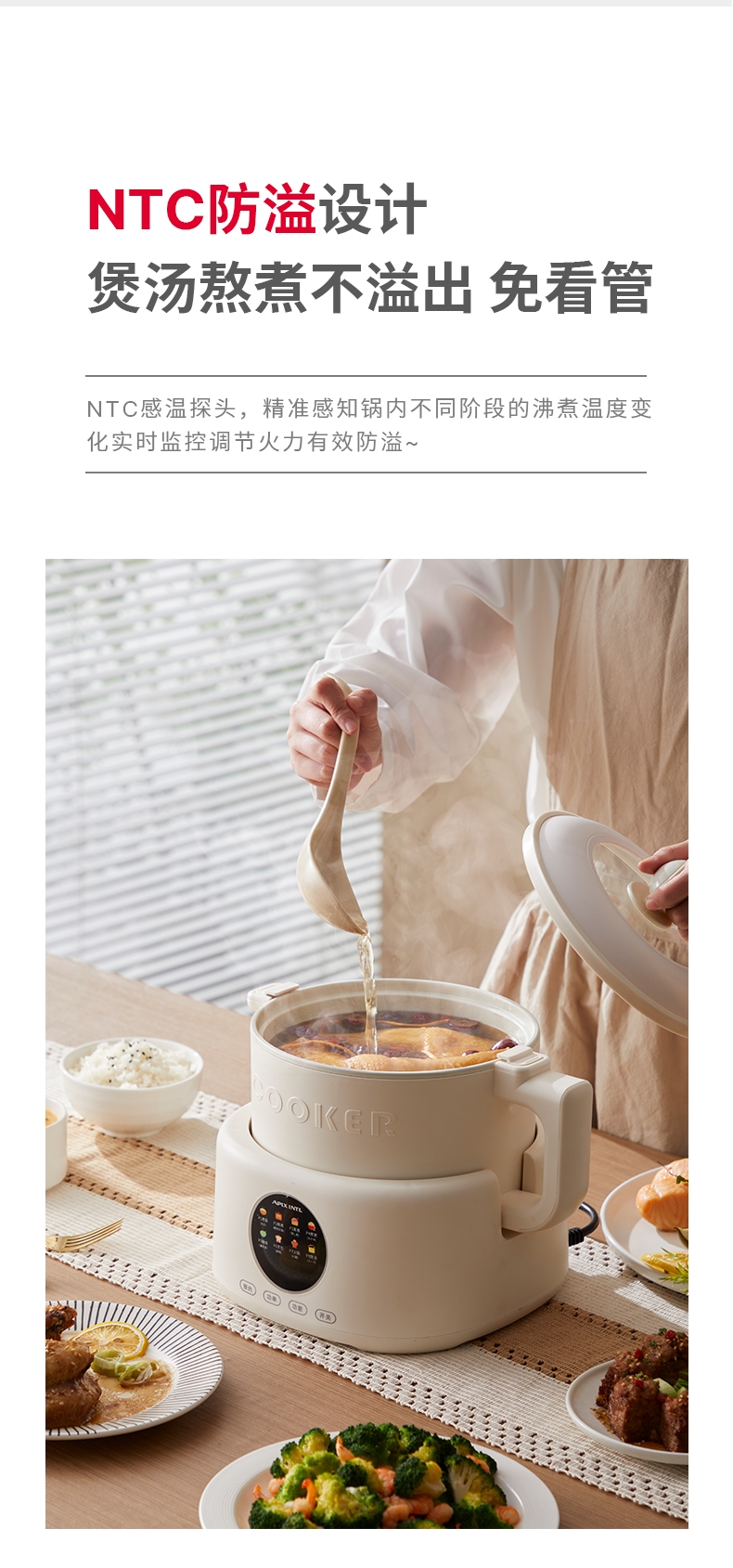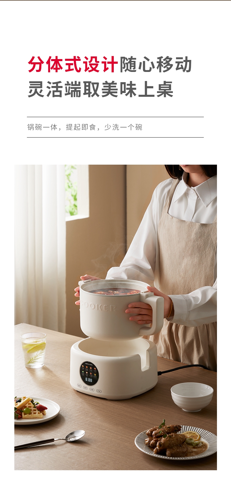 珐琅钛釉不粘内胆,健康无异味;;超大彩屏显示,8大菜单功能,24h预约;大火力火锅,既锅又是碗