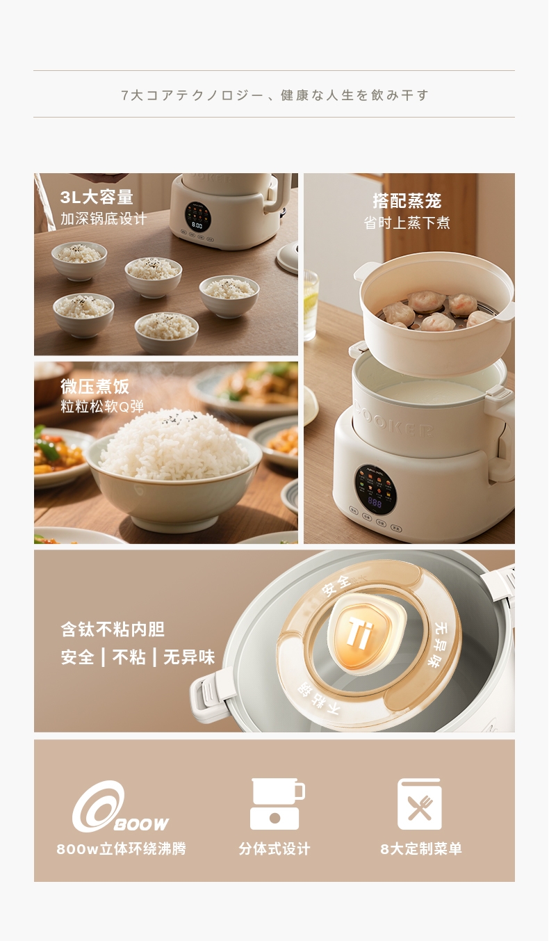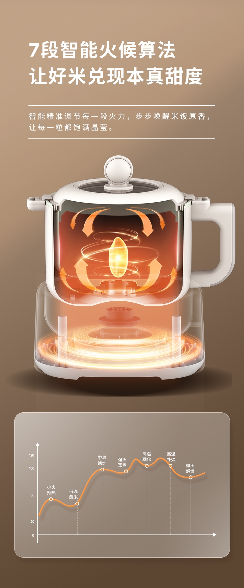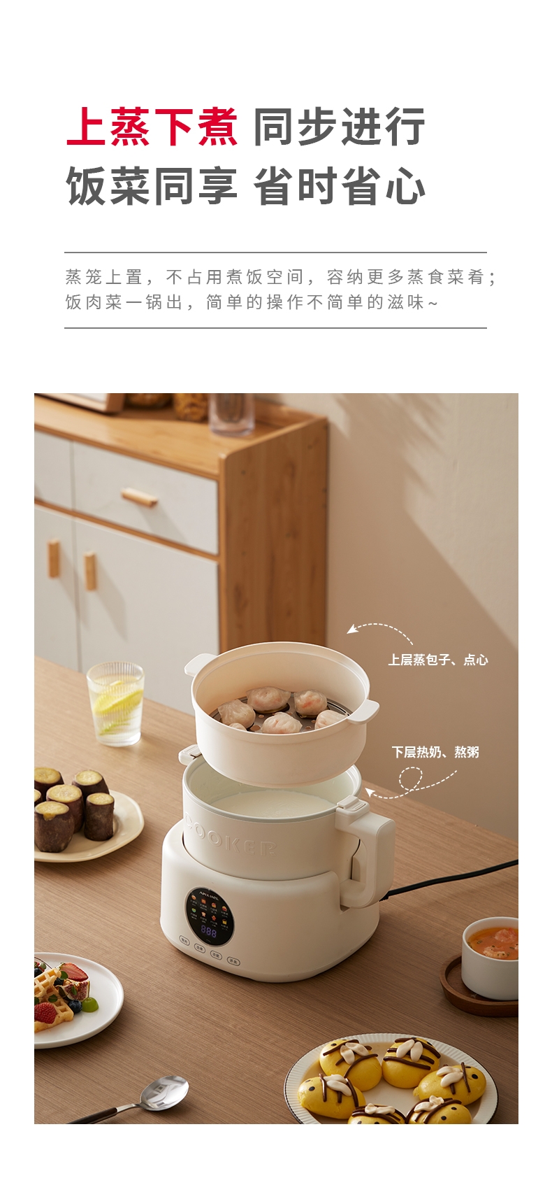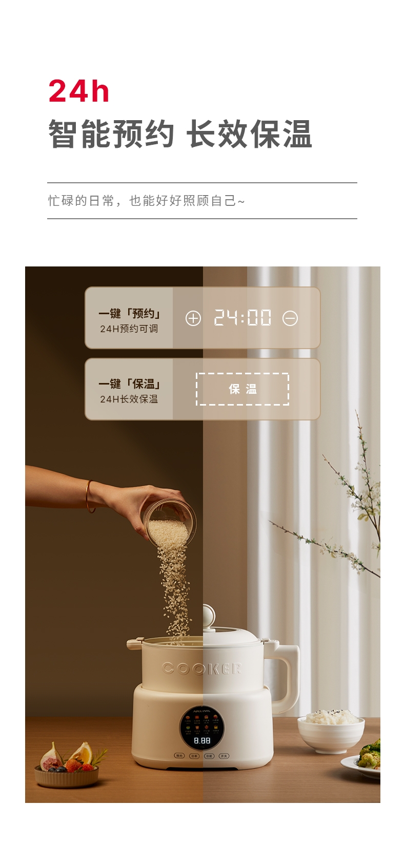 珐琅钛釉不粘内胆,健康无异味;;超大彩屏显示,8大菜单功能,24h预约;大火力火锅,既锅又是碗