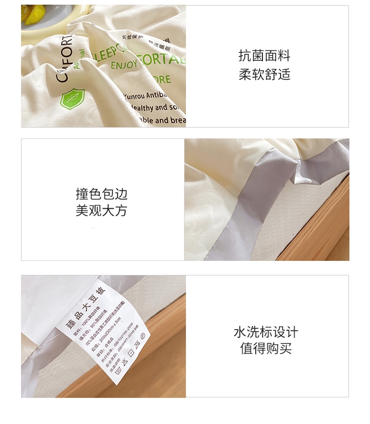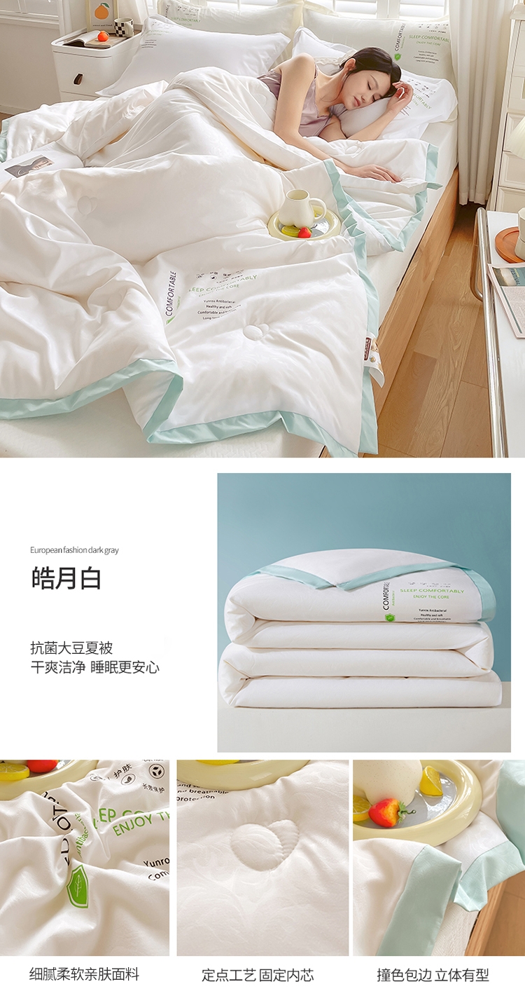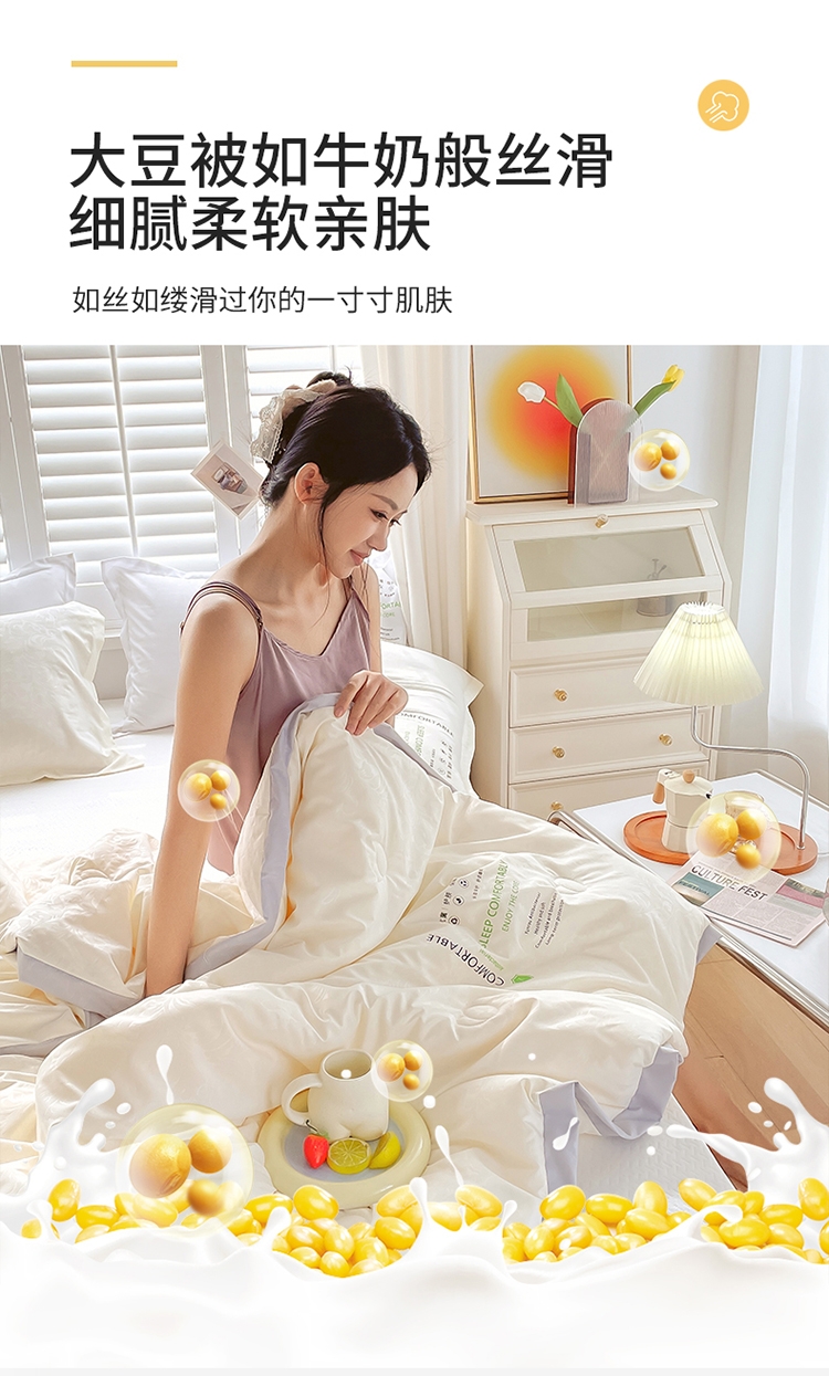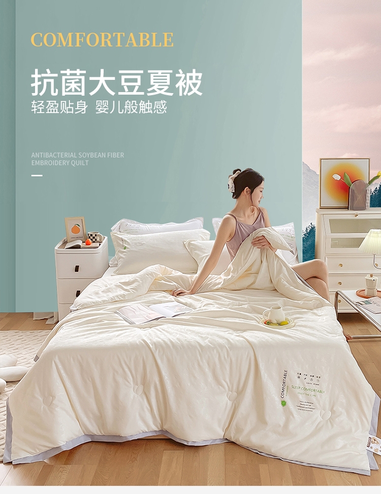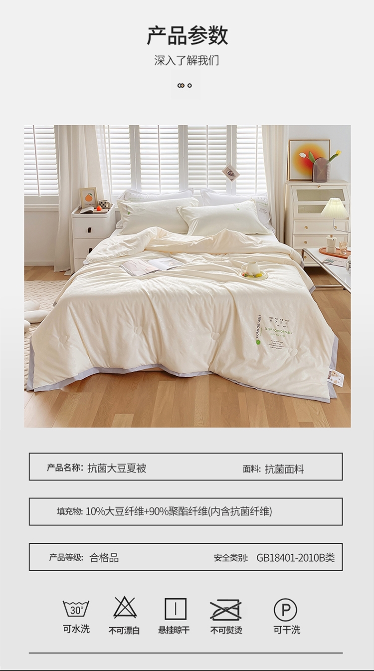 抗菌大豆夏被轻盈贴身 婴儿般触感;会呼吸的大豆被让夏凉睡眠更舒爽 抗菌大豆夏被 ;大豆被如牛奶般丝滑细腻柔软亲肤 如丝如缕滑