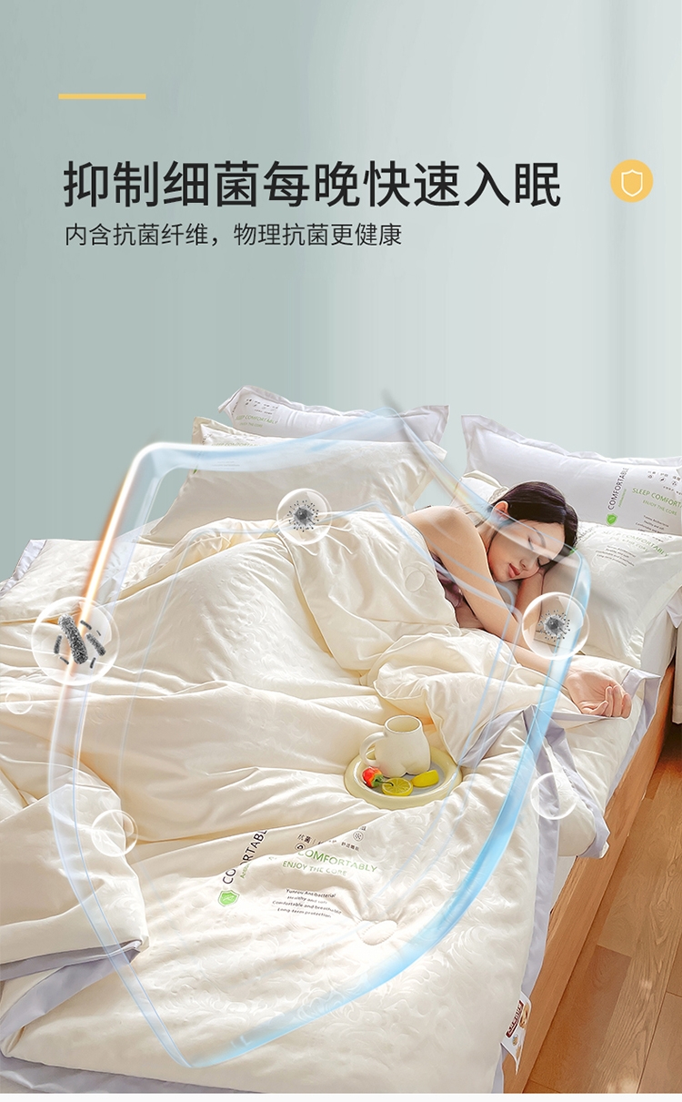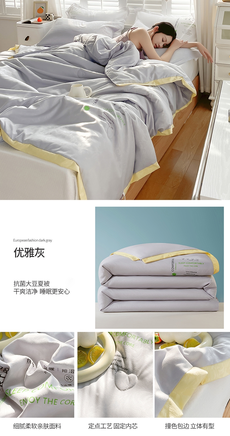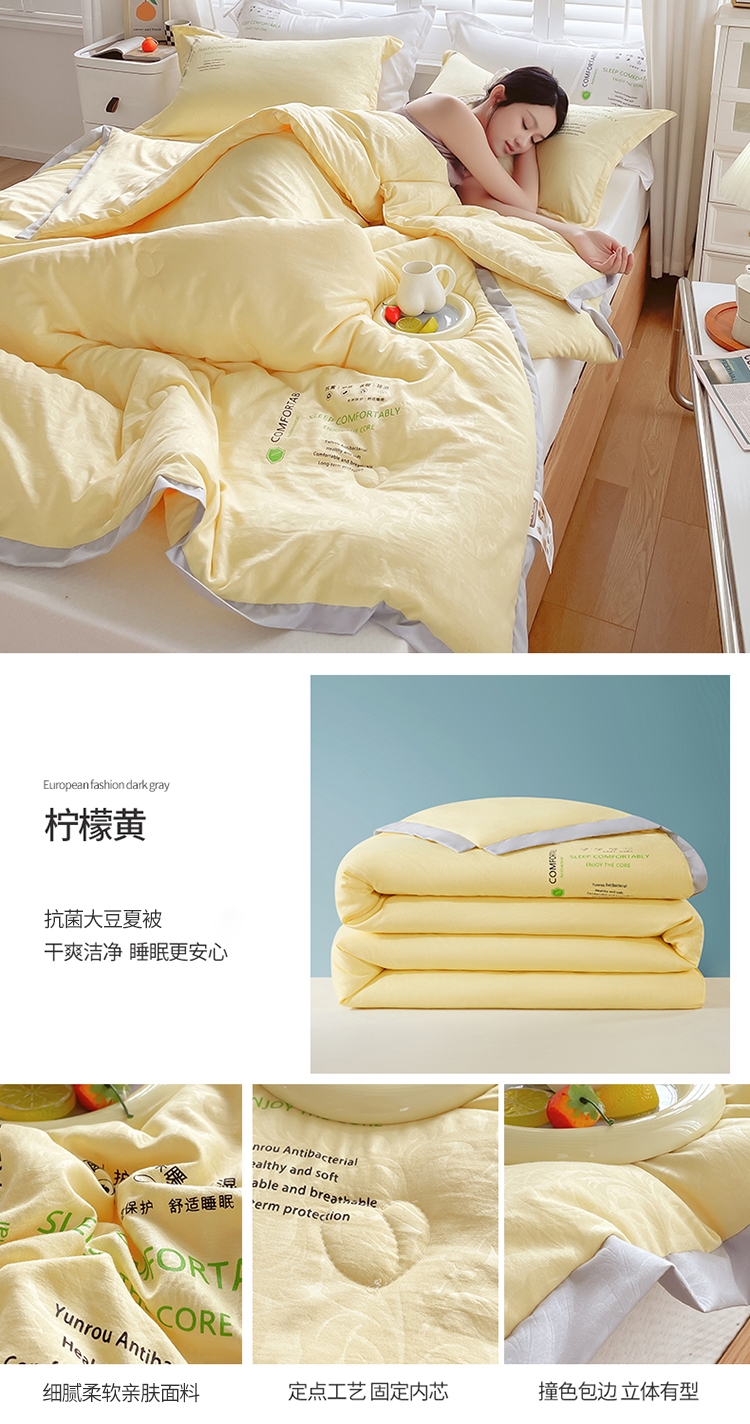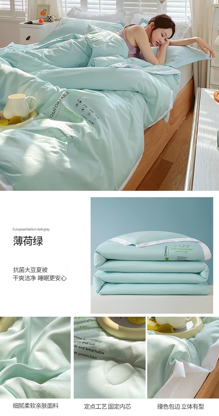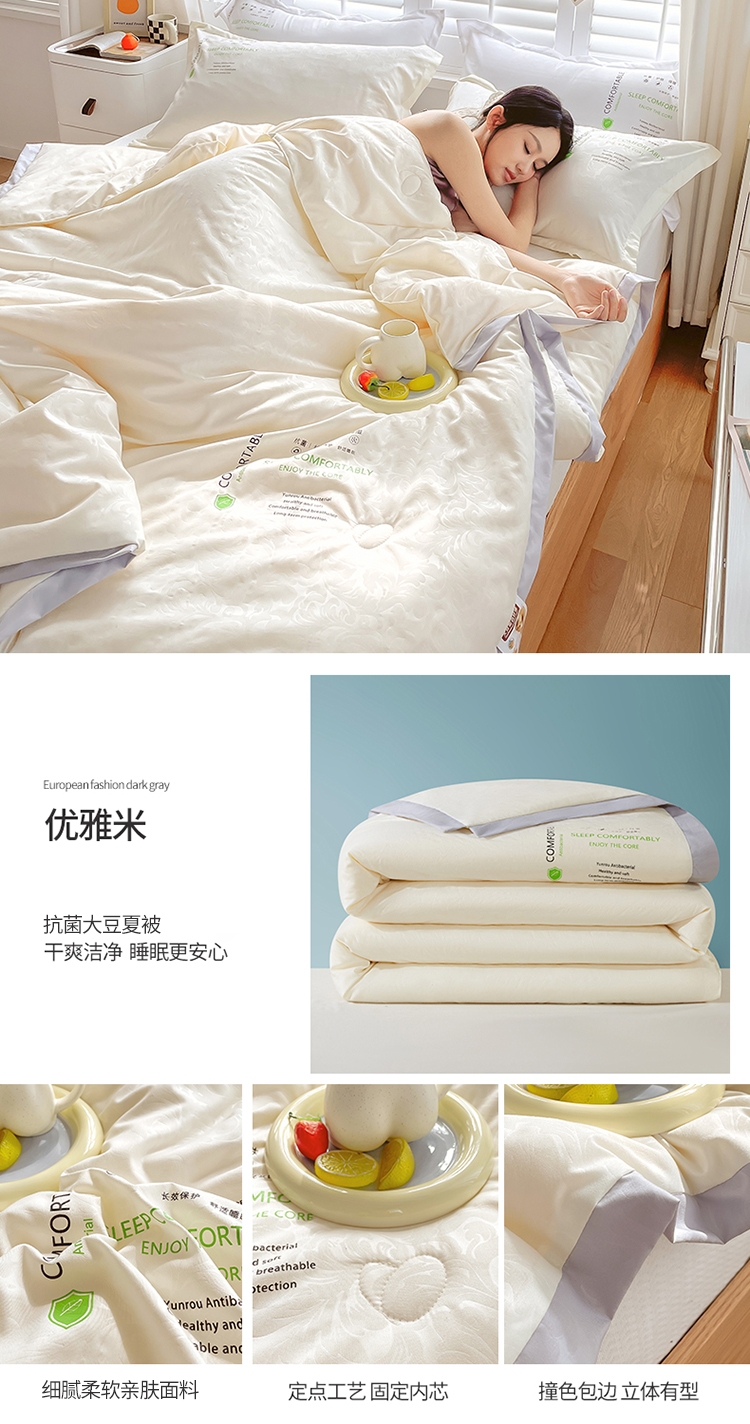 抗菌大豆夏被轻盈贴身 婴儿般触感;会呼吸的大豆被让夏凉睡眠更舒爽 抗菌大豆夏被 ;大豆被如牛奶般丝滑细腻柔软亲肤 如丝如缕滑