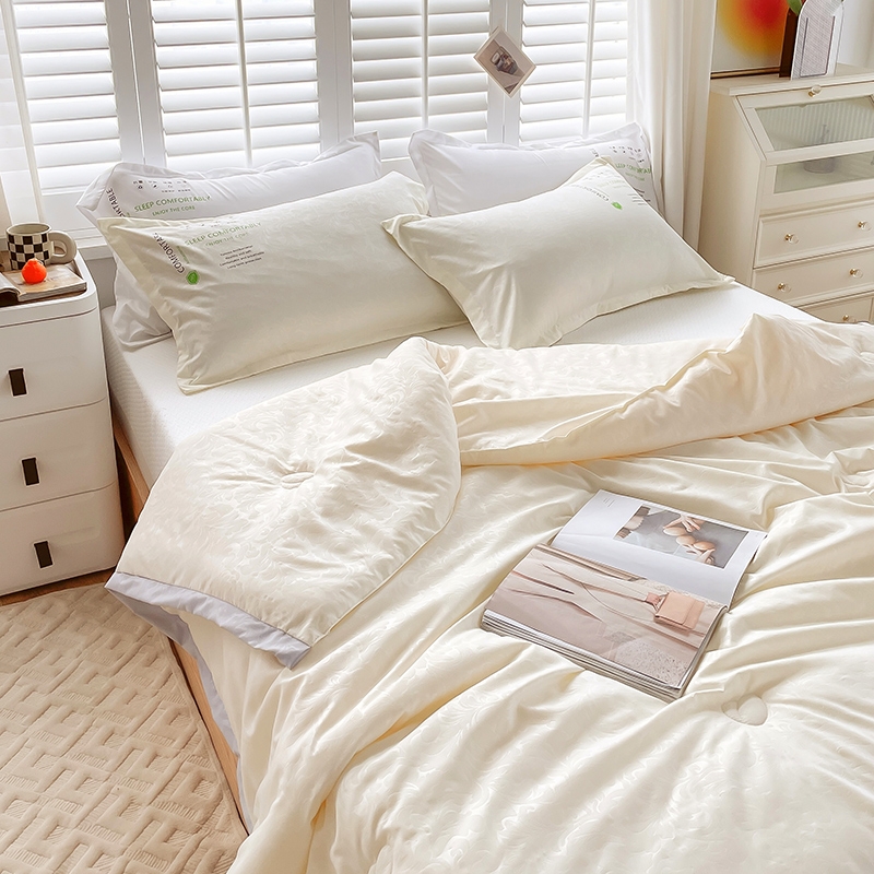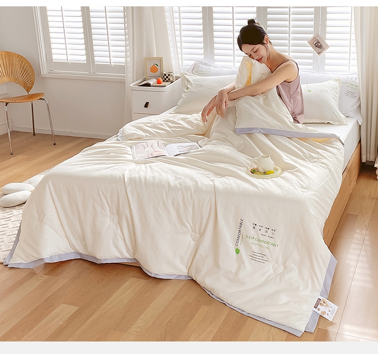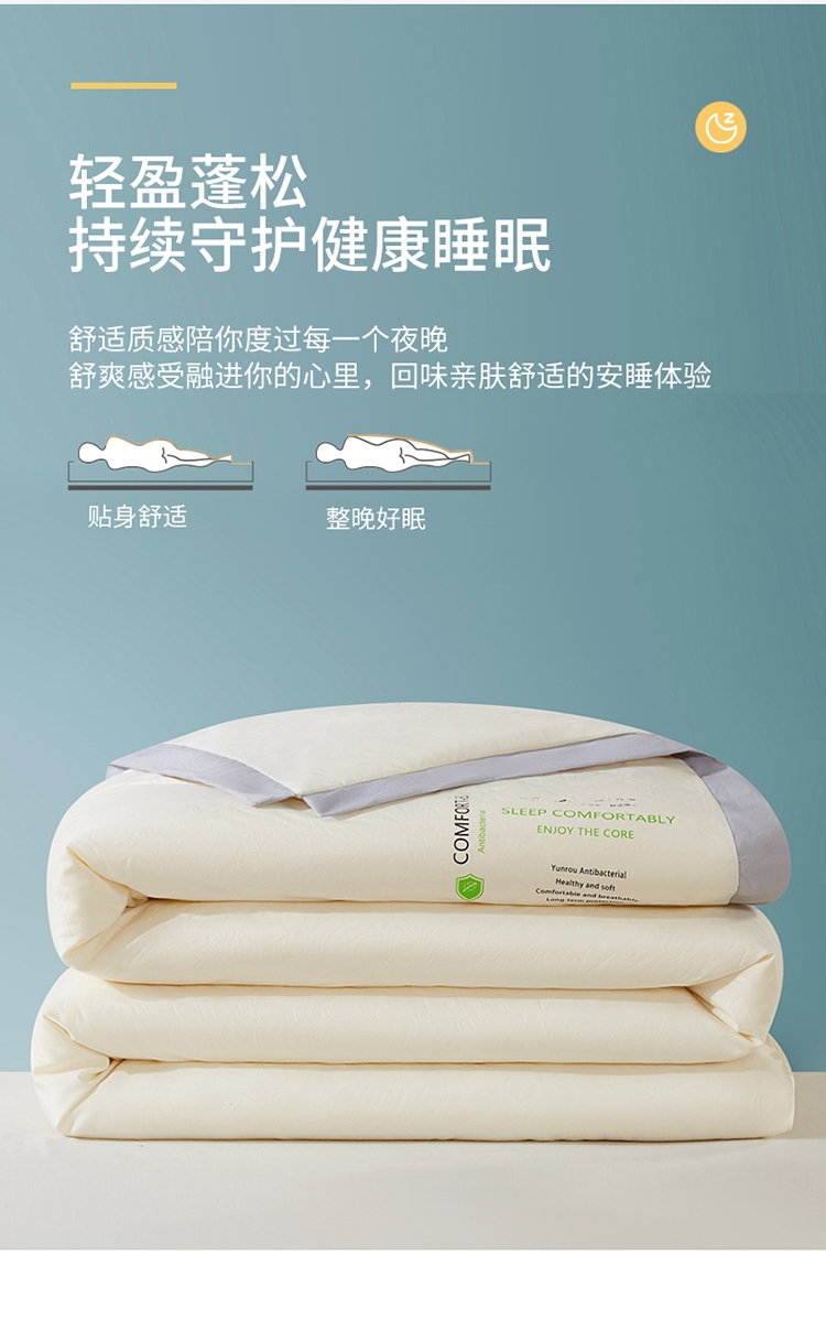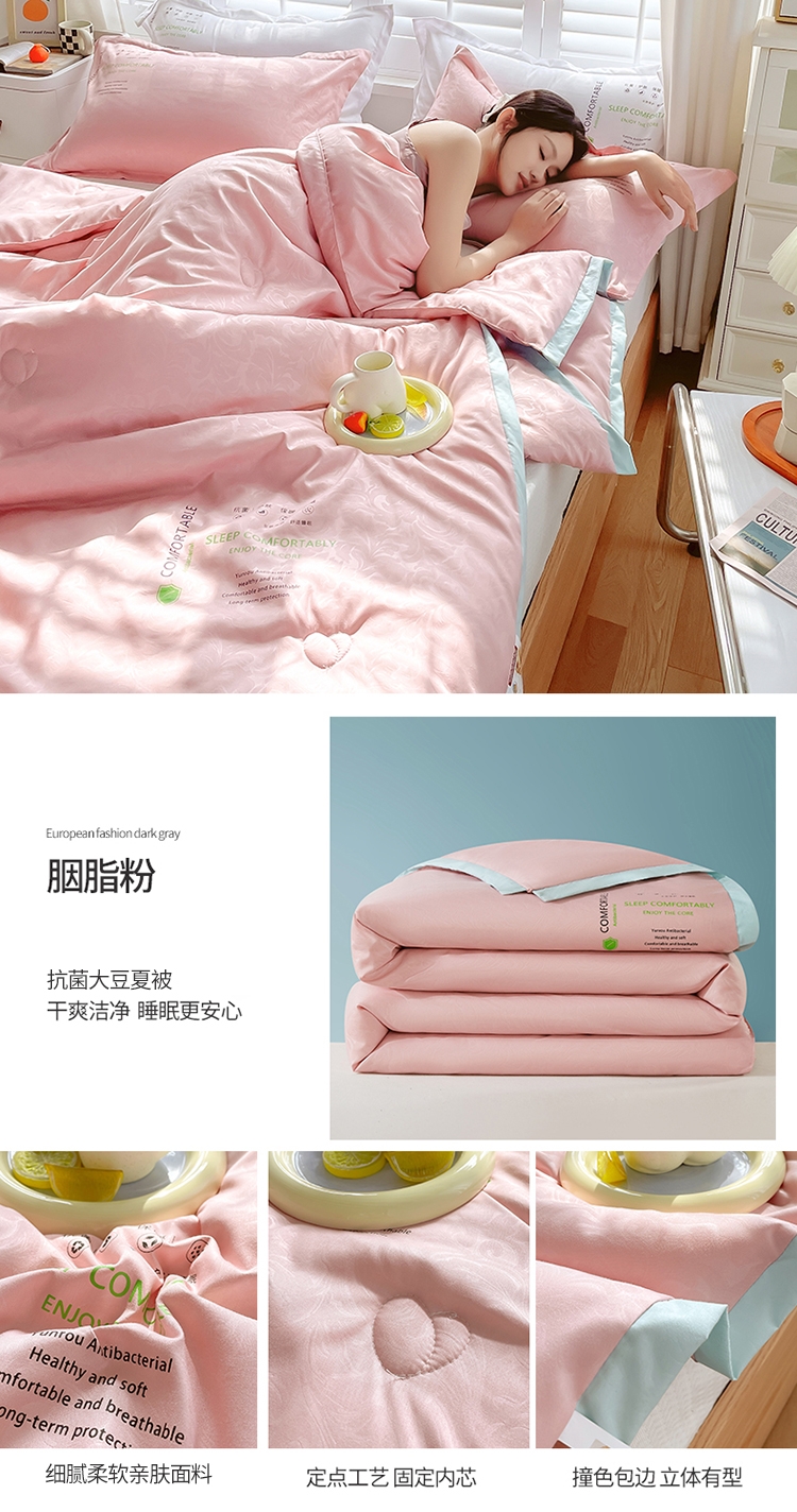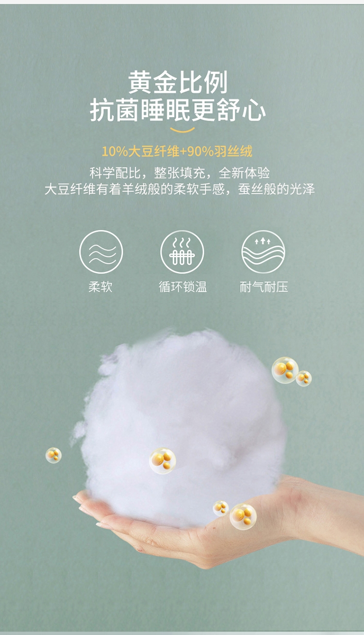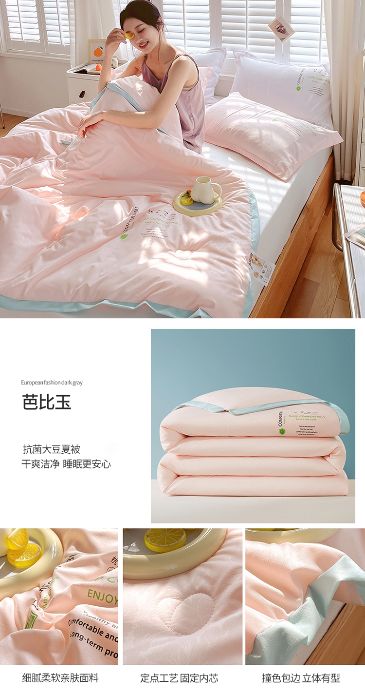 抗菌大豆夏被轻盈贴身 婴儿般触感;会呼吸的大豆被让夏凉睡眠更舒爽 抗菌大豆夏被 ;大豆被如牛奶般丝滑细腻柔软亲肤 如丝如缕滑