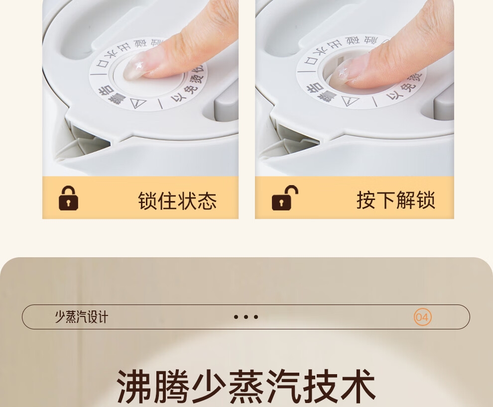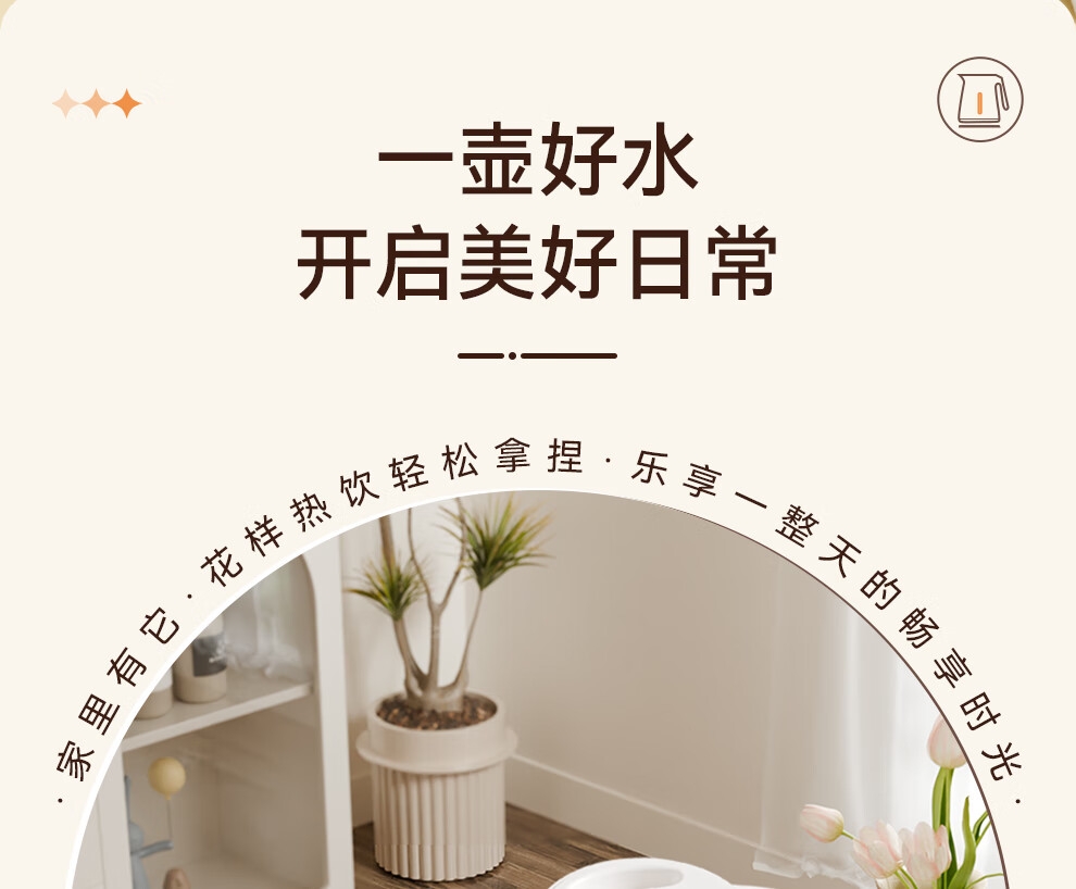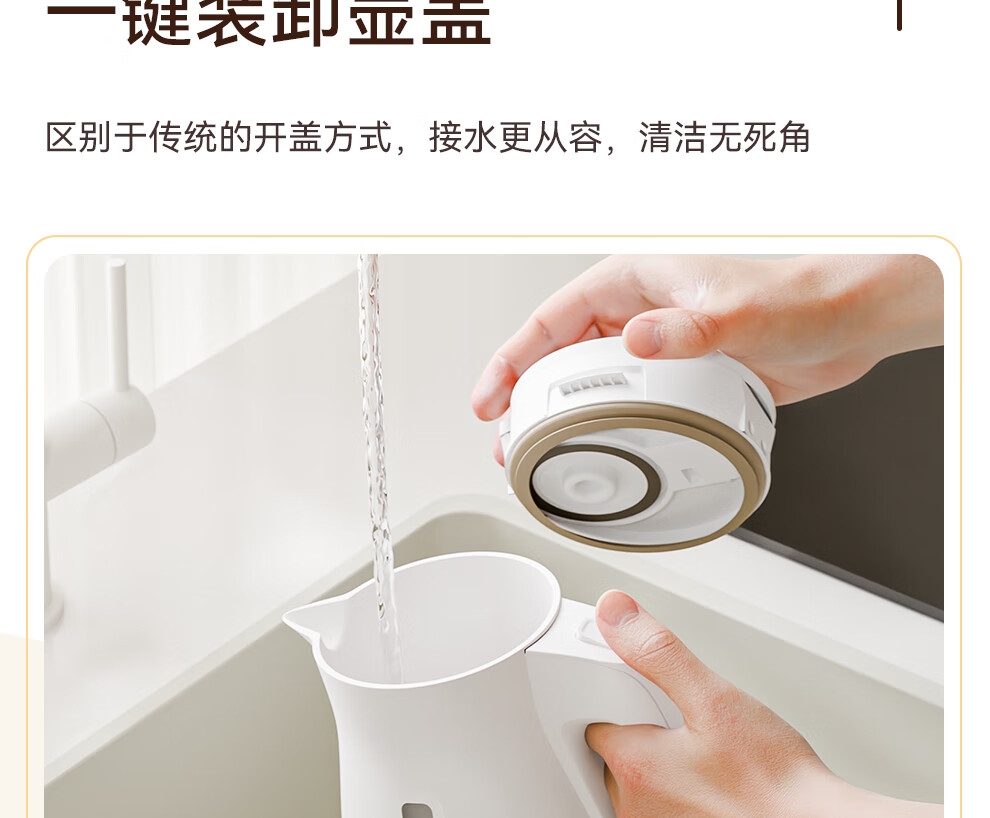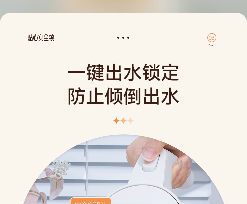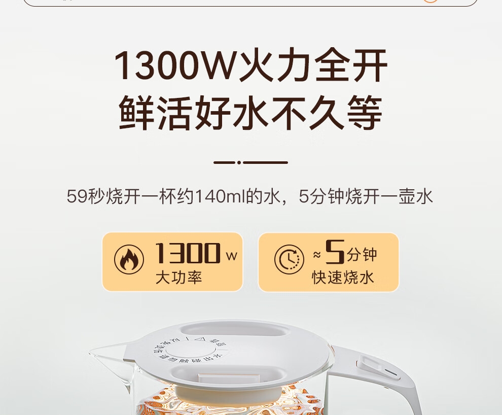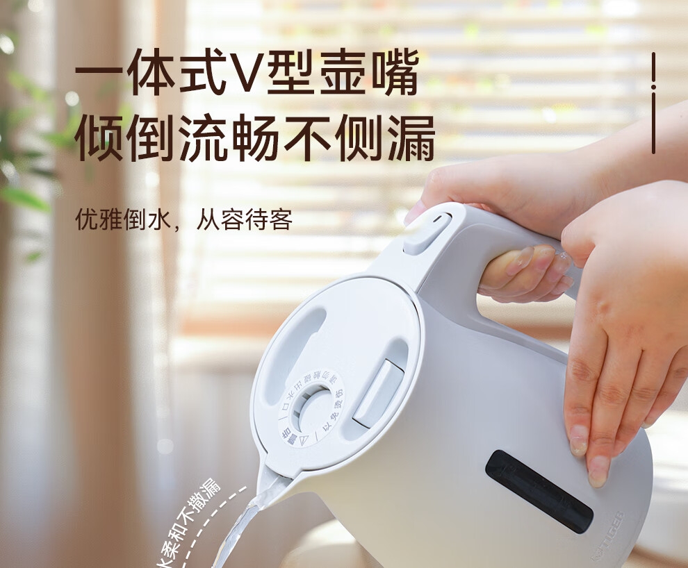 1300W火力全开鲜活好水不久等;一键出水锁定防止倾倒出水;一体式V型壶嘴 倾倒流畅不侧漏