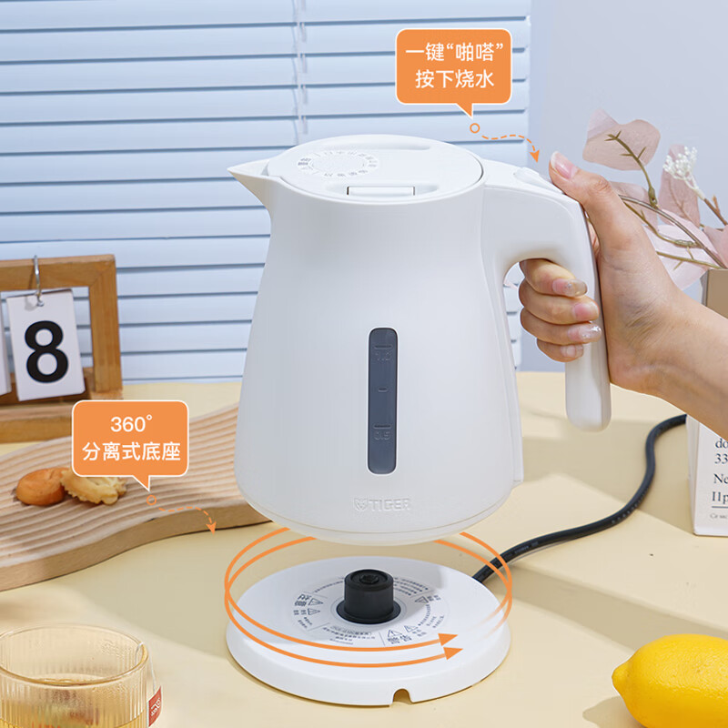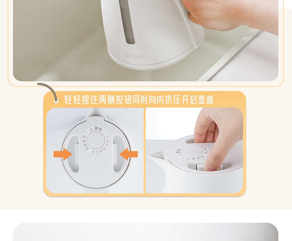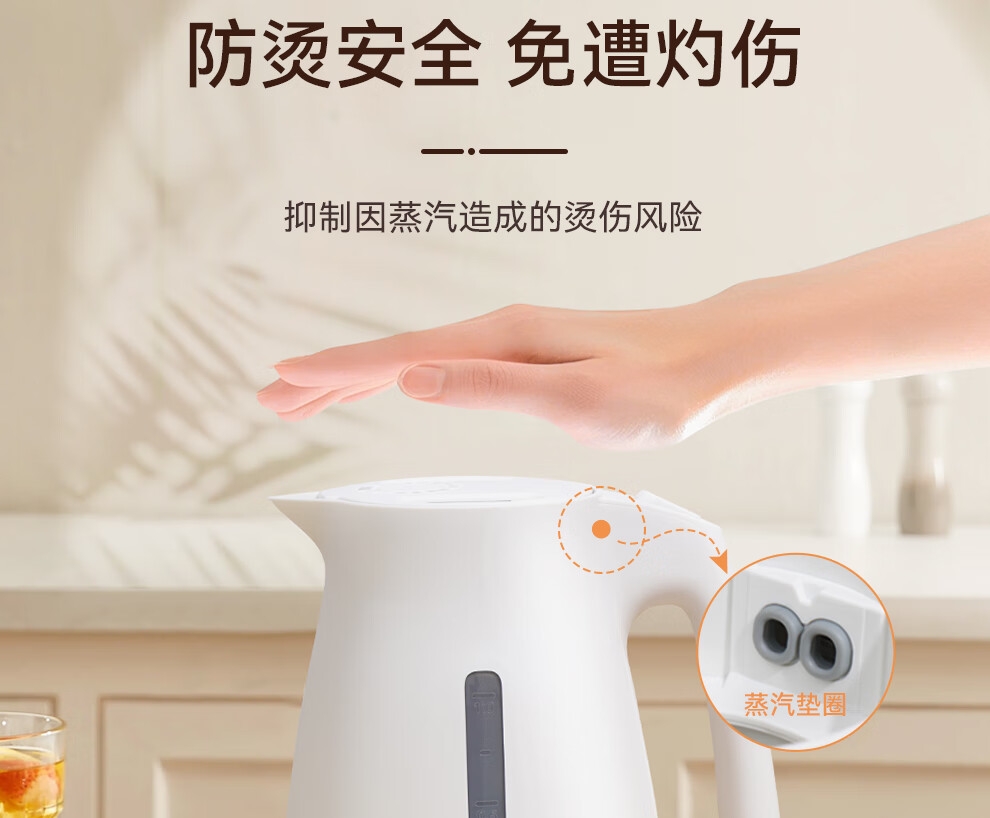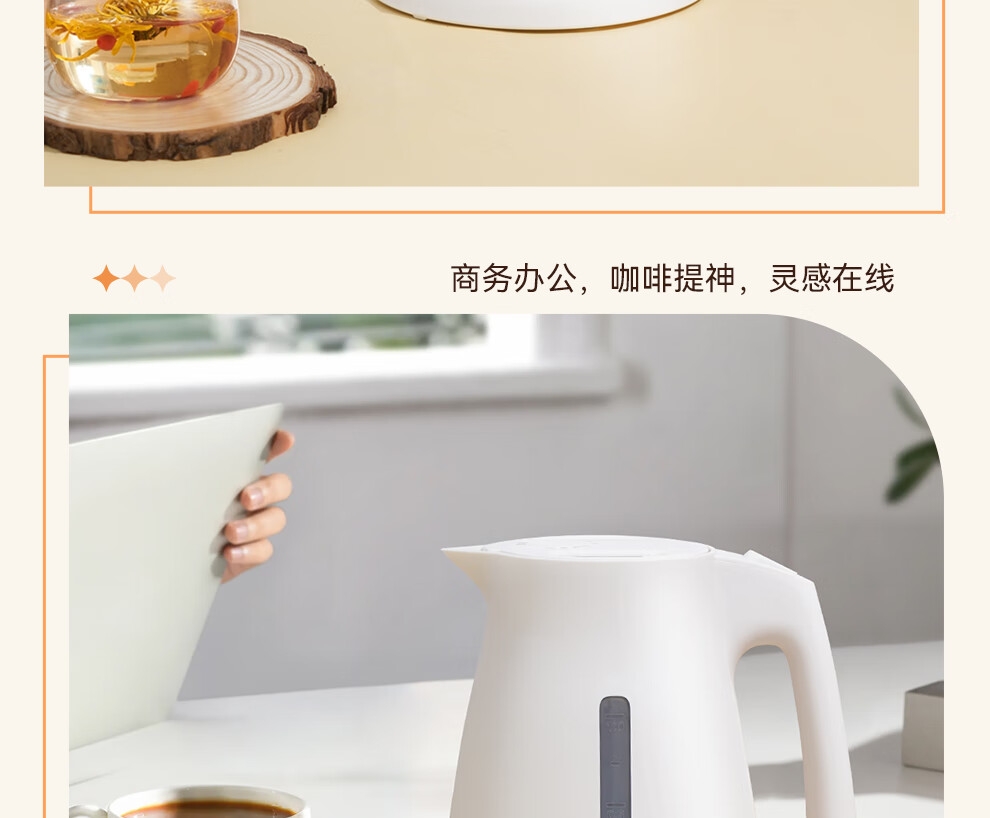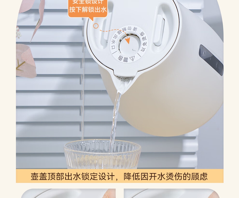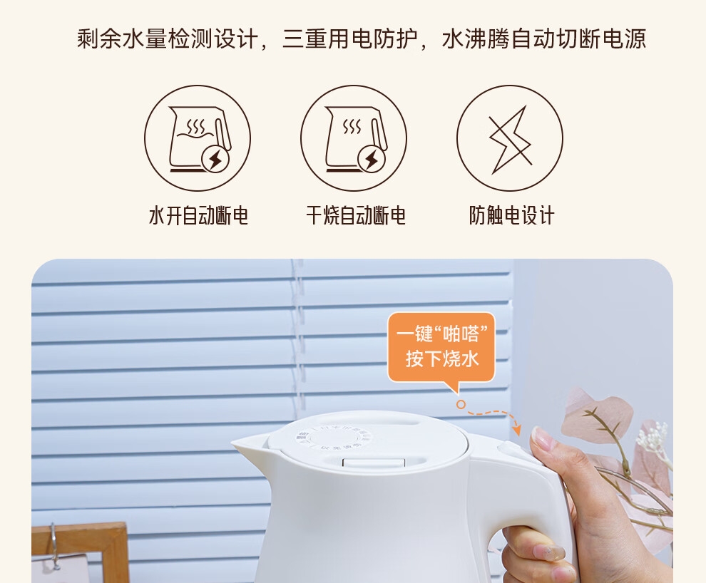 1300W火力全开鲜活好水不久等;一键出水锁定防止倾倒出水;一体式V型壶嘴 倾倒流畅不侧漏