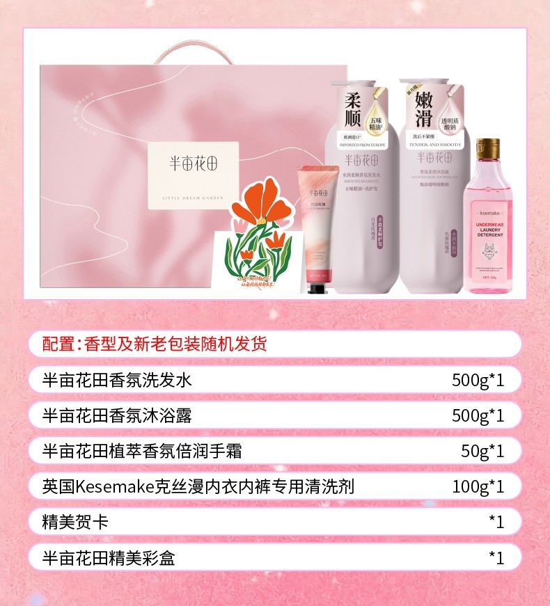 配置清单:半亩花田香氛洗发水500g*1 半亩花田香氛沐浴露500g*1 半亩花田植萃香氛倍润手霜50g*1 英国Kesemake克丝漫内衣内裤专用清洗剂100g*1 精美贺卡*1(量大可定制) 半亩花田精美彩盒ZS205*1
