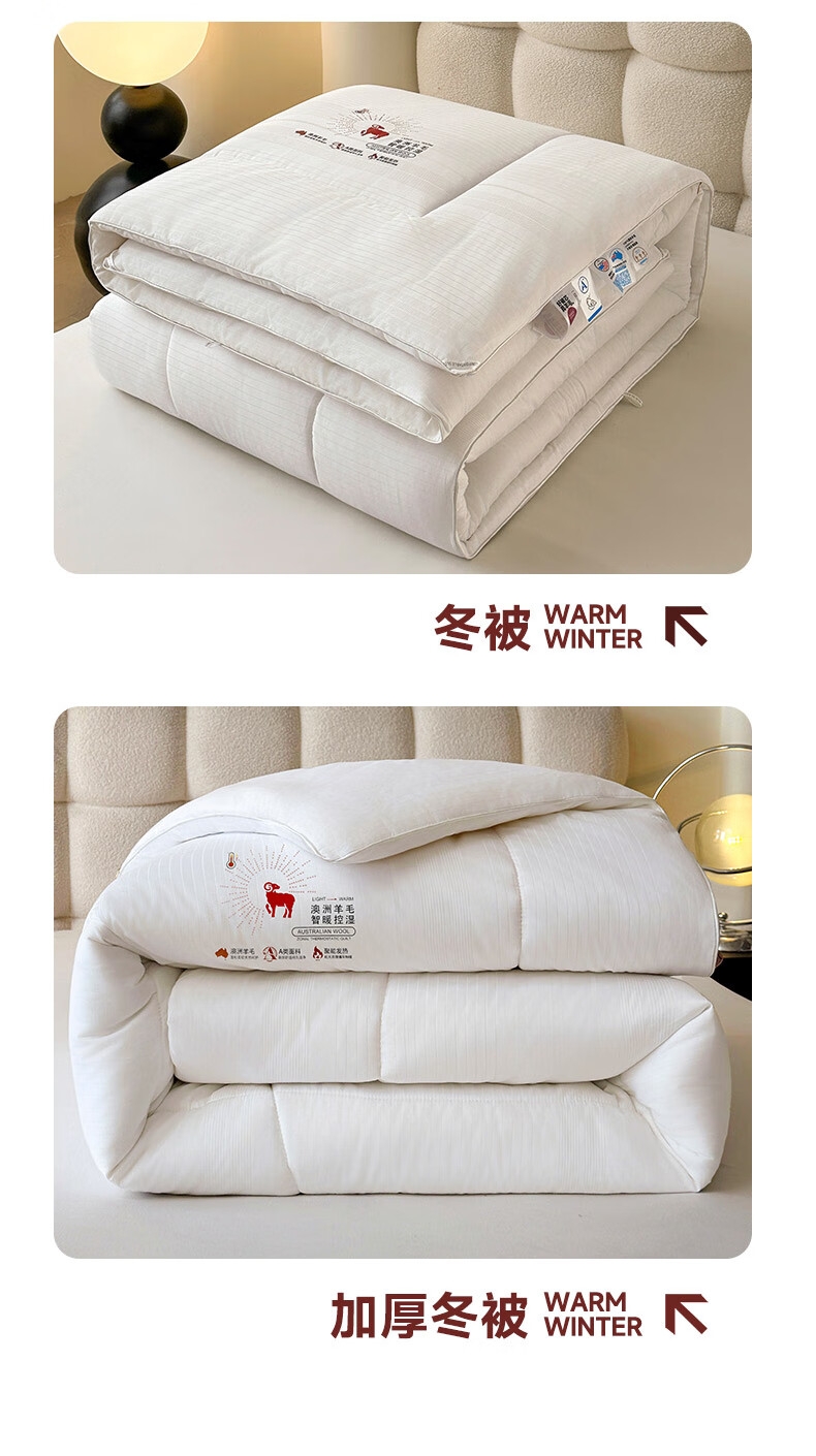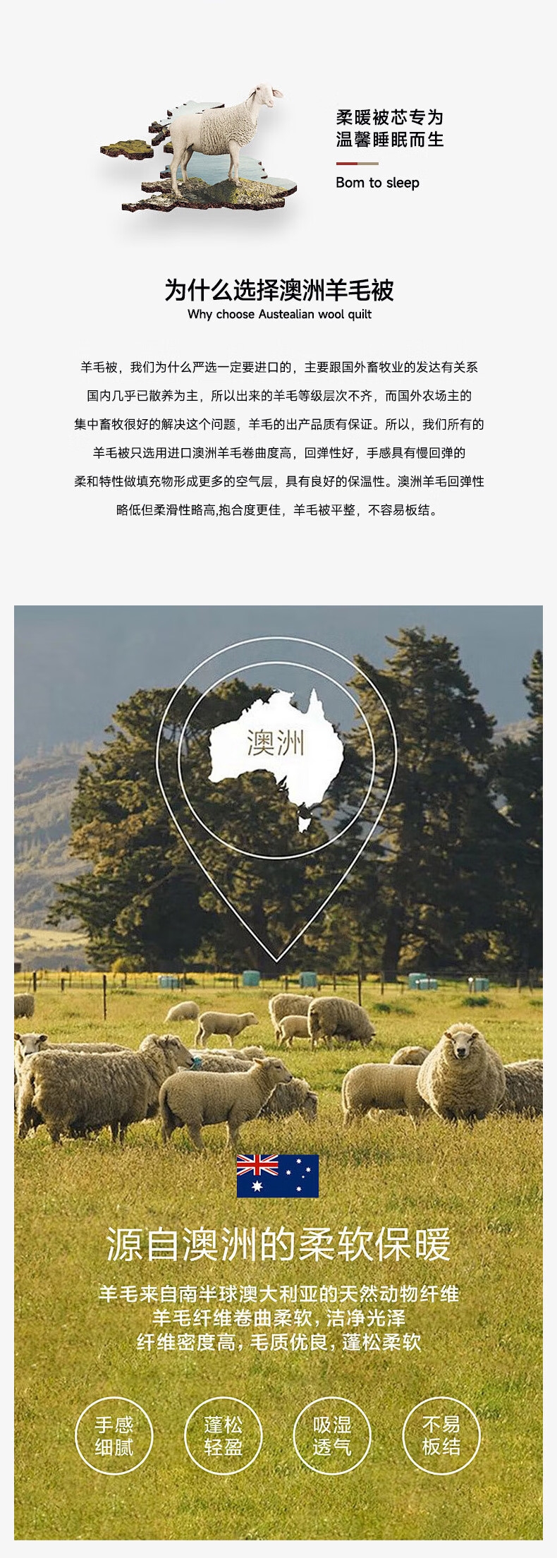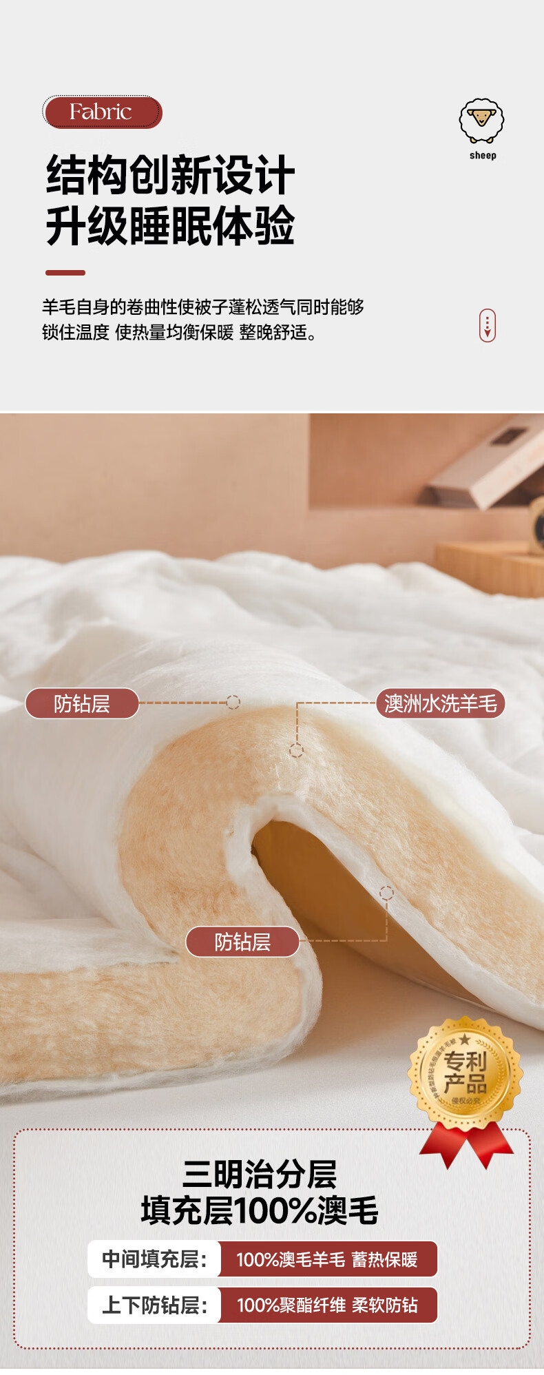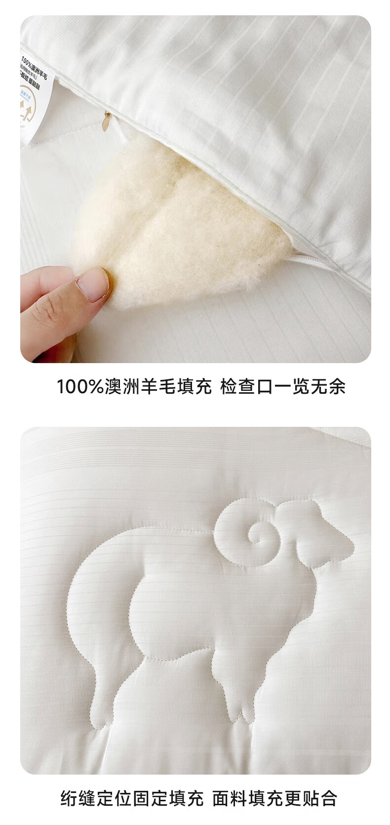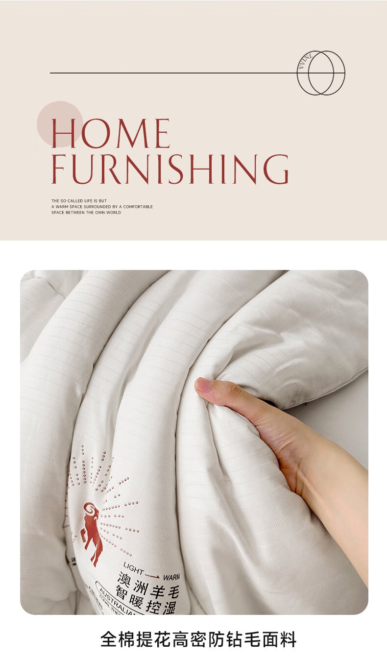 甄选高密纯棉防钻毛面料,A类品质,亲肤无添加剂;优选澳洲高品质水洗羊毛填充,蓄热保暖,整完舒适;三明治分层设计,升级睡眠体验,锁住温度,柔软防钻毛