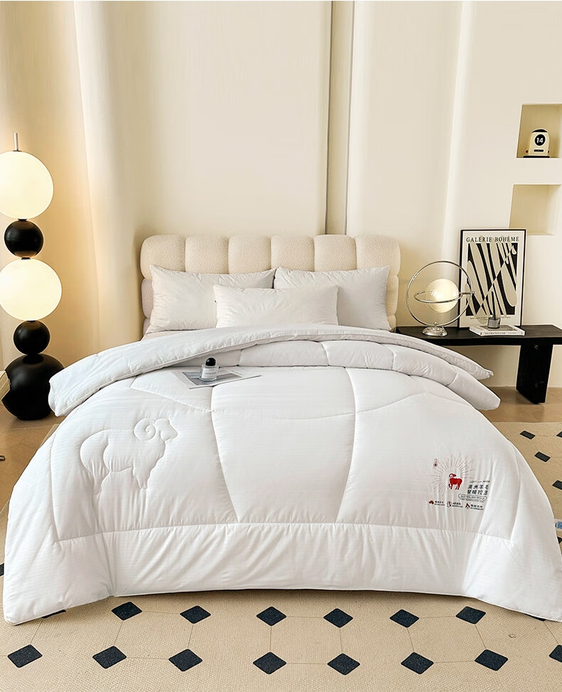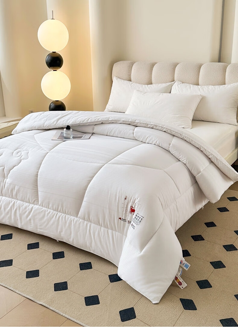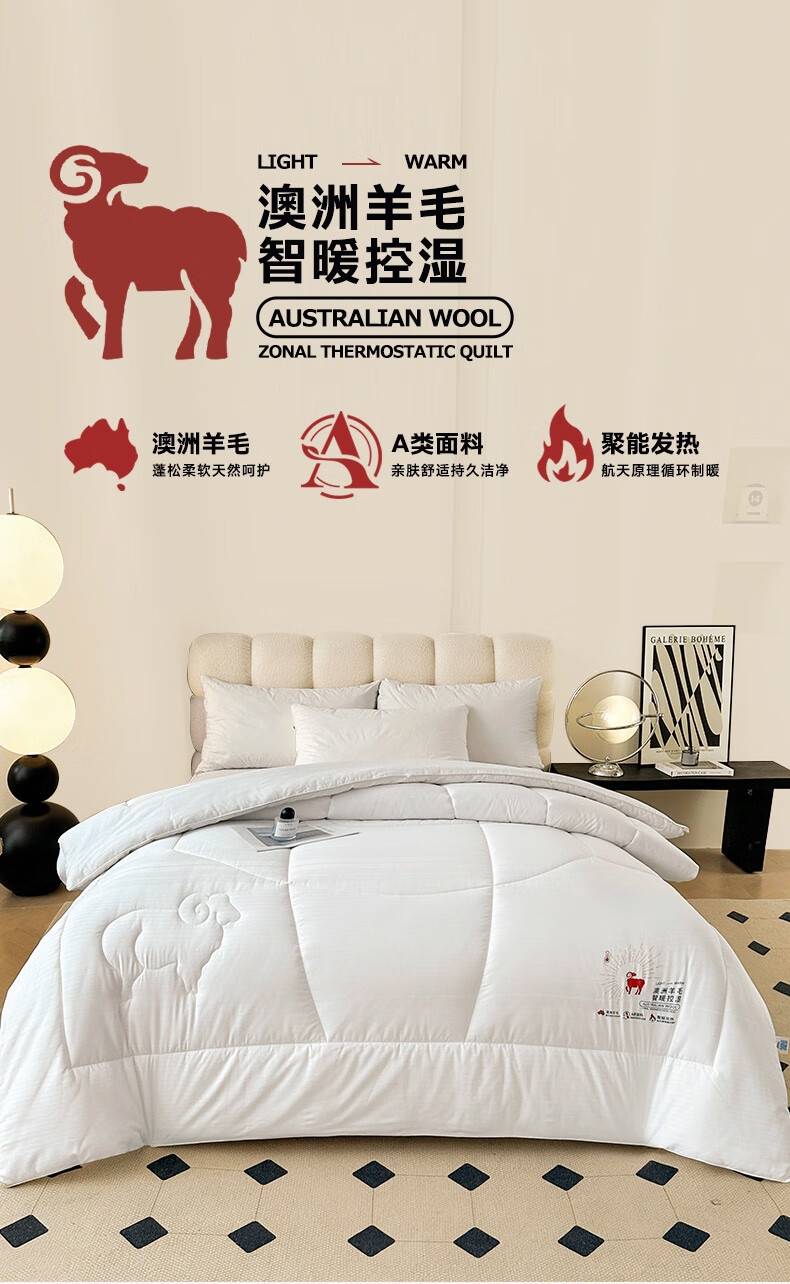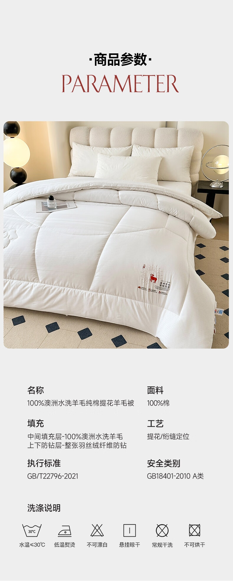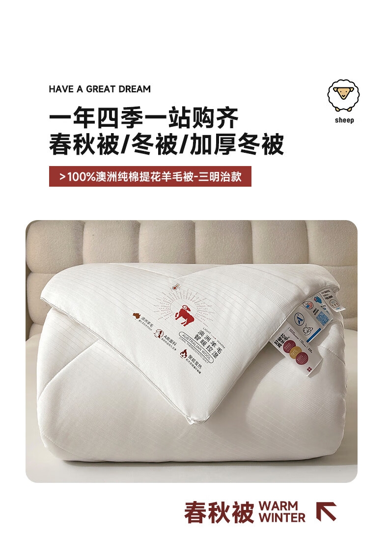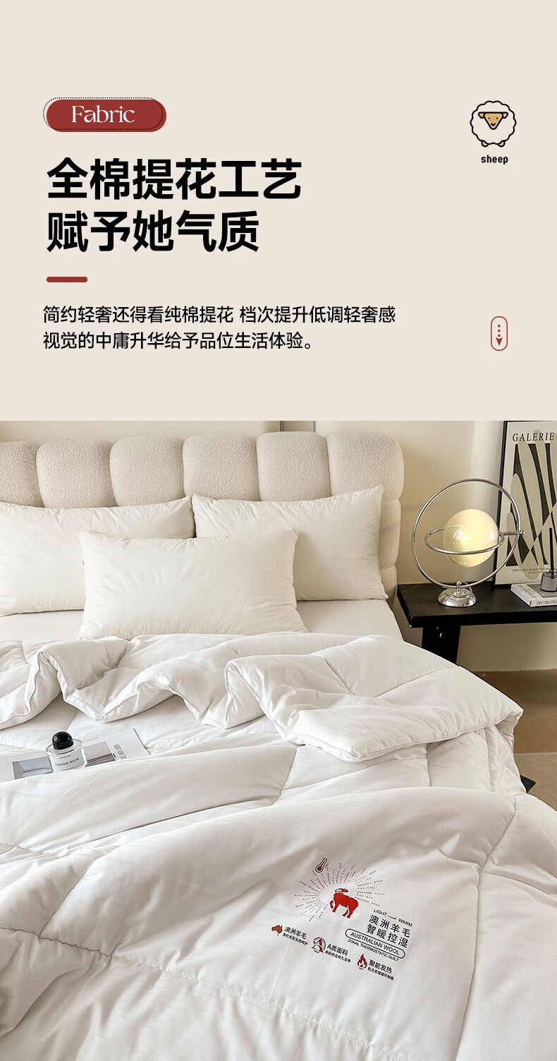甄选高密纯棉防钻毛面料,A类品质,亲肤无添加剂;优选澳洲高品质水洗羊毛填充,蓄热保暖,整完舒适;三明治分层设计,升级睡眠体验,锁住温度,柔软防钻毛