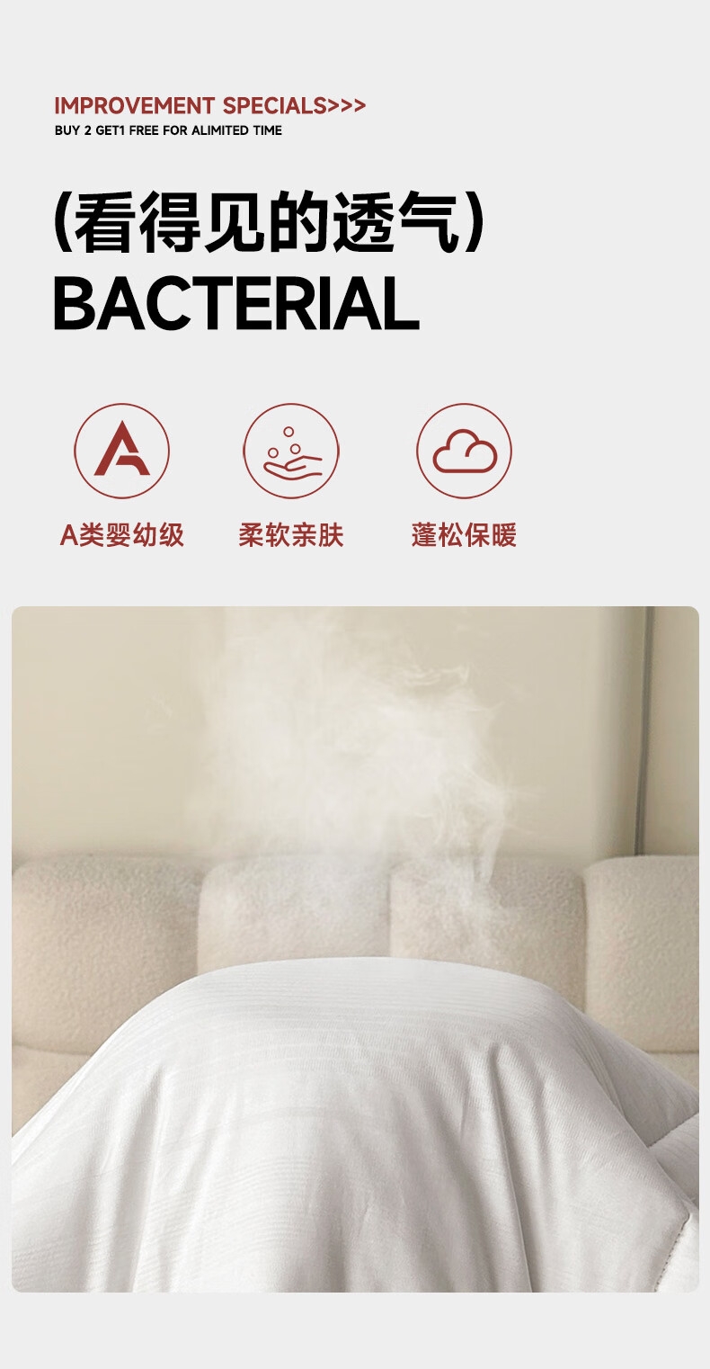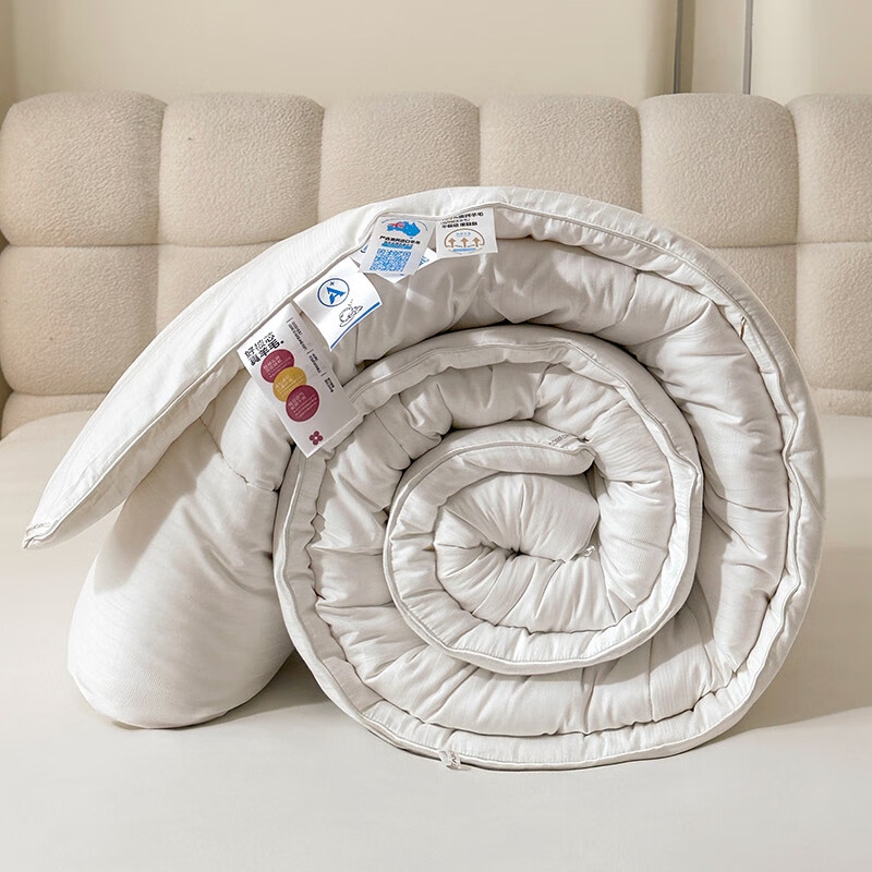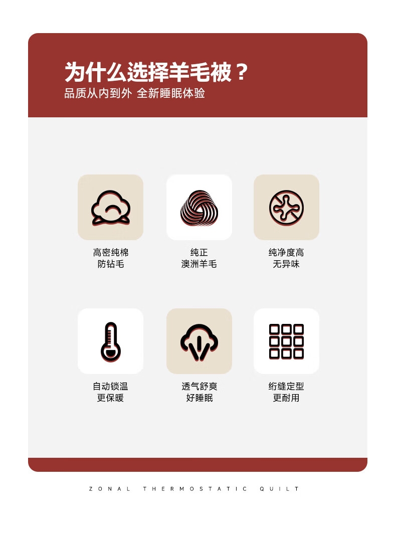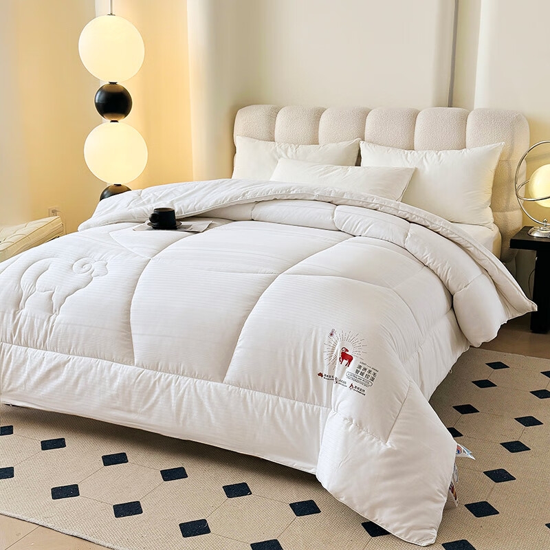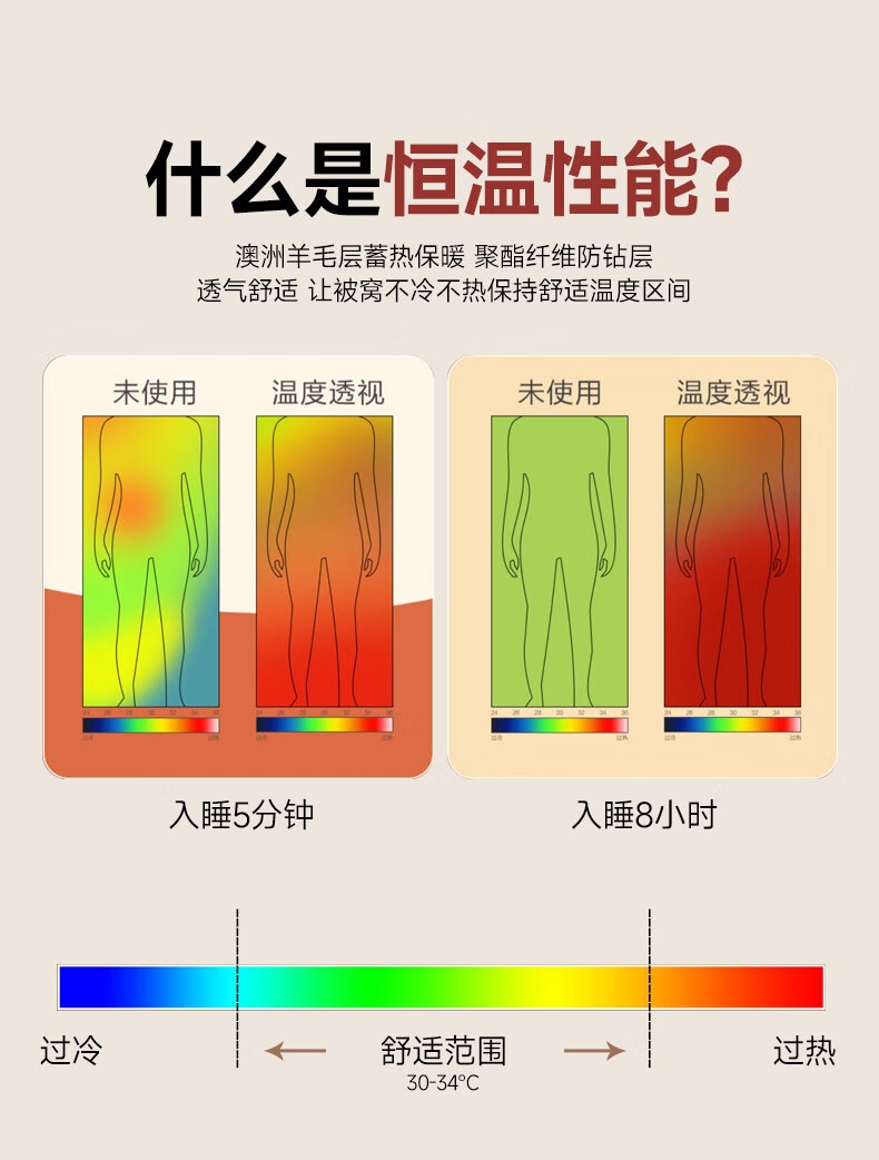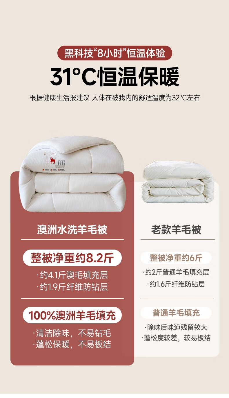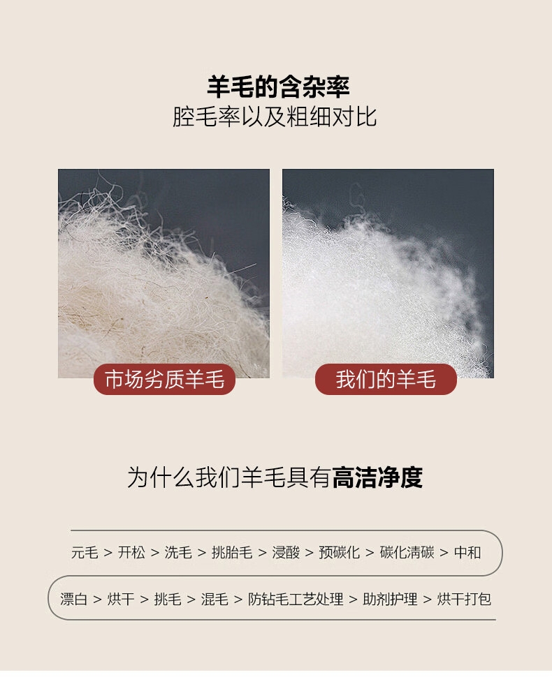 甄选高密纯棉防钻毛面料,A类品质,亲肤无添加剂;优选澳洲高品质水洗羊毛填充,蓄热保暖,整完舒适;三明治分层设计,升级睡眠体验,锁住温度,柔软防钻毛