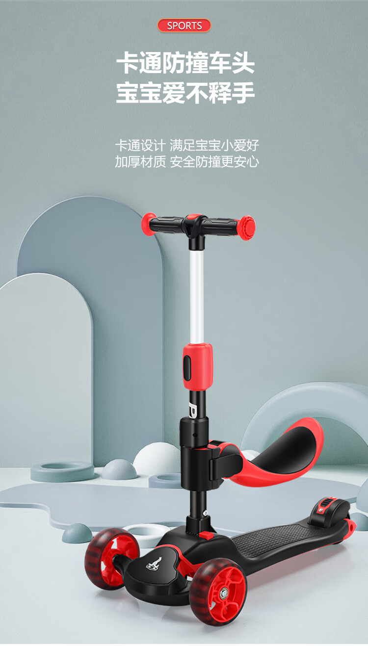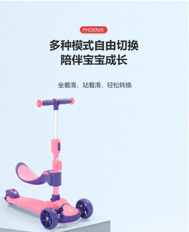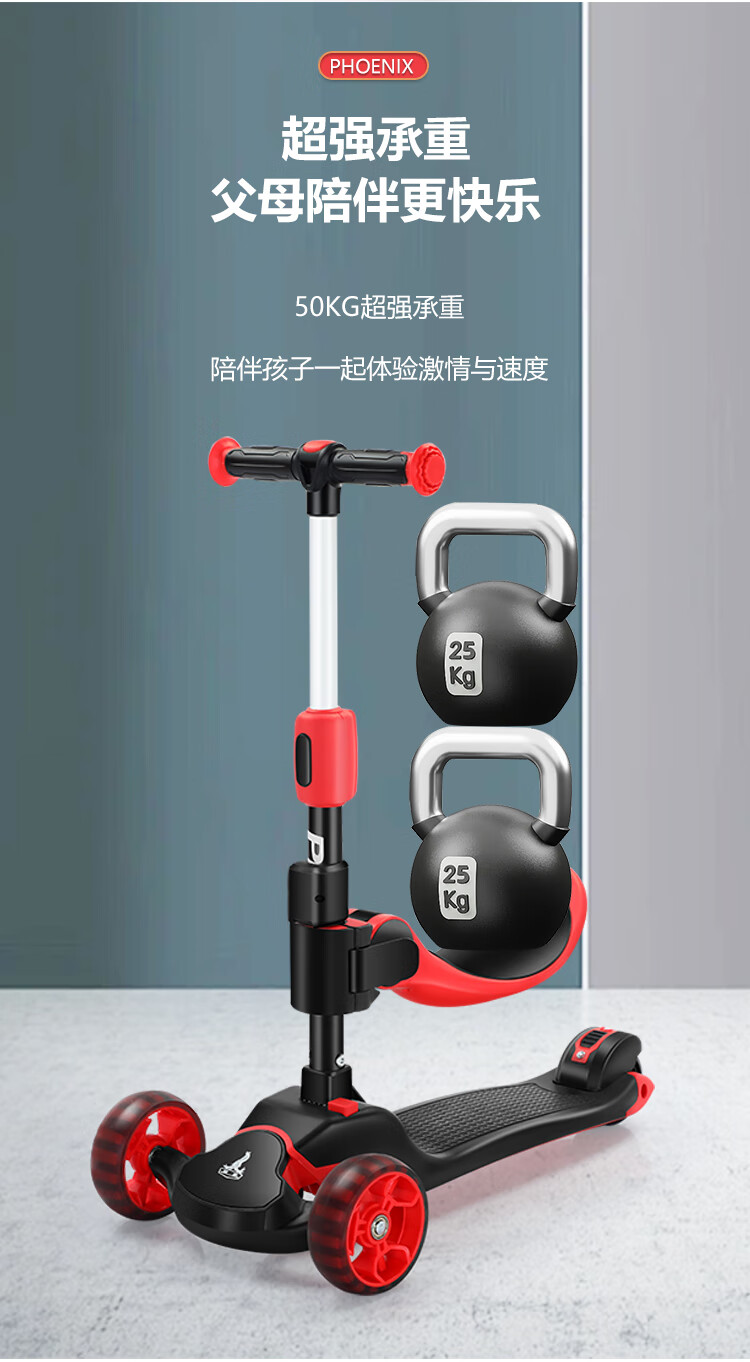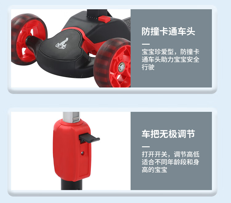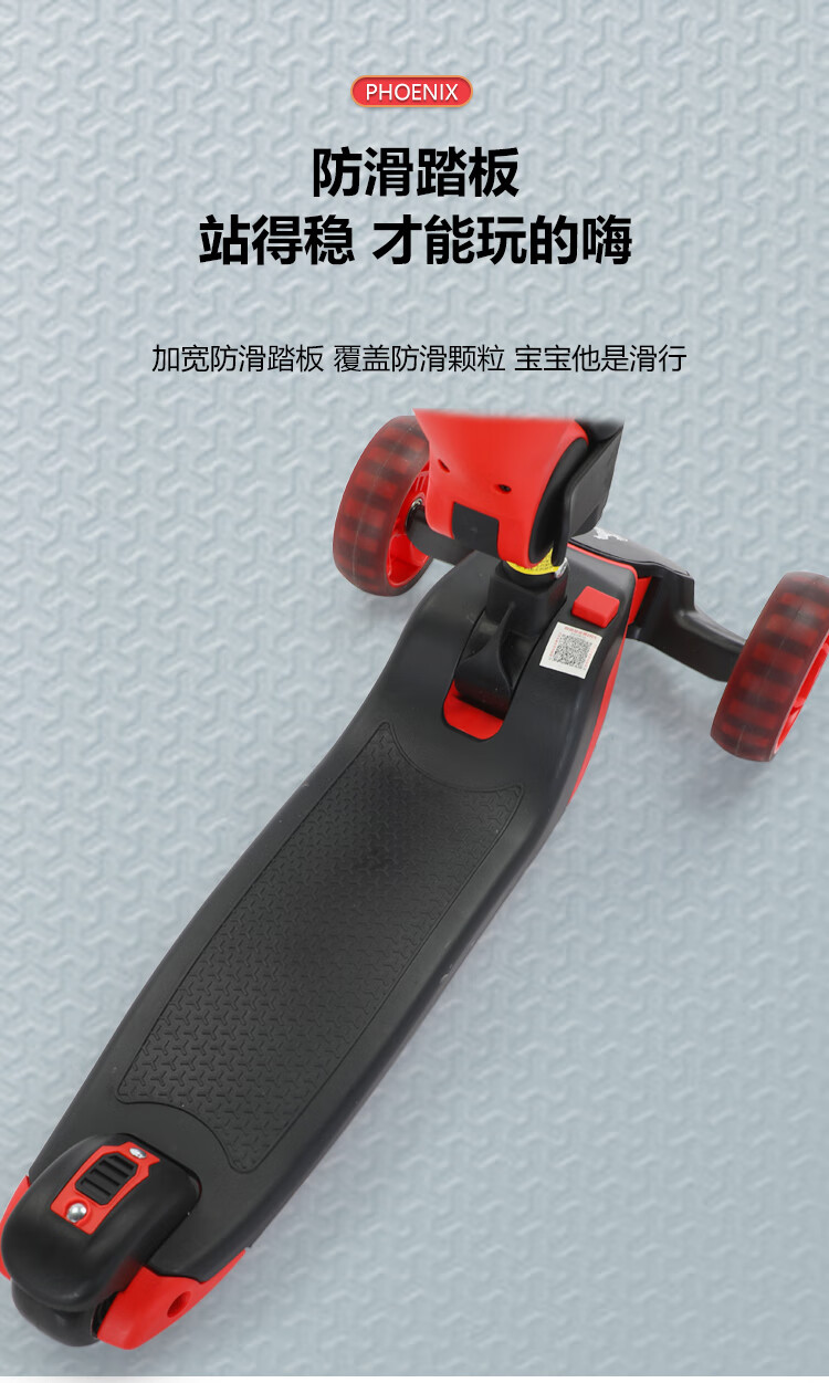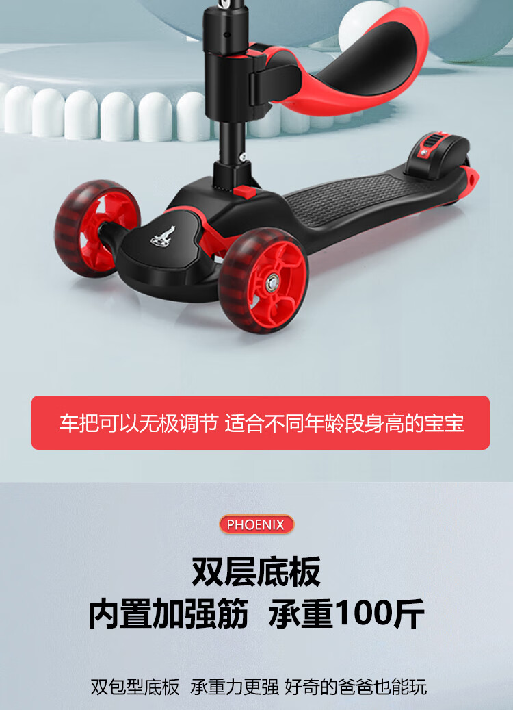 高承重,用得久,可以从小玩到大的滑板车;防抱死点刹系统赛车级品质;无需充电,一滑即亮,速度越快灯光越亮
