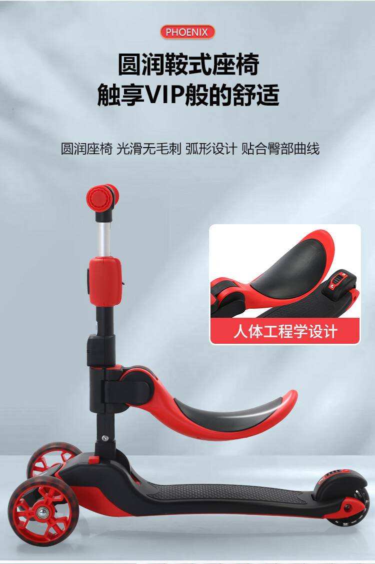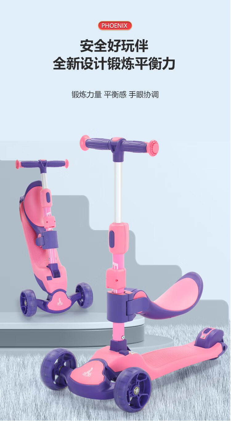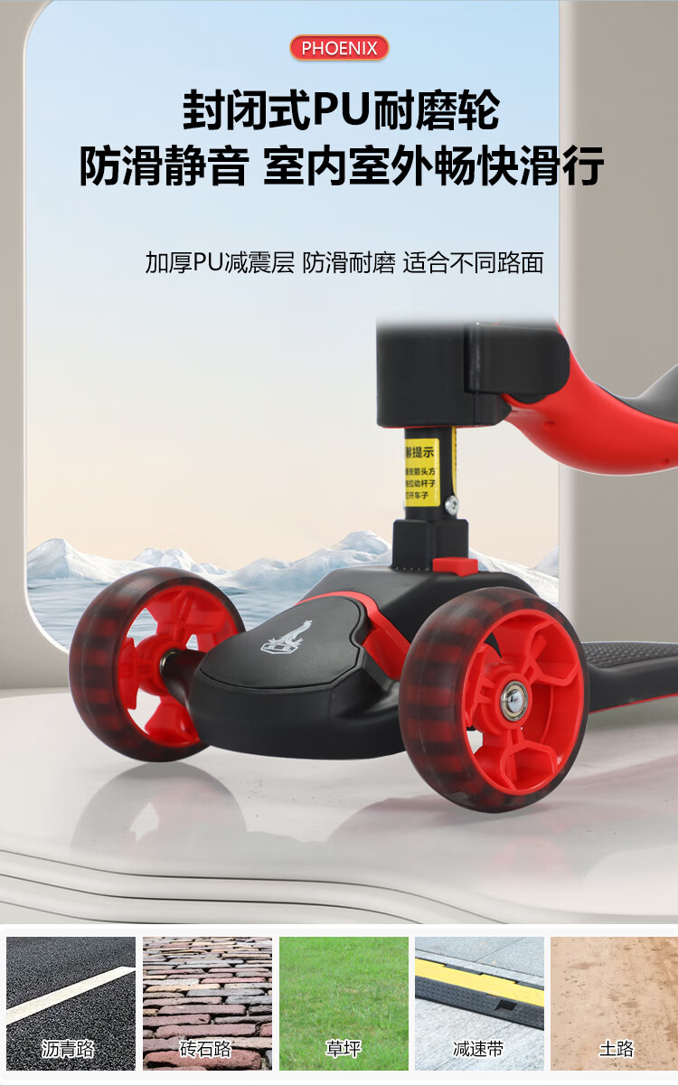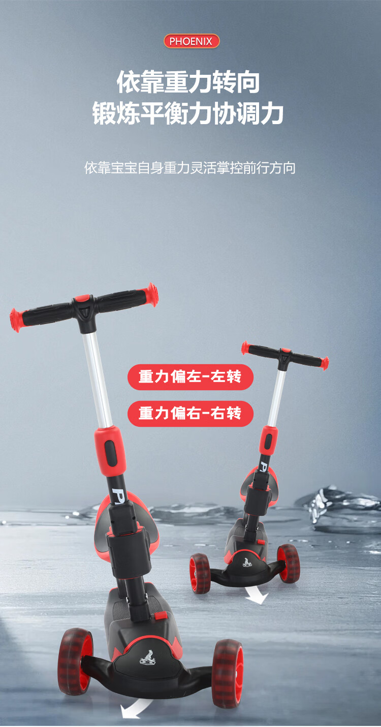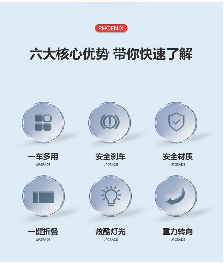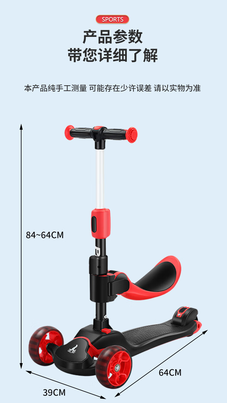 高承重,用得久,可以从小玩到大的滑板车;防抱死点刹系统赛车级品质;无需充电,一滑即亮,速度越快灯光越亮