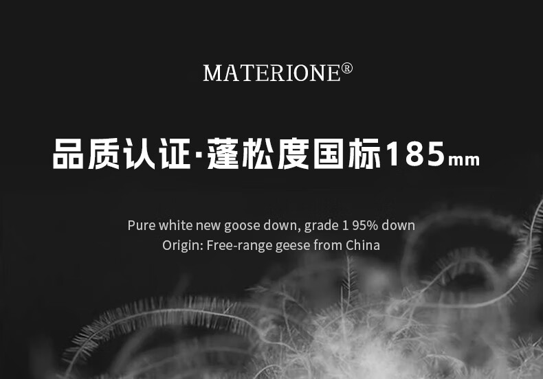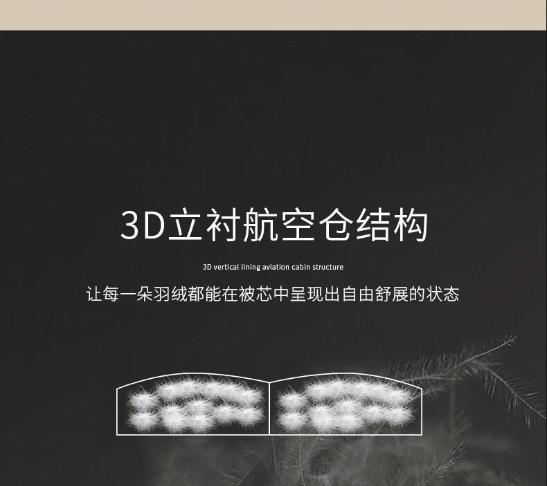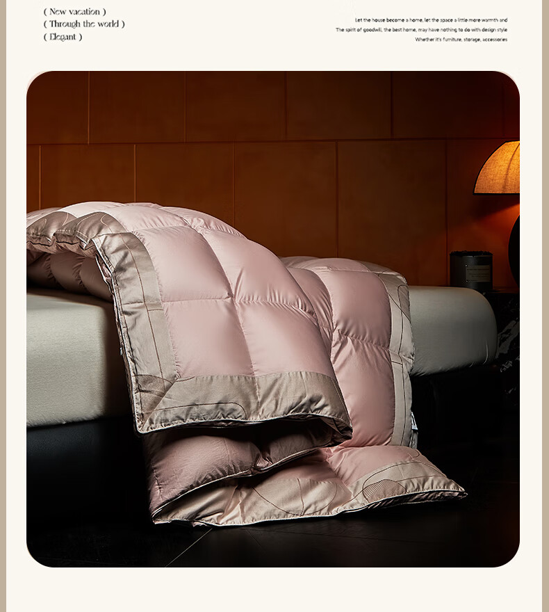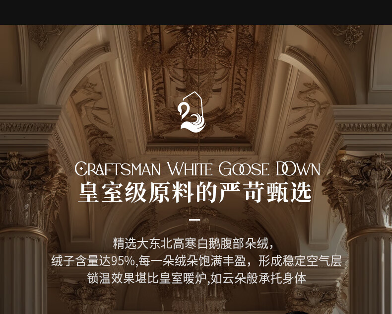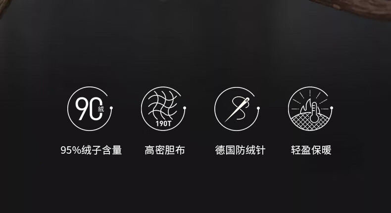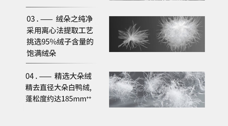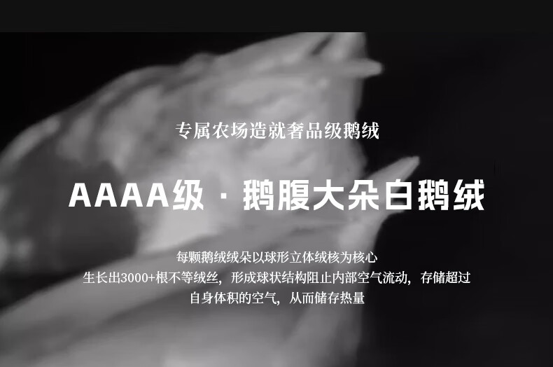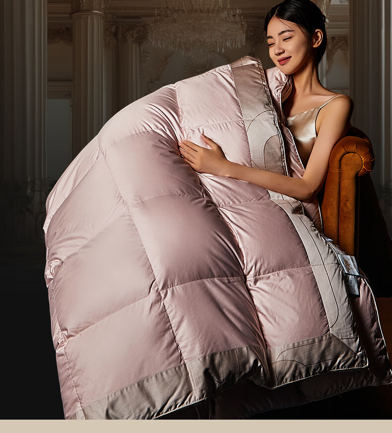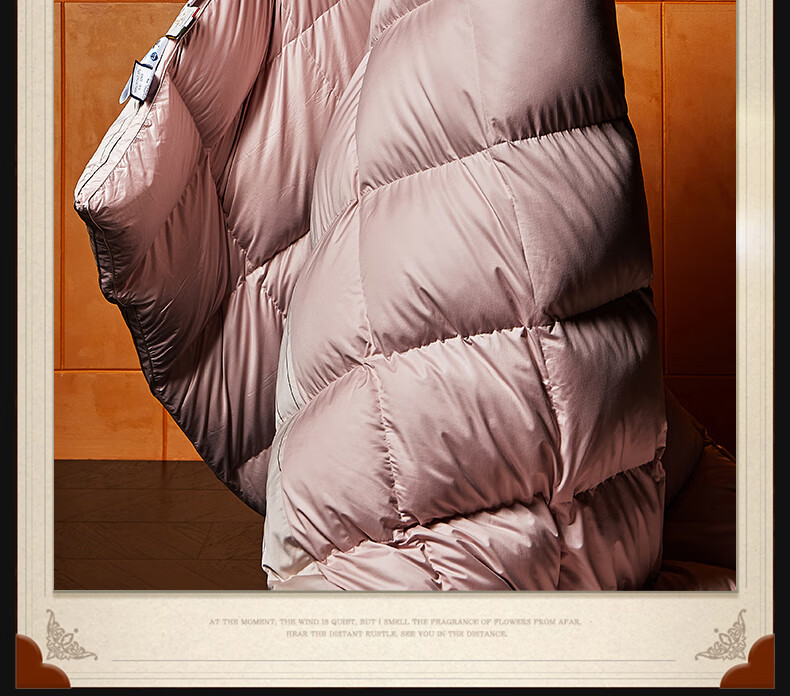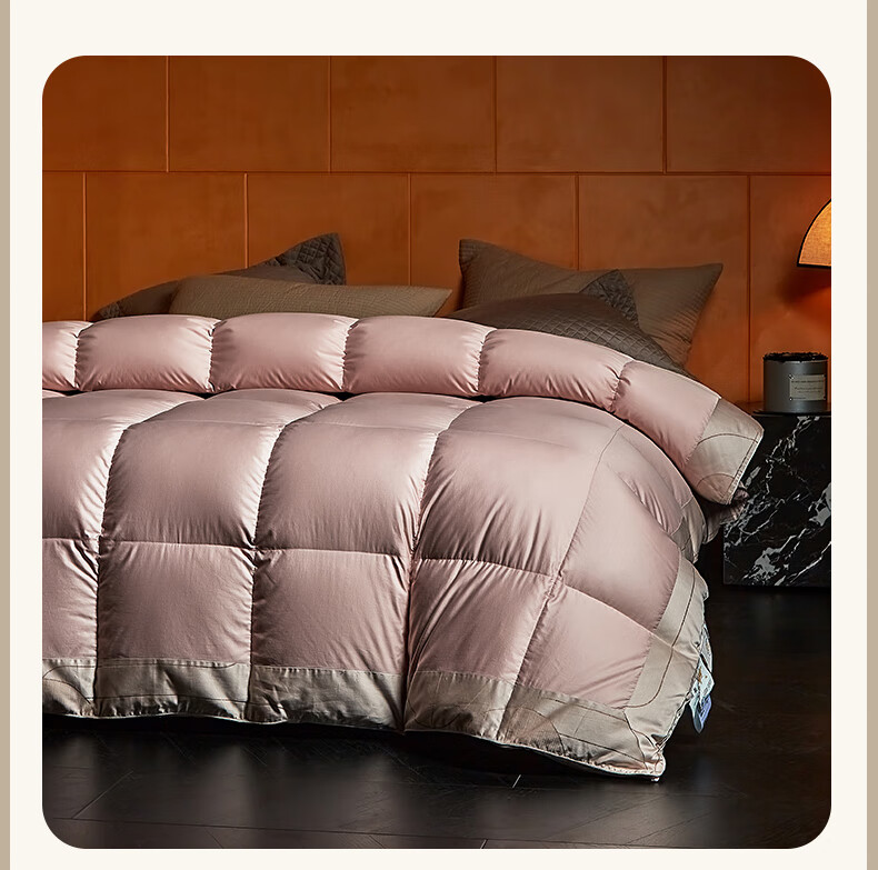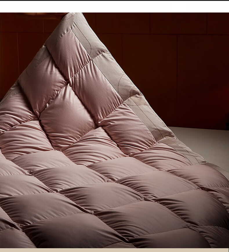 面料采用高档棉莫混纺织造工艺,面料光亮,柔软舒适;严选95白鹅绒填充,绒丝纤长、绒核饱满,蓬松度高;3D立衬航空仓设计,让每朵羽绒都能在被芯中自由舒展