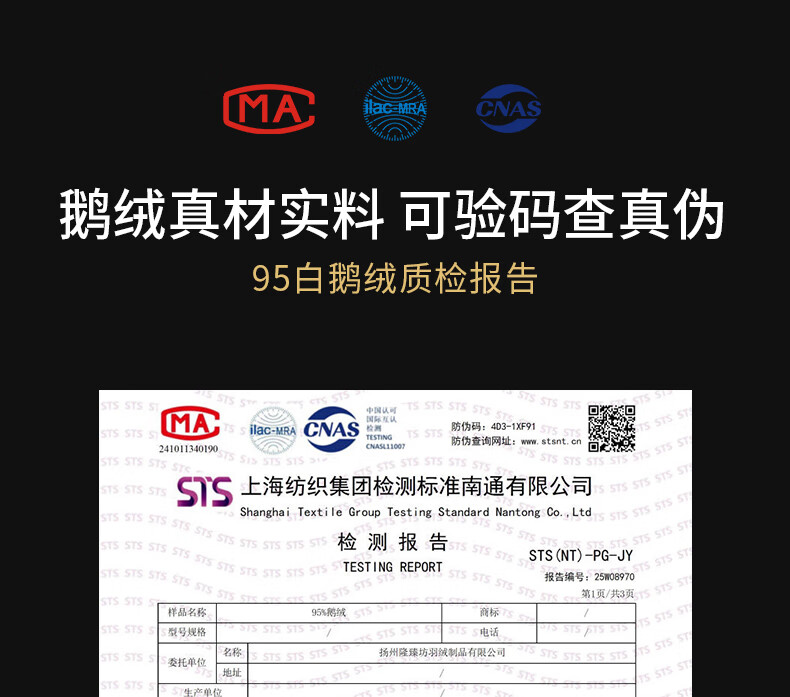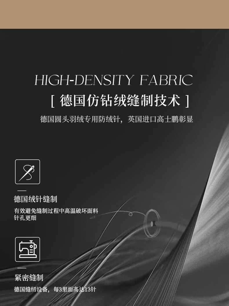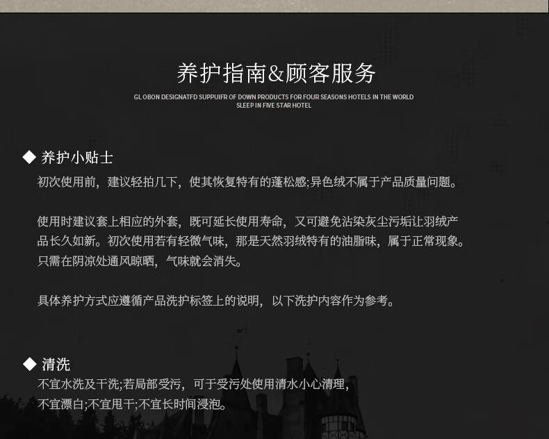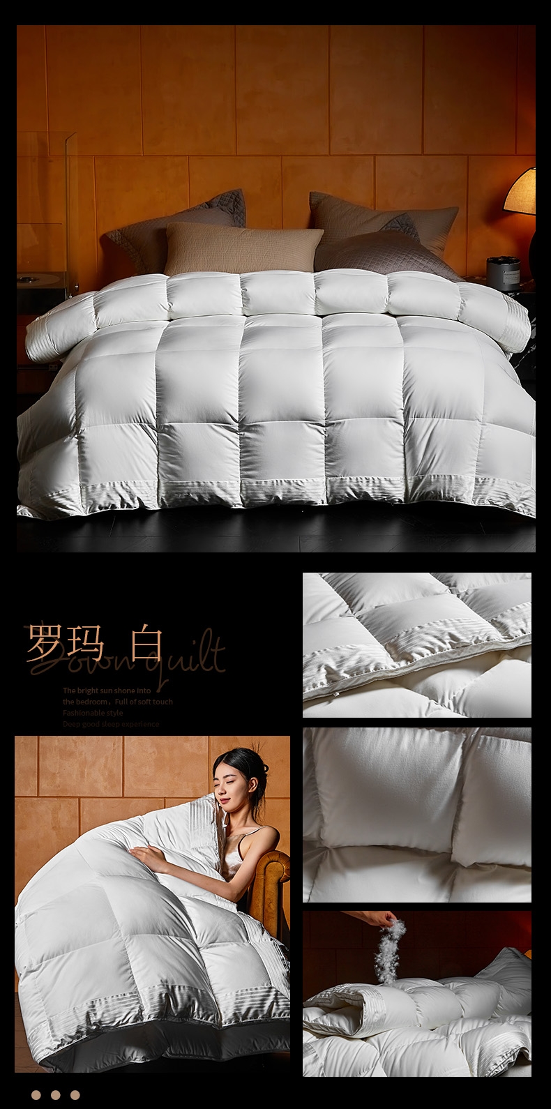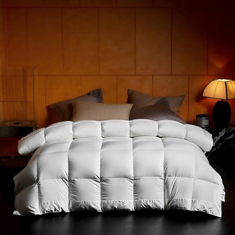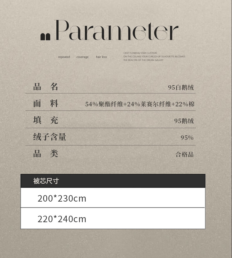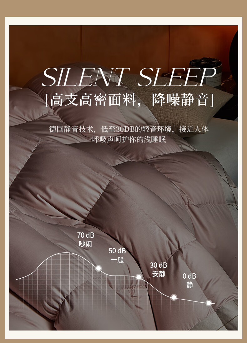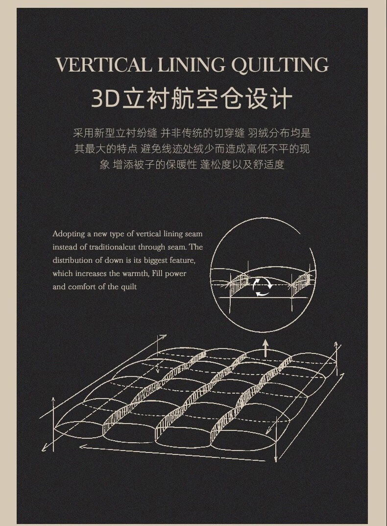 面料采用高档棉莫混纺织造工艺,面料光亮,柔软舒适;严选95白鹅绒填充,绒丝纤长、绒核饱满,蓬松度高;3D立衬航空仓设计,让每朵羽绒都能在被芯中自由舒展