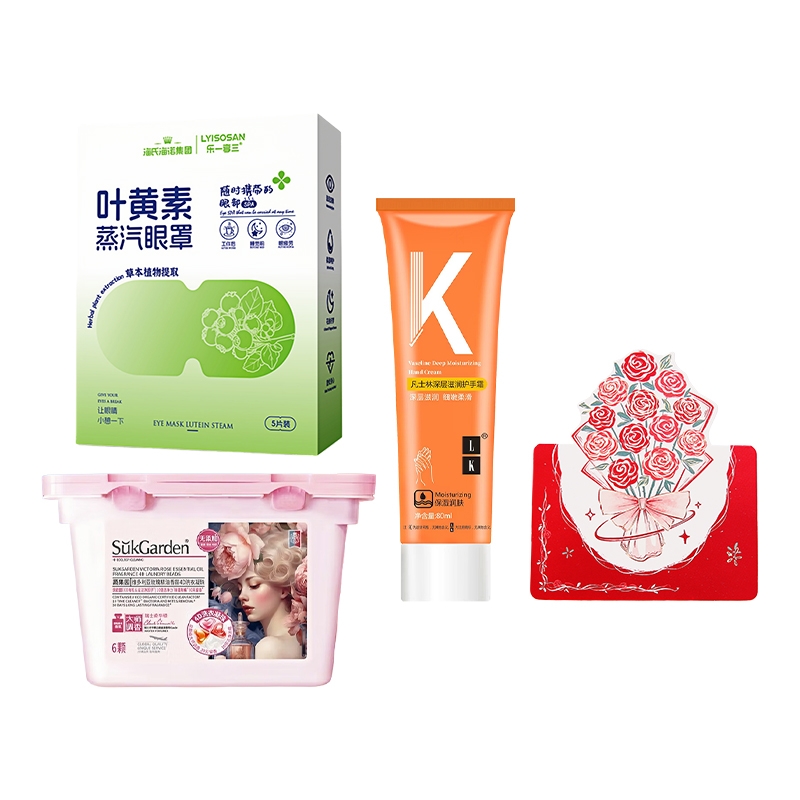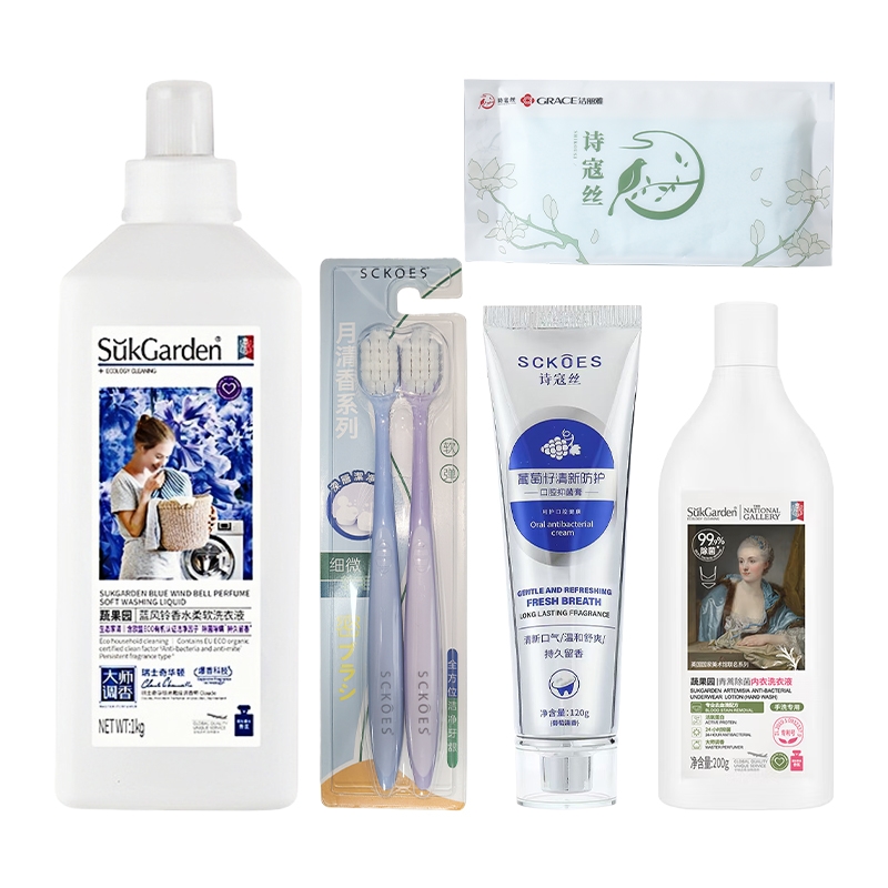 配置清单:1. 柏缇氨基酸丰盈蓬松洗发露200ml 2. 柏缇氨基酸海盐净澈沐浴液200ml 3. 滋源无患子控油清爽护发素265ml 4. SukGarden蔬果园玫瑰精油香氛4D洗衣凝珠10g*6颗 5. SukGarden蔬果园蓝风铃香水柔软洗衣液1050g 6. SukGarden蔬果园青蒿除菌内衣洗衣液200g 7. Sckoes诗寇丝细毛牙刷双支装 8. Sckoes诗寇丝葡萄籽清新防护牙膏120g 9. 洁丽雅&诗寇丝臻品长绒棉毛巾(颜色随机)70g 10. LK 凡士林深层滋润护手霜 80g 11. 海氏海诺叶黄素蒸汽眼罩5片装 12. 立体玫瑰花贺卡(赠) 13. 全球臻选行李箱-ZYXLX001