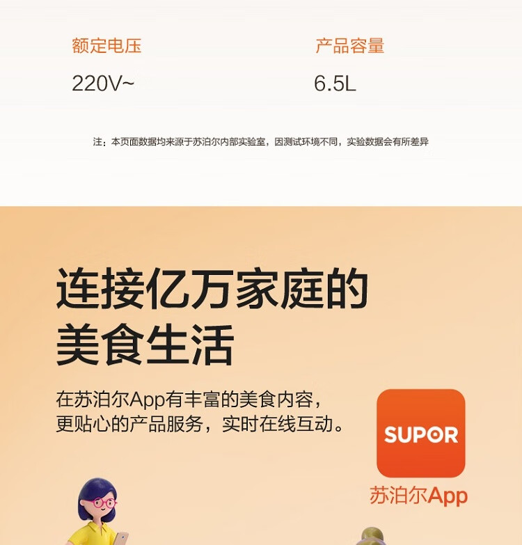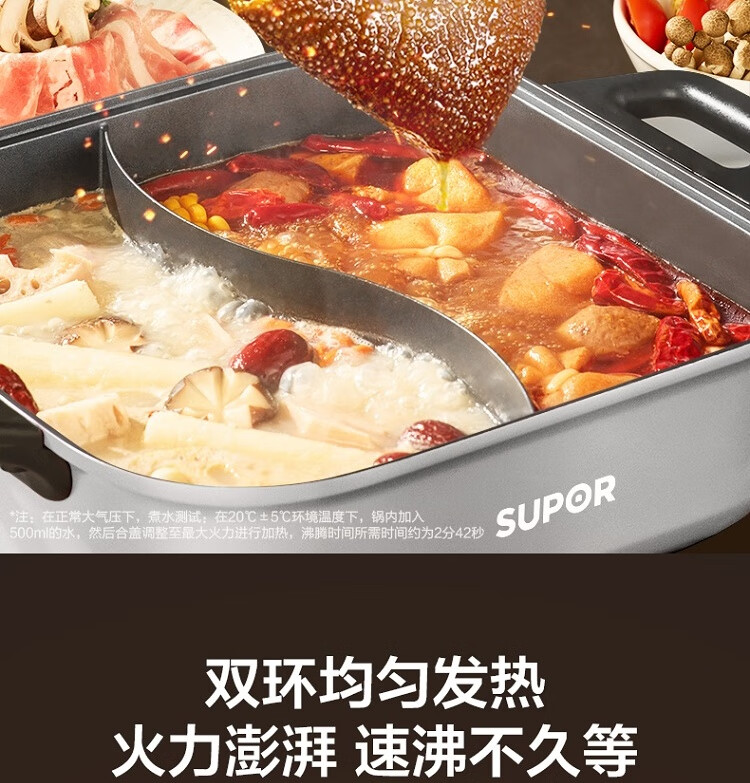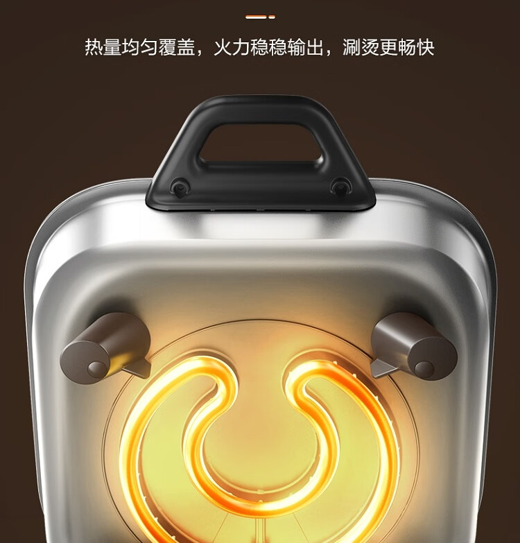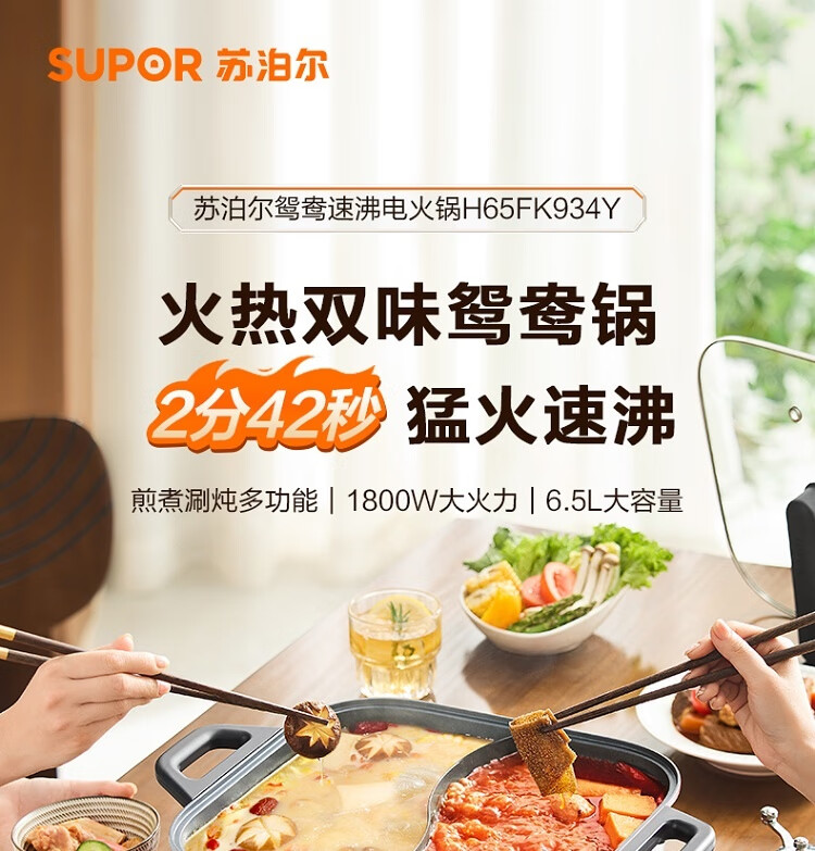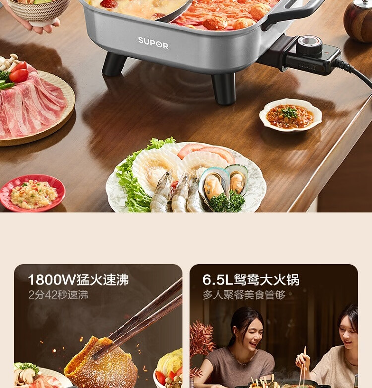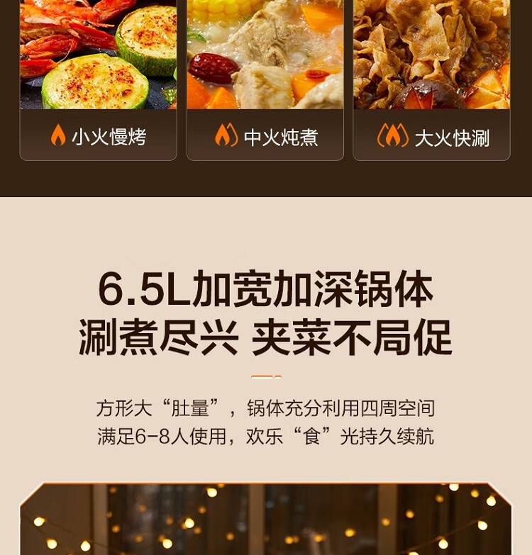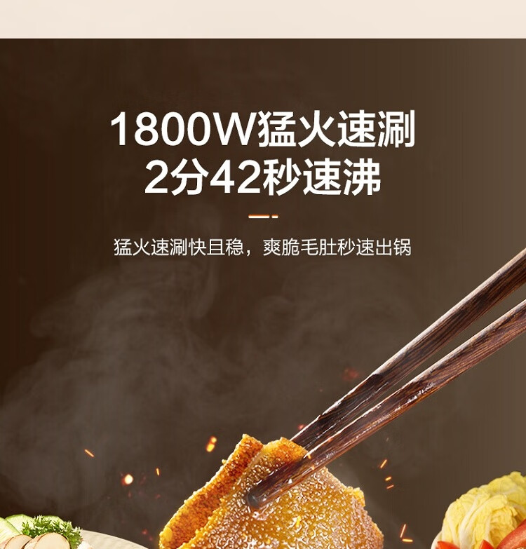 6.5L 大容量,嗨聚无障碍;1800W 猛火速涮 2 分 42 秒速沸;双环均匀发热 速沸不久等